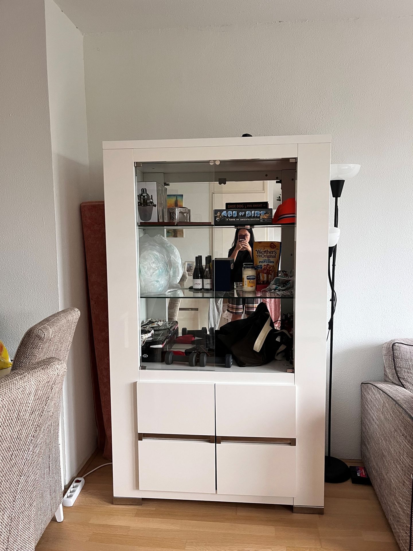 Entree/hal met toilet, woonkamer met een open keuken met losse apparatuur w. o. een koelkast en vaatwasser.