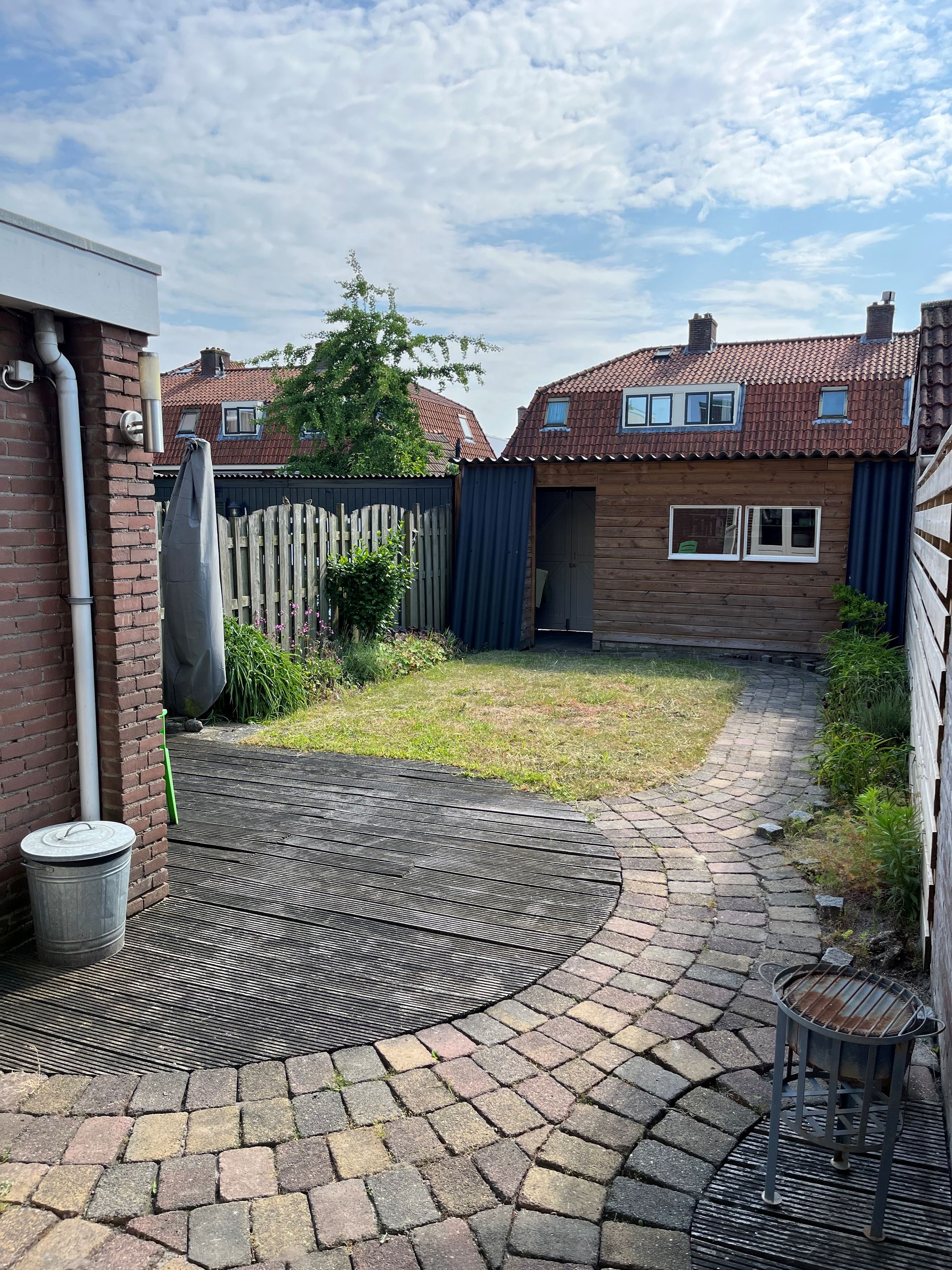 Vanuit de keuken is de achtertuin te bereiken met daarin een royale tuinberging en achterom.