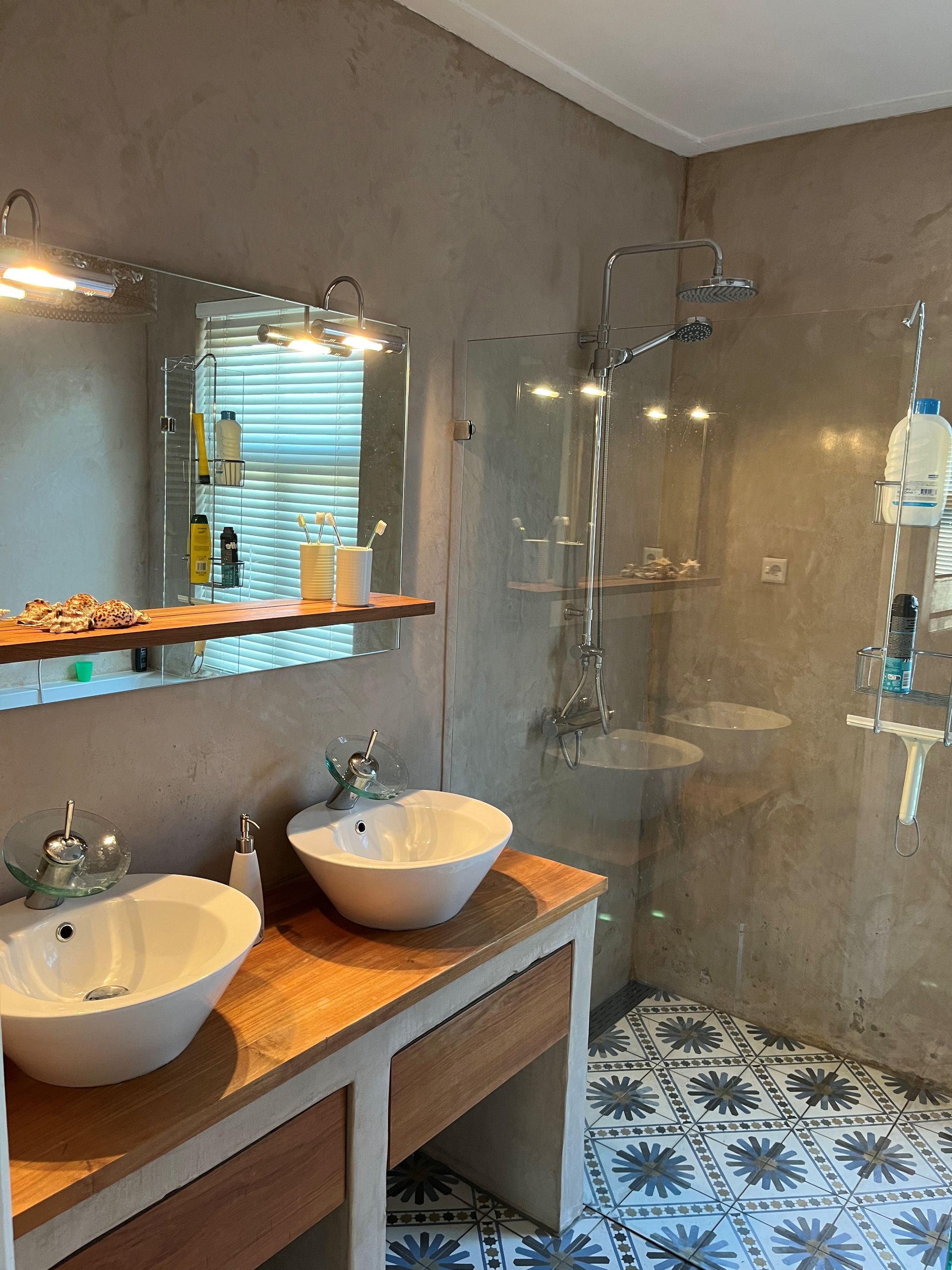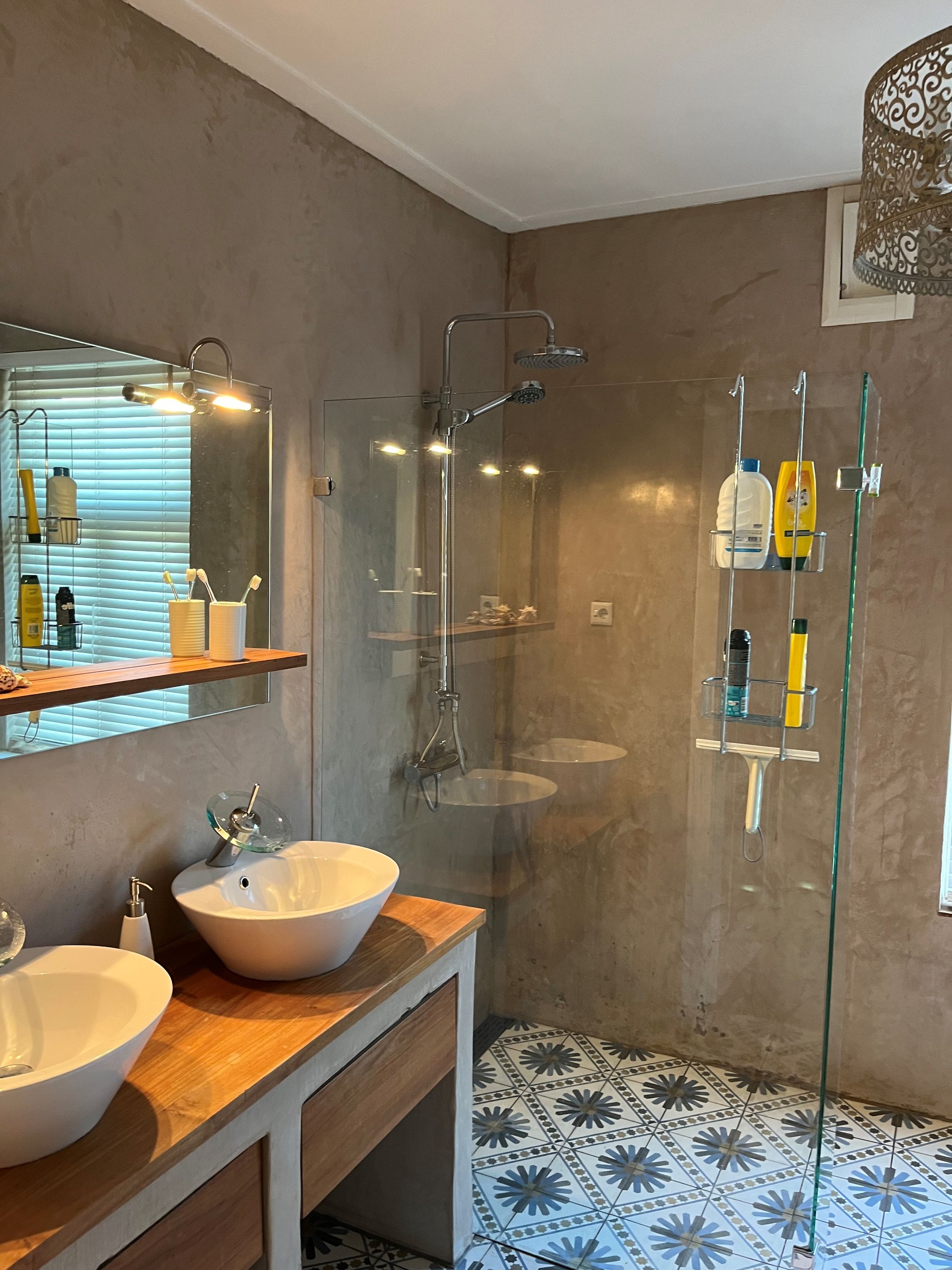 Royale overloop met praktische kastenwand, drie slaapkamers en een luxe badkamer met moderne wastafelmeubel met twee wastafels, ligbad en separate douchecabine met glazen deur