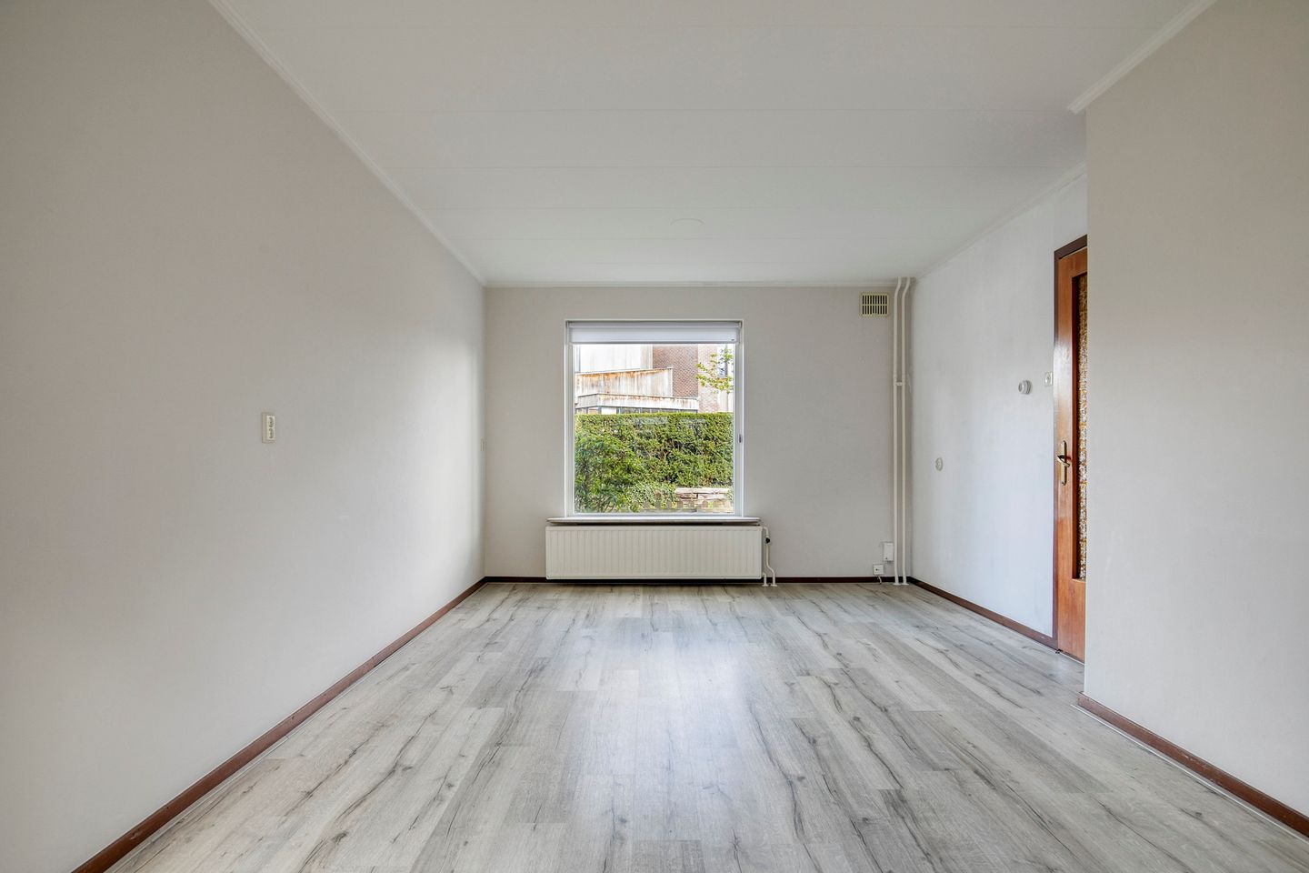 De lichte woonkamer, afgewerkt met een nette laminaatvloer, voelt direct prettig aan.