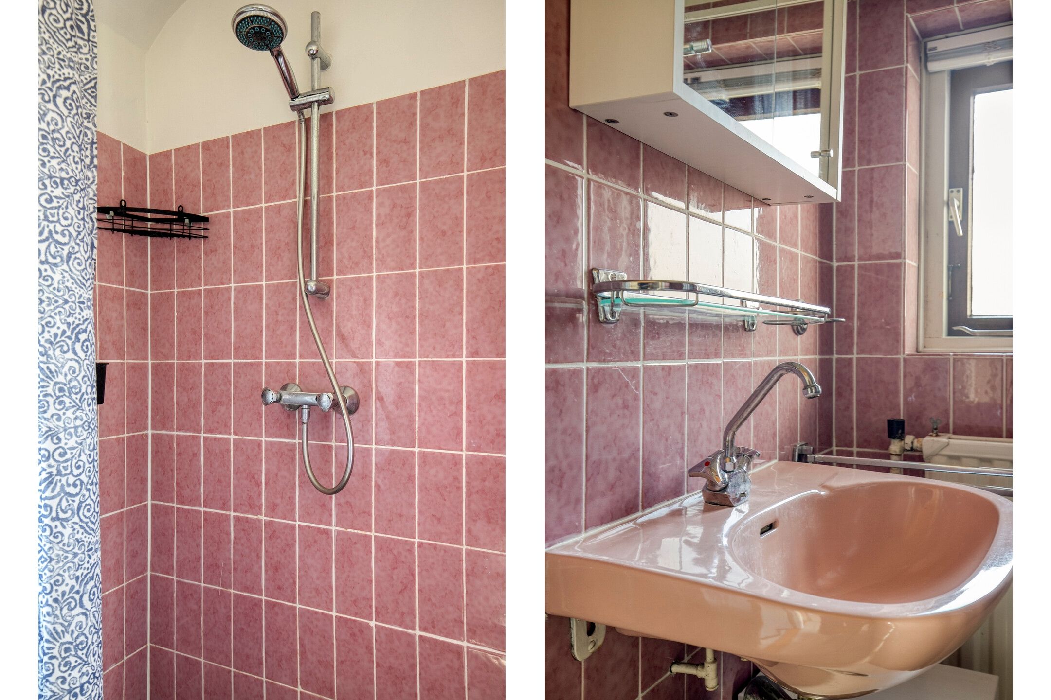 De compacte badkamer beschikt over een inloopdouche en wastafel.