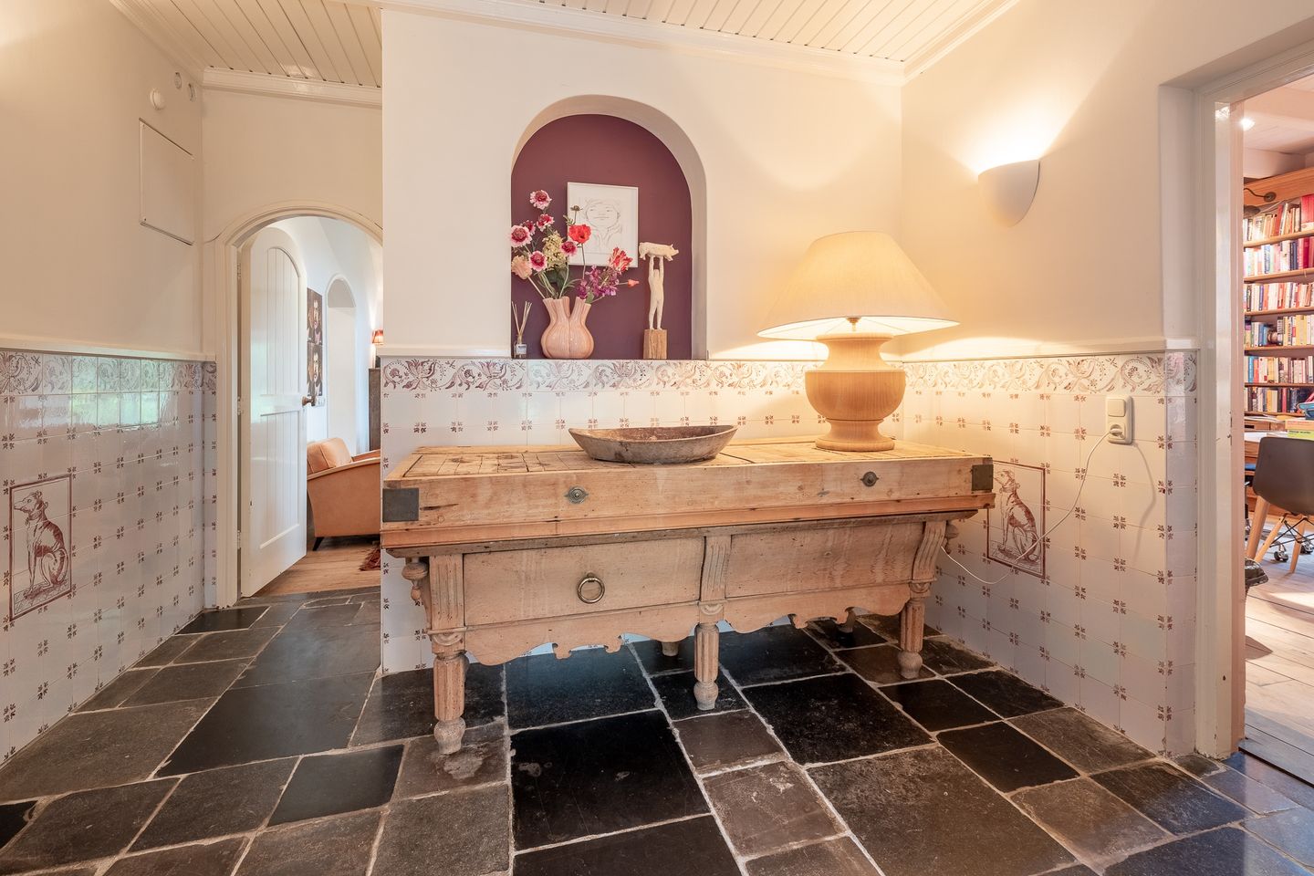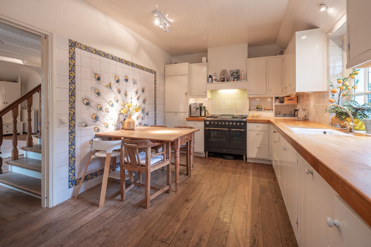 Via de stenen poort met prachtige binnentuin en daarachter een speelweide ligt de hoofdentree. Deze is voorzien van mooie stenen vloer en aan linkerzijde toegang naar de bibliotheek met houten vloer. De boerderij heeft ook een achteringang met hal en toegang naar de eetkamer met aansluitend de woonkeuken met groot gasfornuis, doorloop naar multifunctionele tussenkamer met openslaande deuren naar tuin en doorloop naar de sfeervolle woon-/zitkamer met brede openhaard kachel.