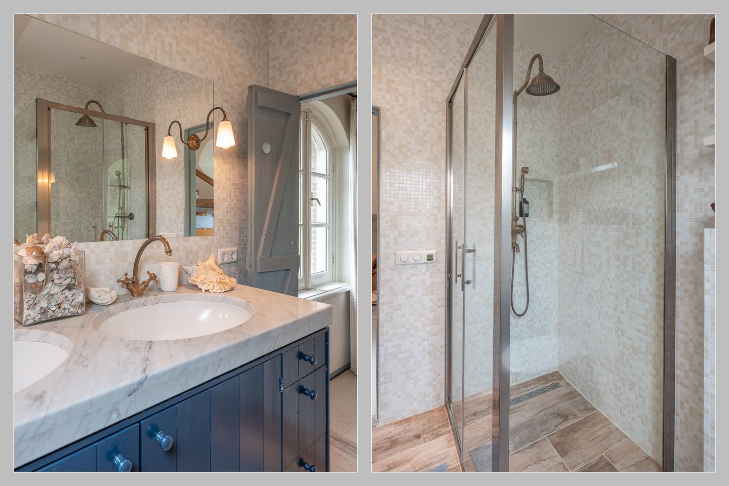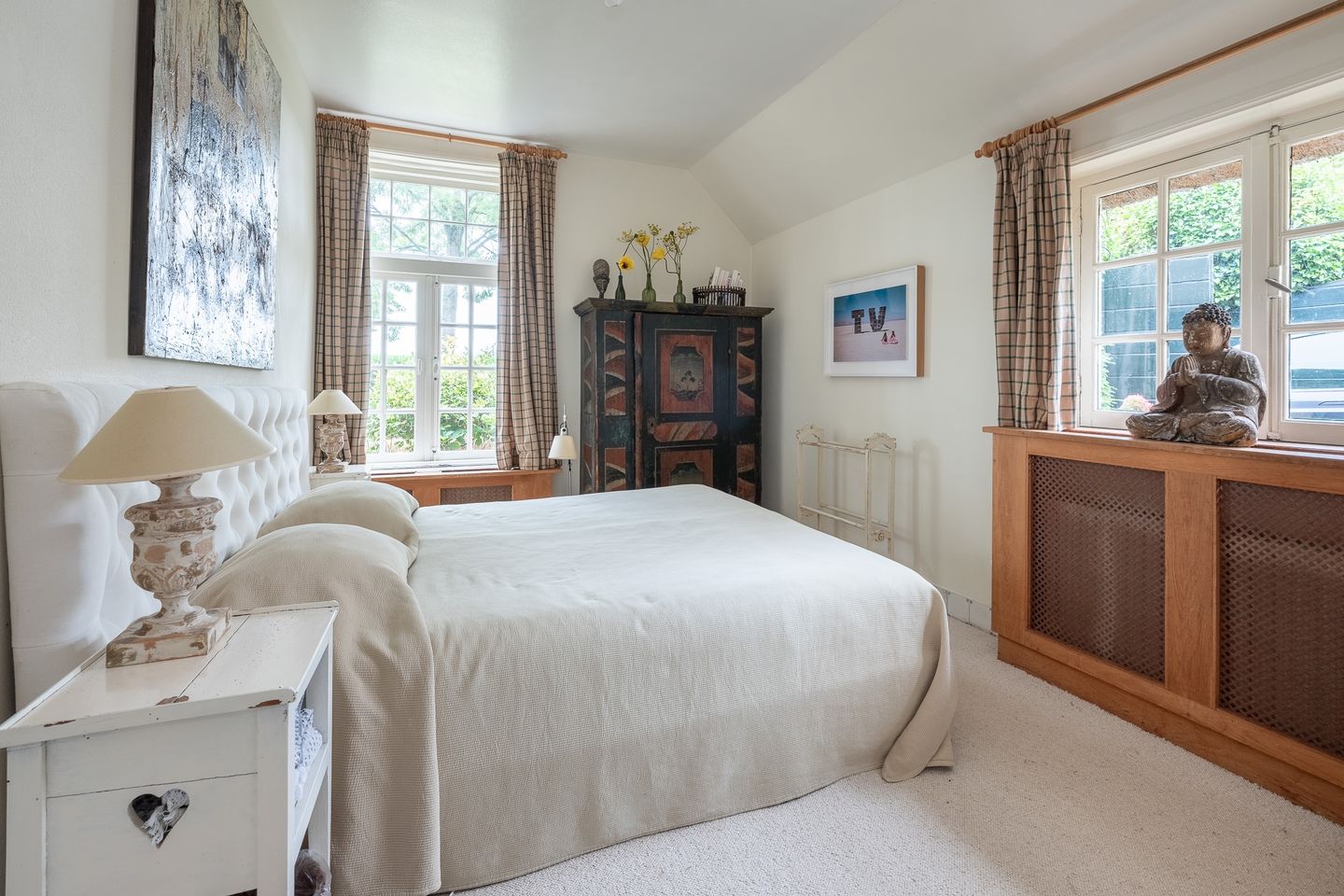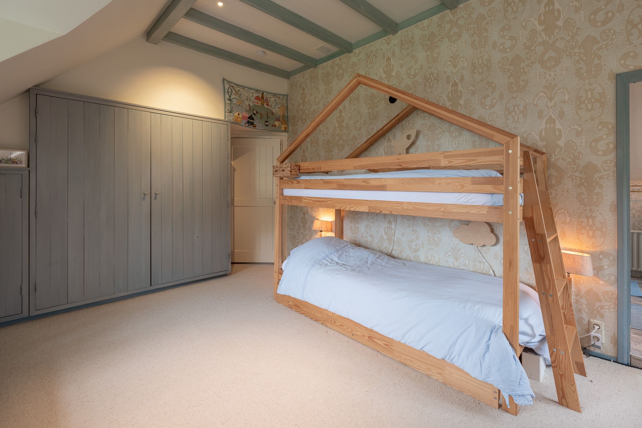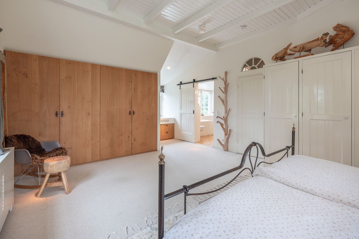 In de tussenkamer bevindt zich een robuuste houten trap naar de verdieping met drie slaapkamers, waarvan twee met eigen badkamer(een met ligbad) en toilet. In totaal heeft de boerderij 4 slaapkamers en drie badkamers. De hoofdslaapkamer biedt veel kastruimte.