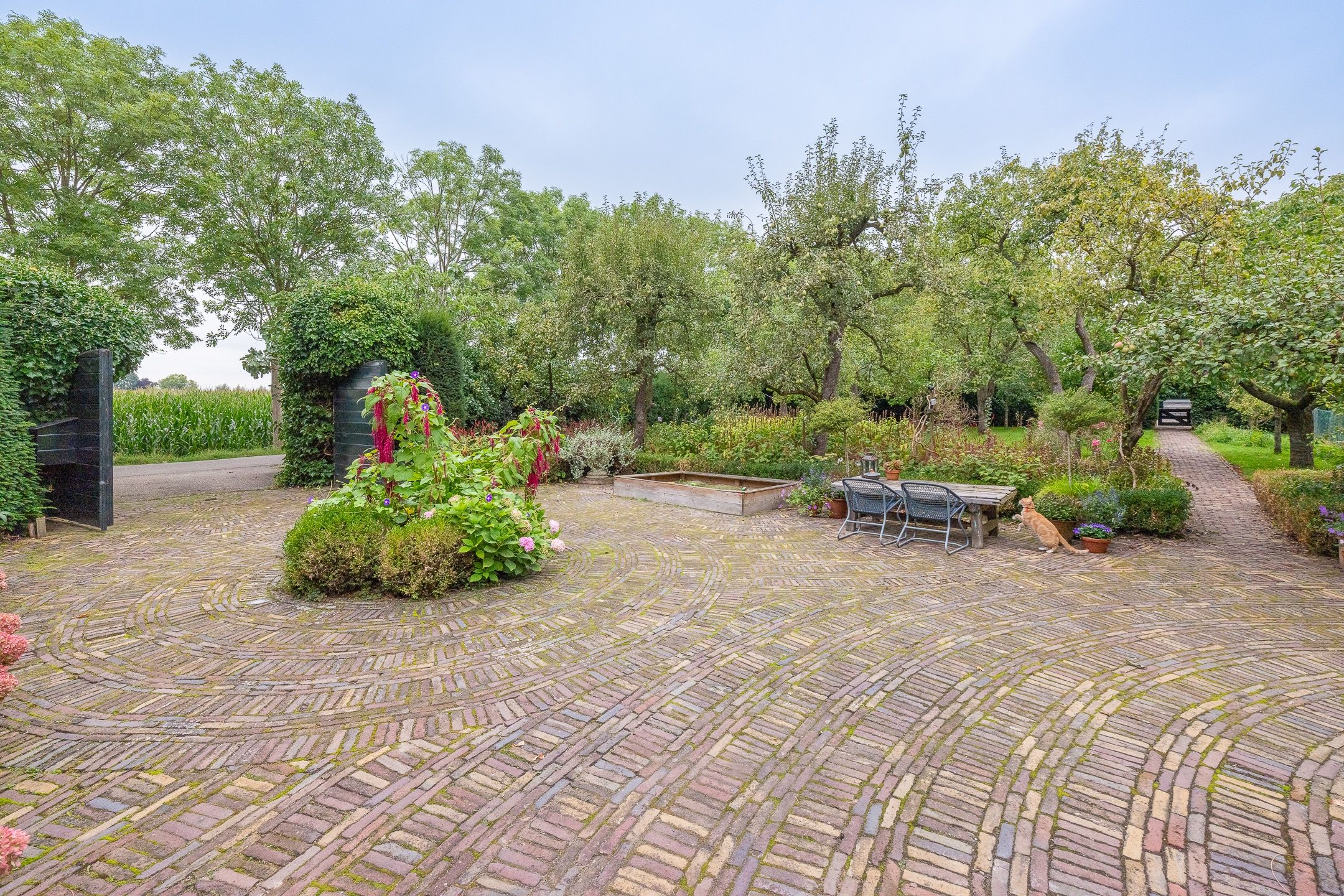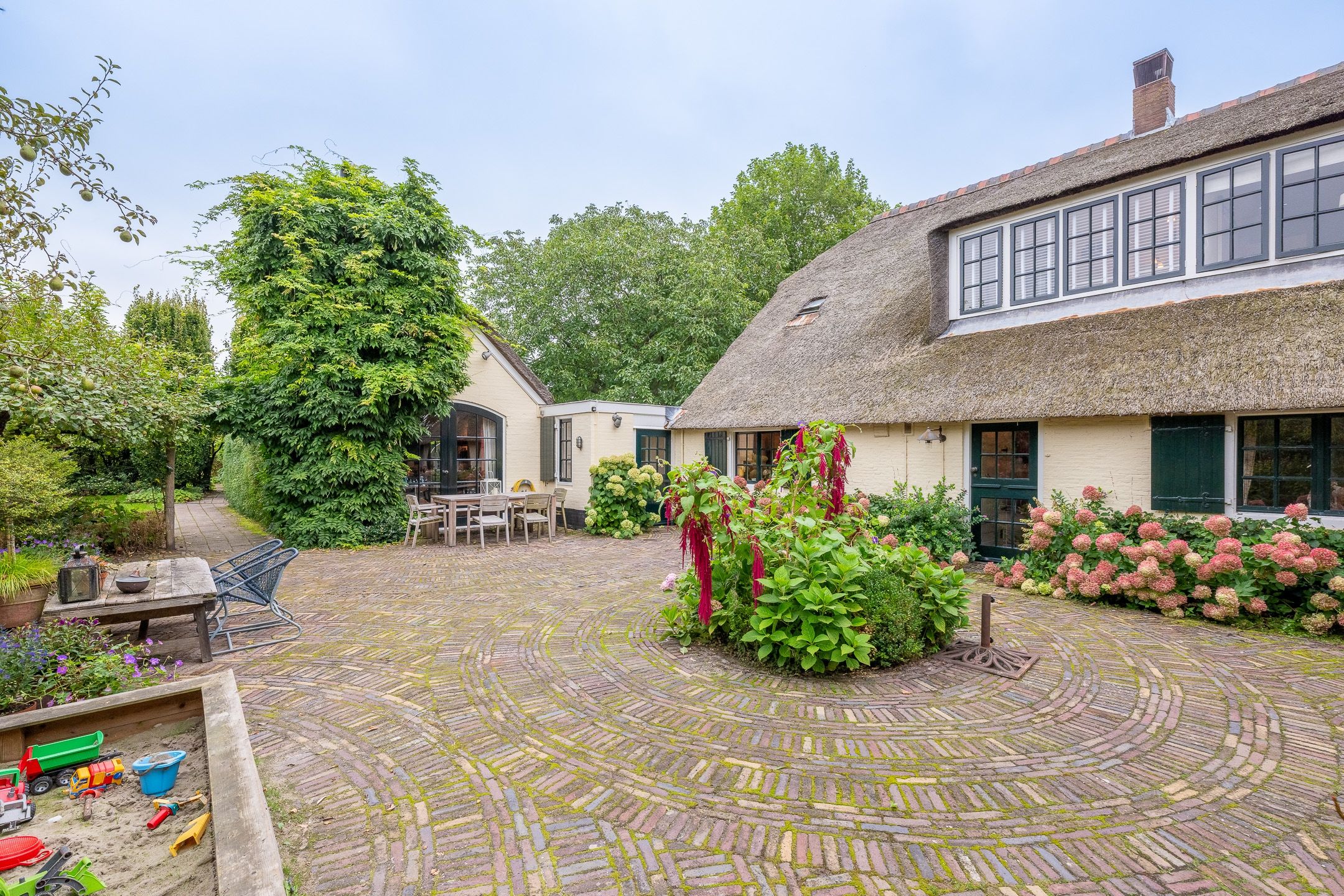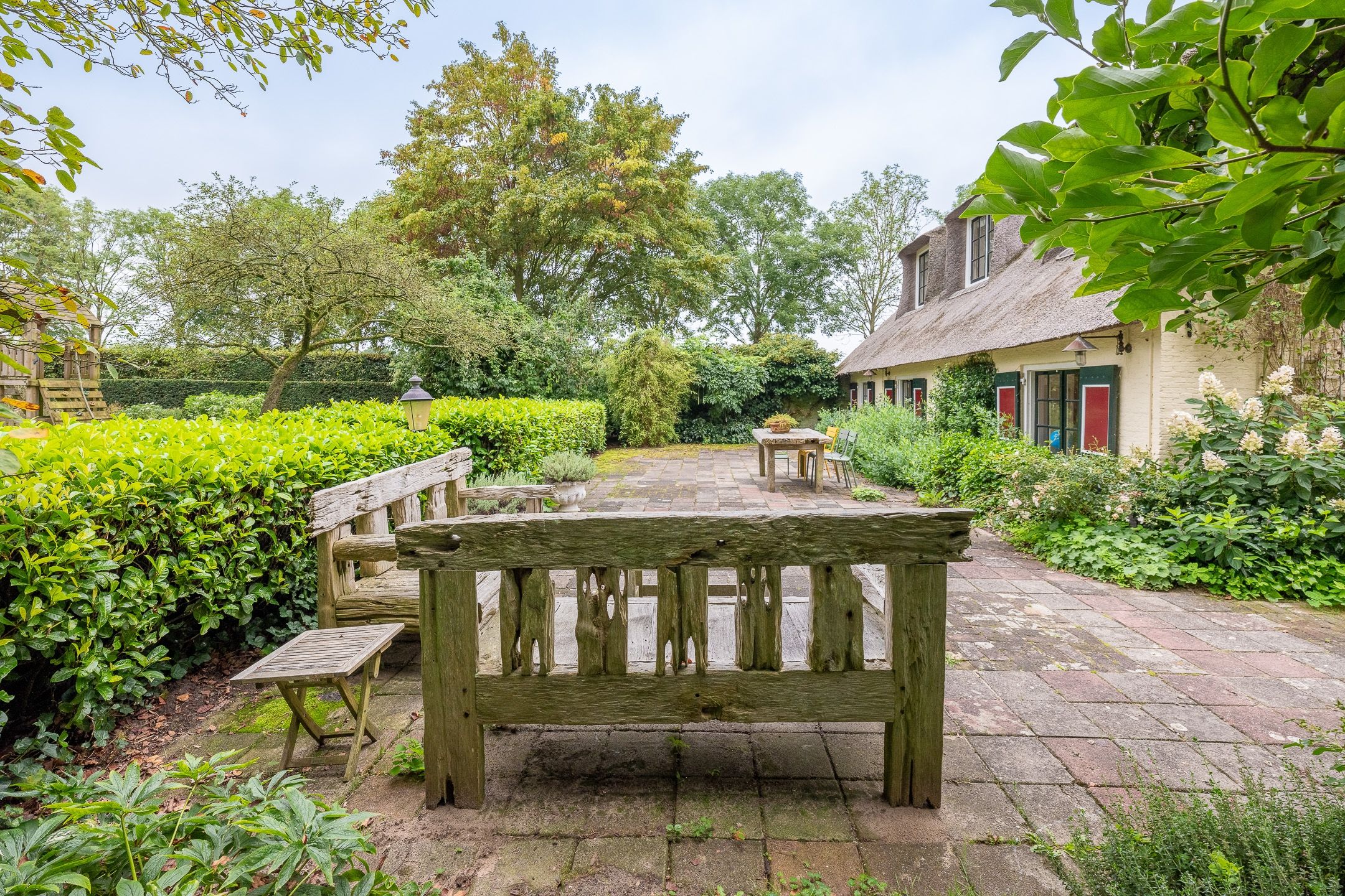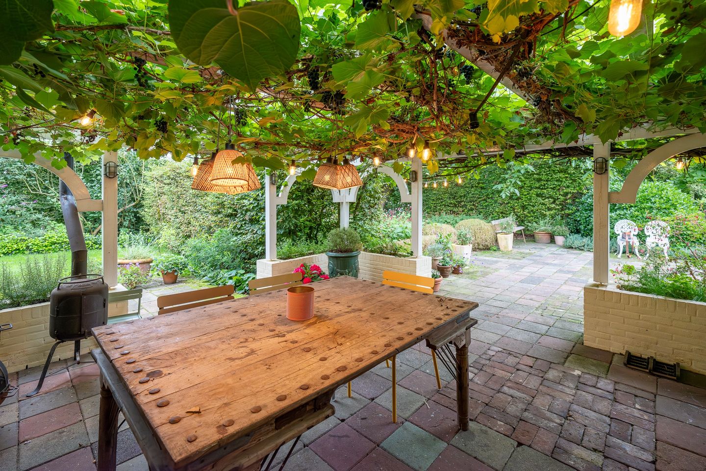 De boerderij heeft diverse gecreëerde tuinen om in te vertoeven, waarvan een met een begroeide druiven overkapping, tuinberging en doorloop naar het uitgestrekte landgoed.