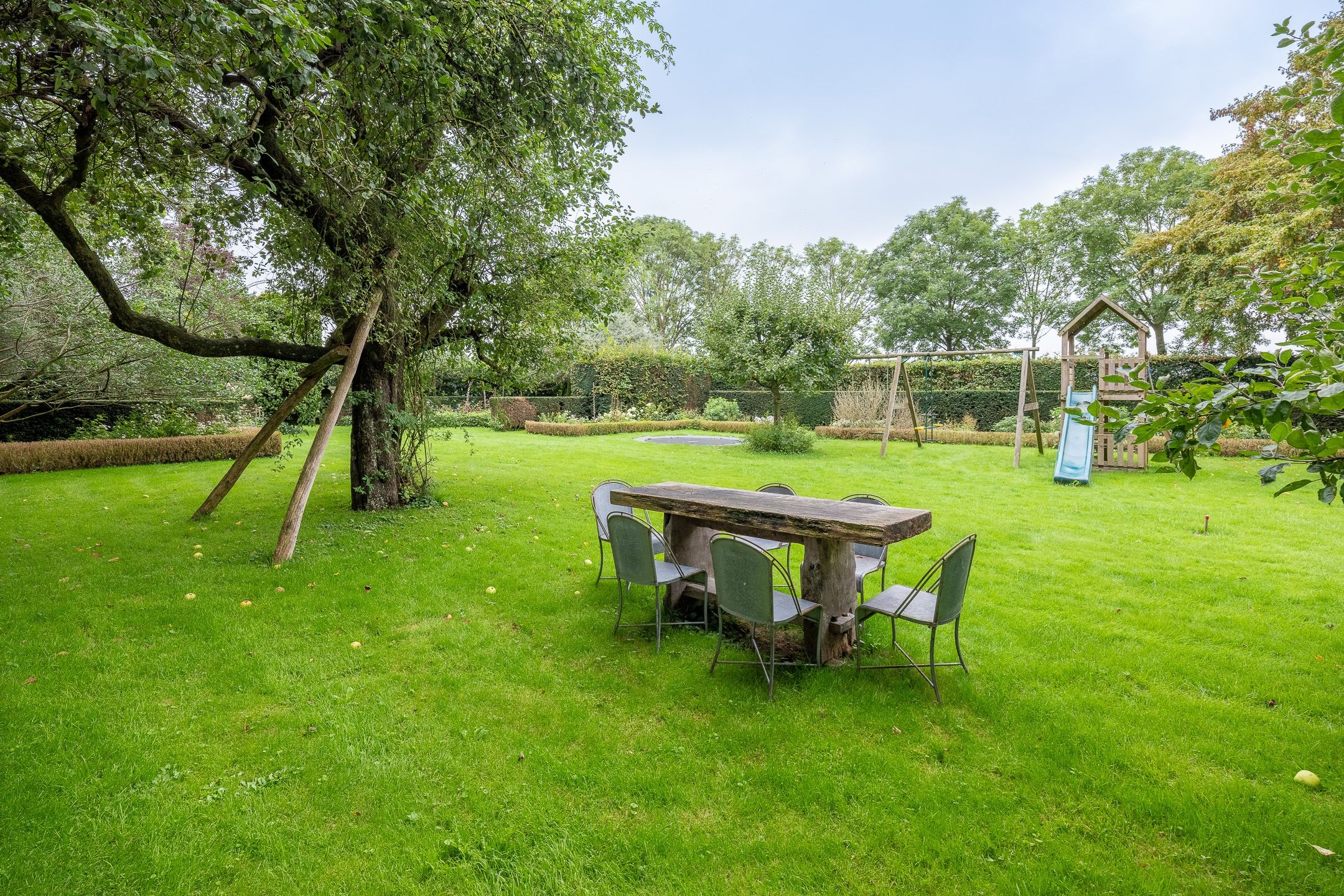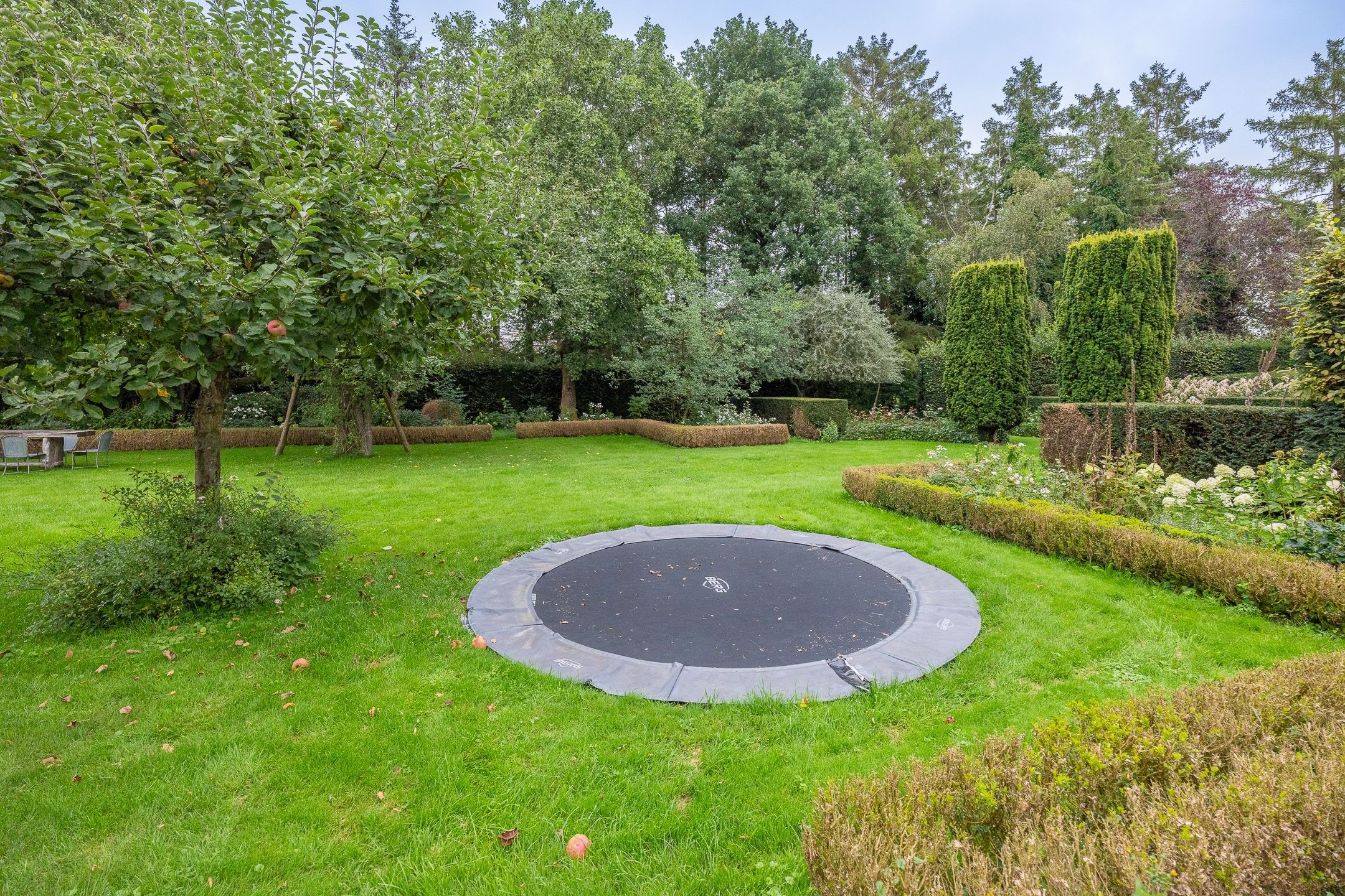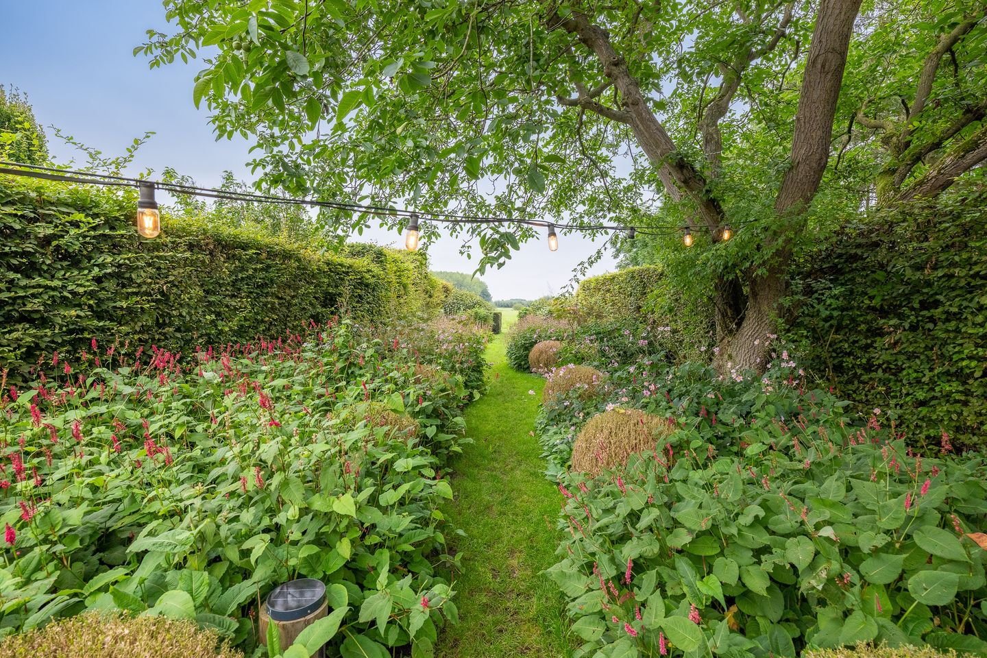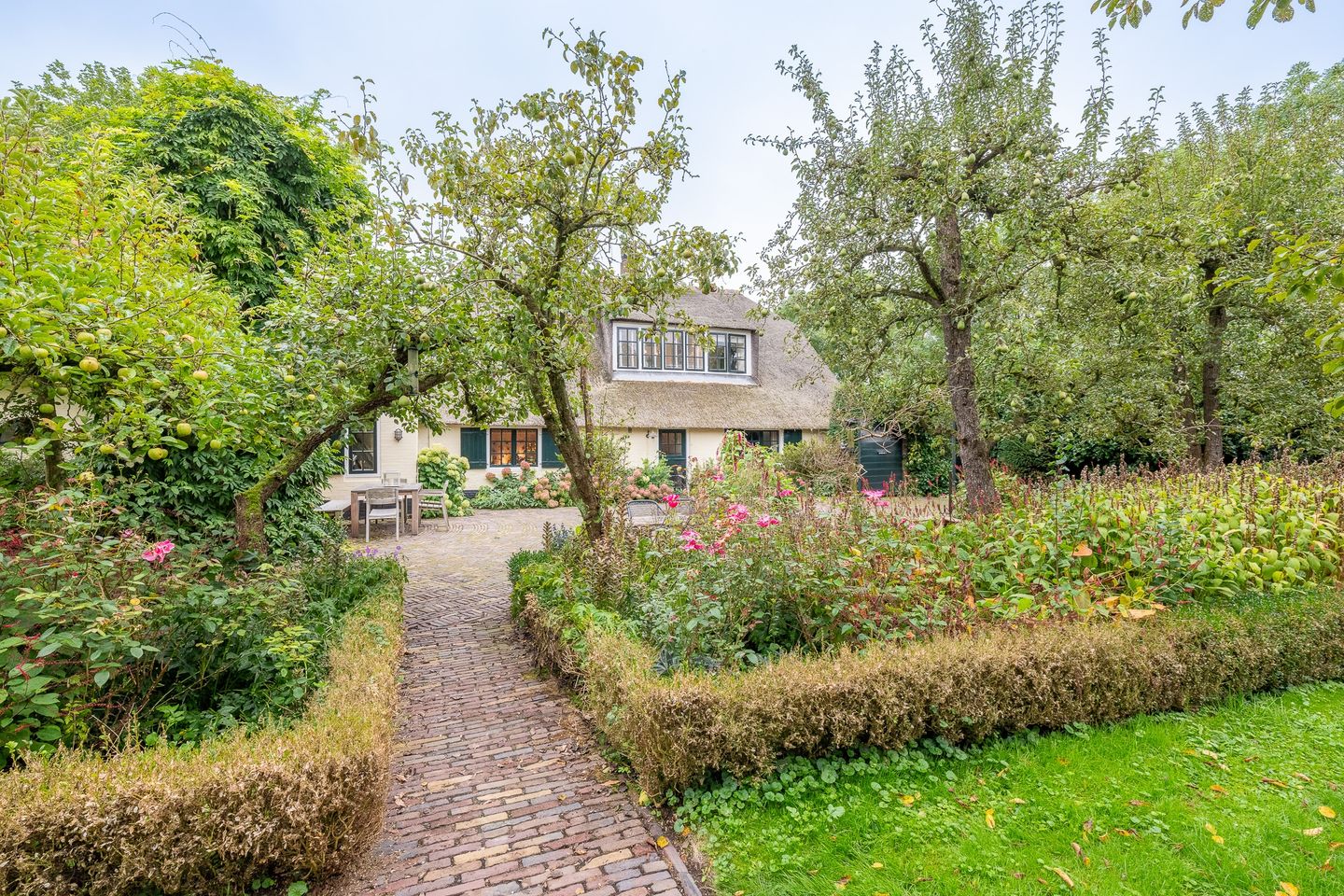 De boerderij heeft diverse gecreëerde tuinen om in te vertoeven, waarvan een met een begroeide druiven overkapping, tuinberging en doorloop naar het uitgestrekte landgoed.