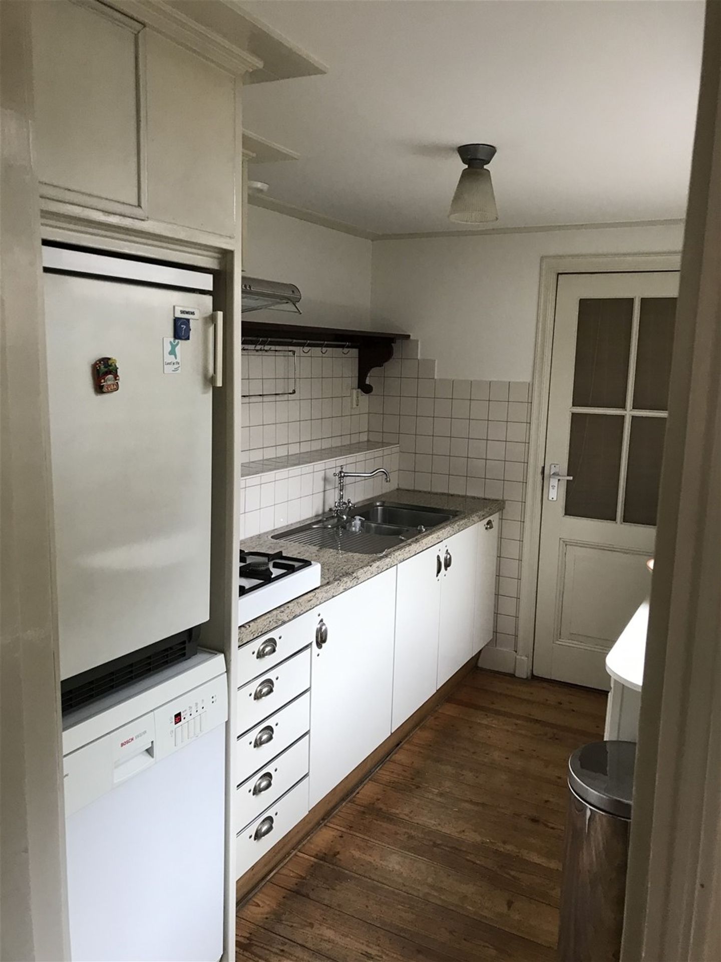 benedenverdieping: hal, woonkamer ca.30 m2 met massief houten vloer. aangebouwde keuken lengte 5 meter met houten vloer en losse apparatuur inclusief vaatwasser; deur naar toilet Via loopdeur keuken naar binnenplaats van ca.12m2.
