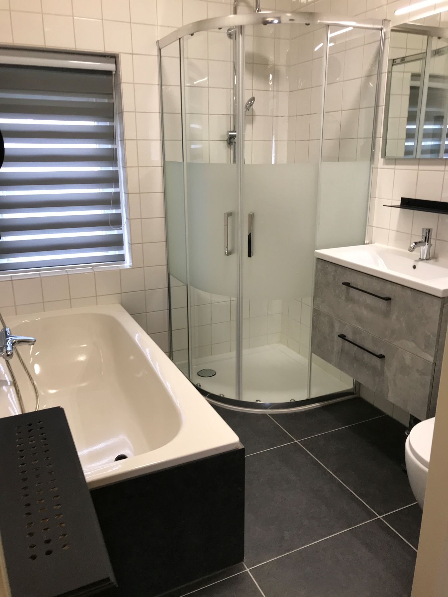 Overloop met toegang tot luxe badkamer met ligbad, douchecabine met stortdouche, wastafelmeubel en zwevend toilet, was/droogruimte met cv-ketel en 3 slaapkamers met laminaatvloer.