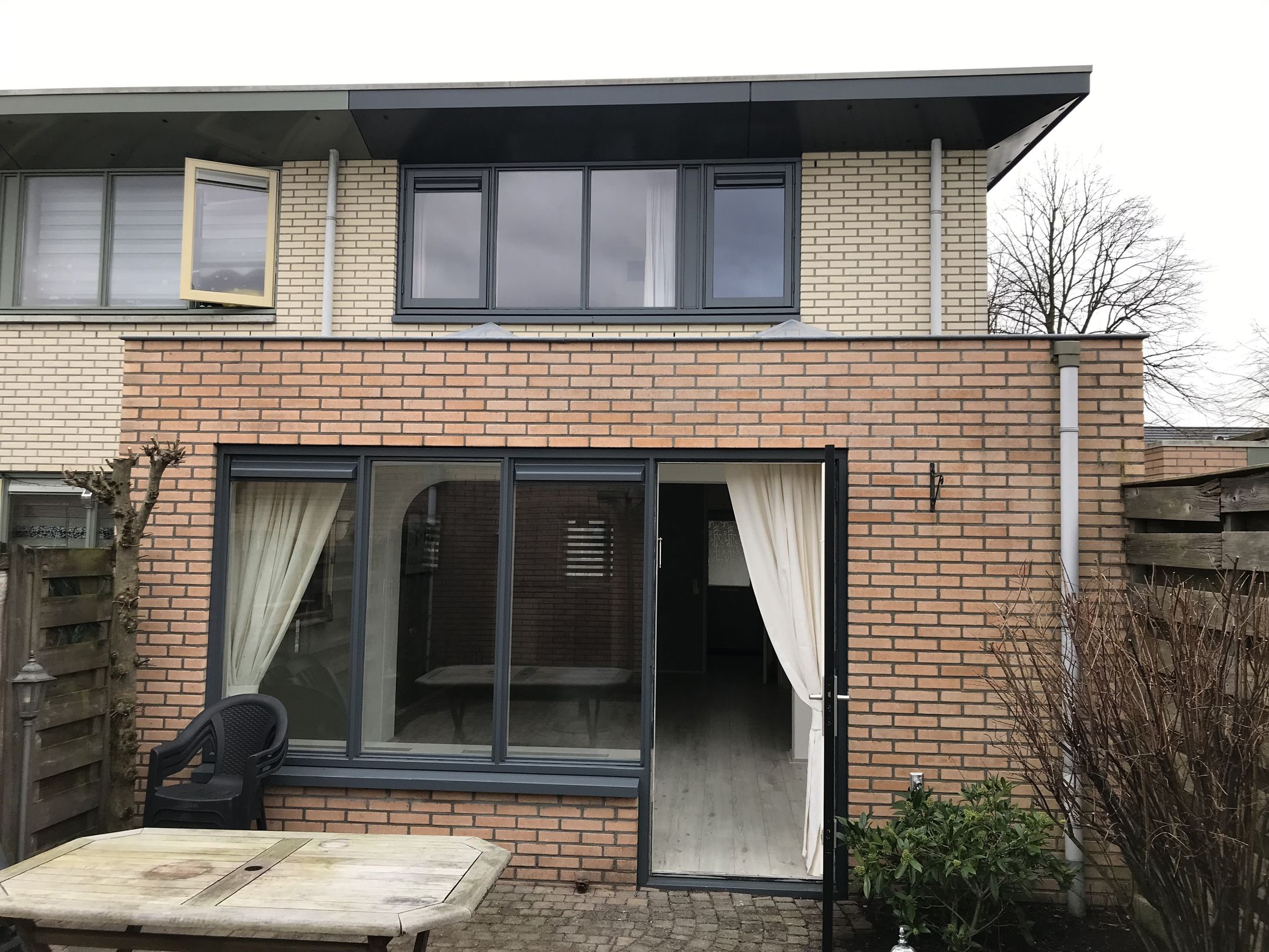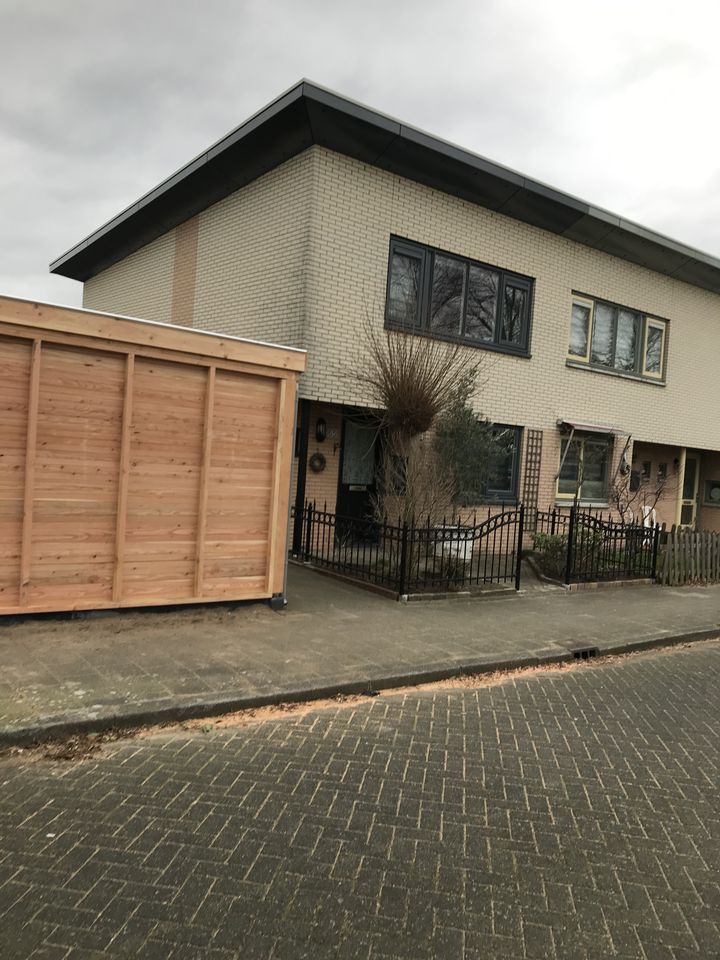 Gestoffeerde hoekwoning met besloten tuin, stenen berging en achterom.