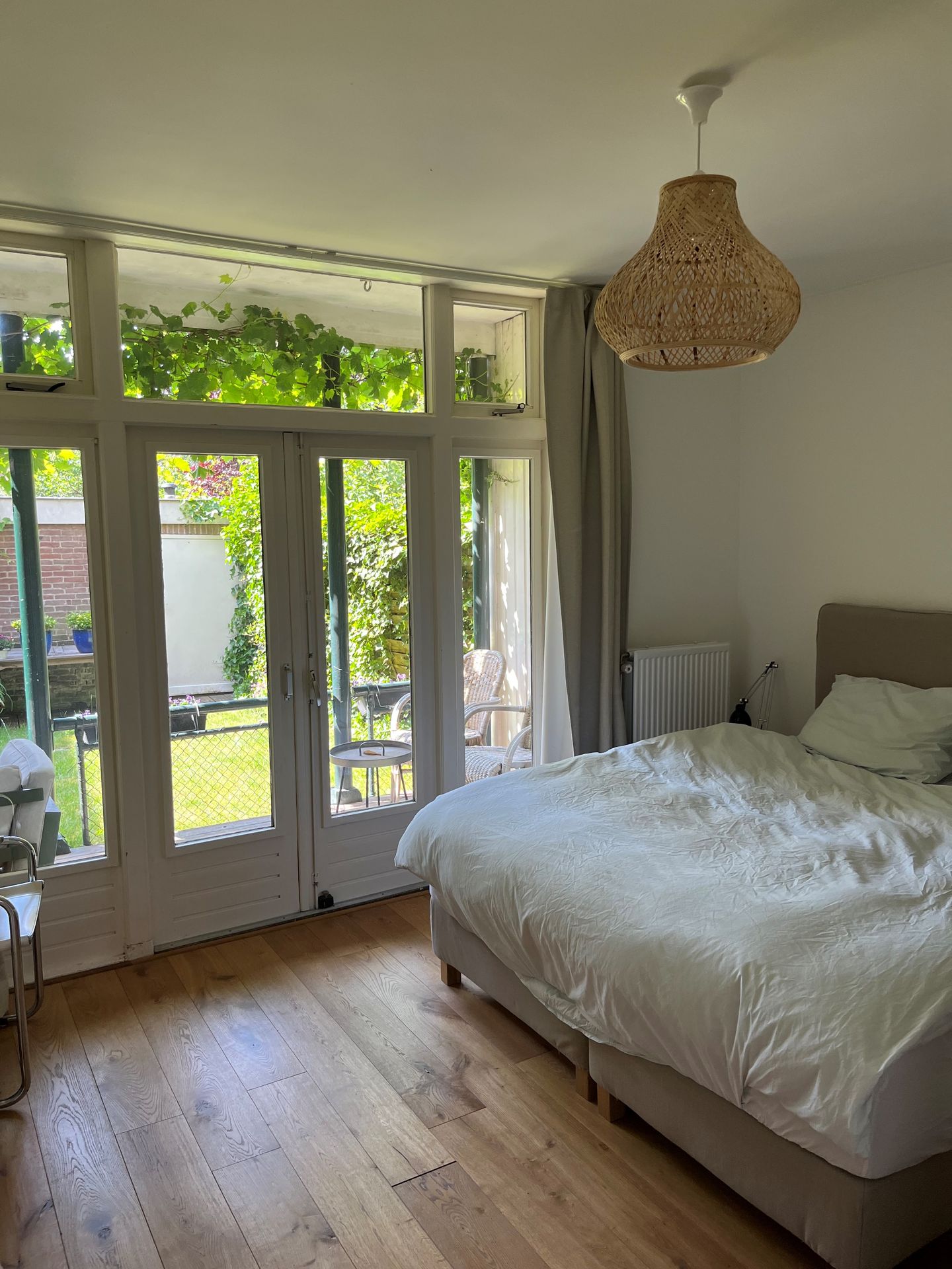 De slaapkamer aan de voorzijde heeft twee ruime bergkasten, in één kast is de wasmachine-aansluiting. De royale slaapkamer aan de achter- en tuinzijde is ruim 12 m² en heeft openslaande deuren naar de tuin.