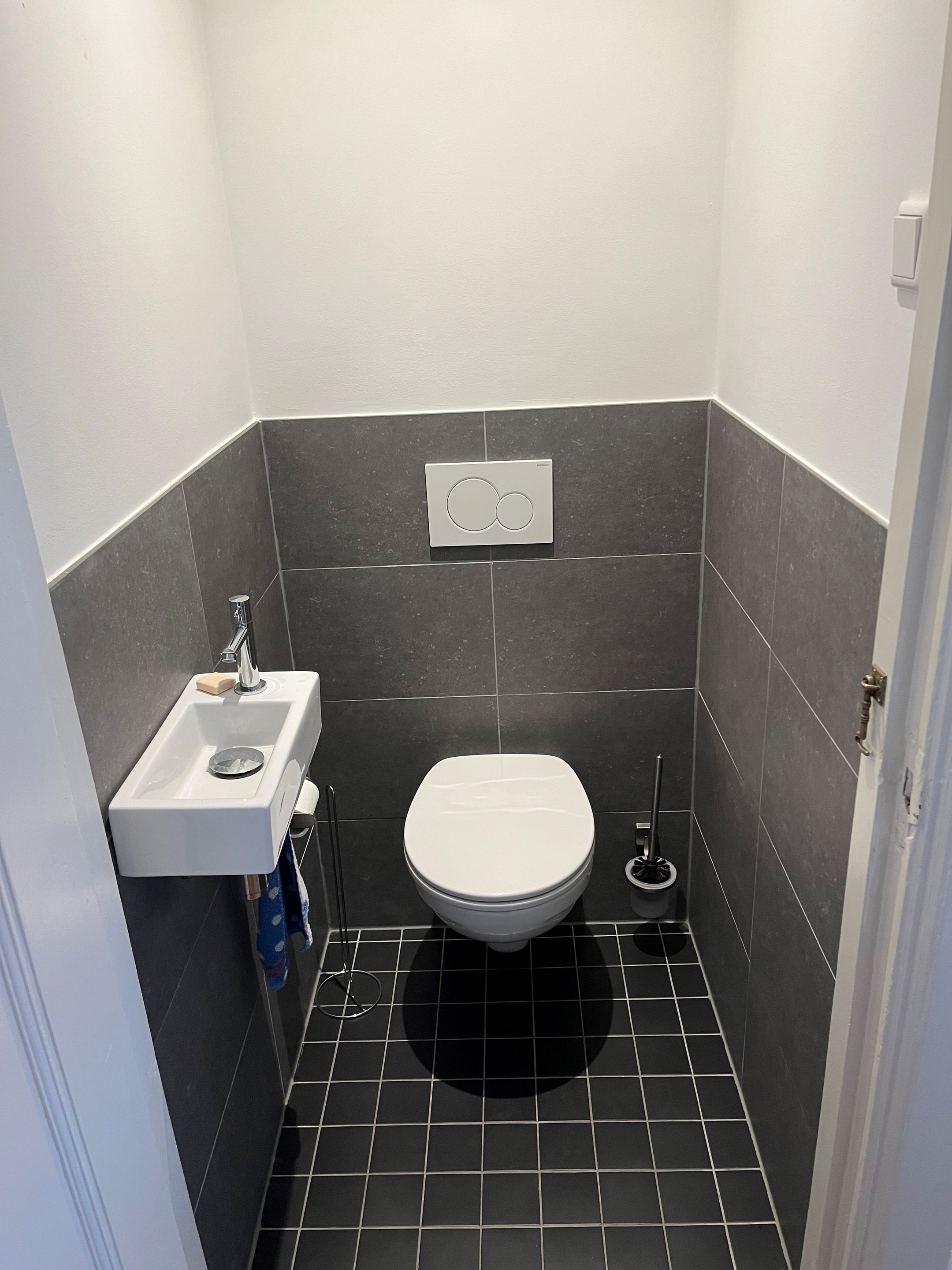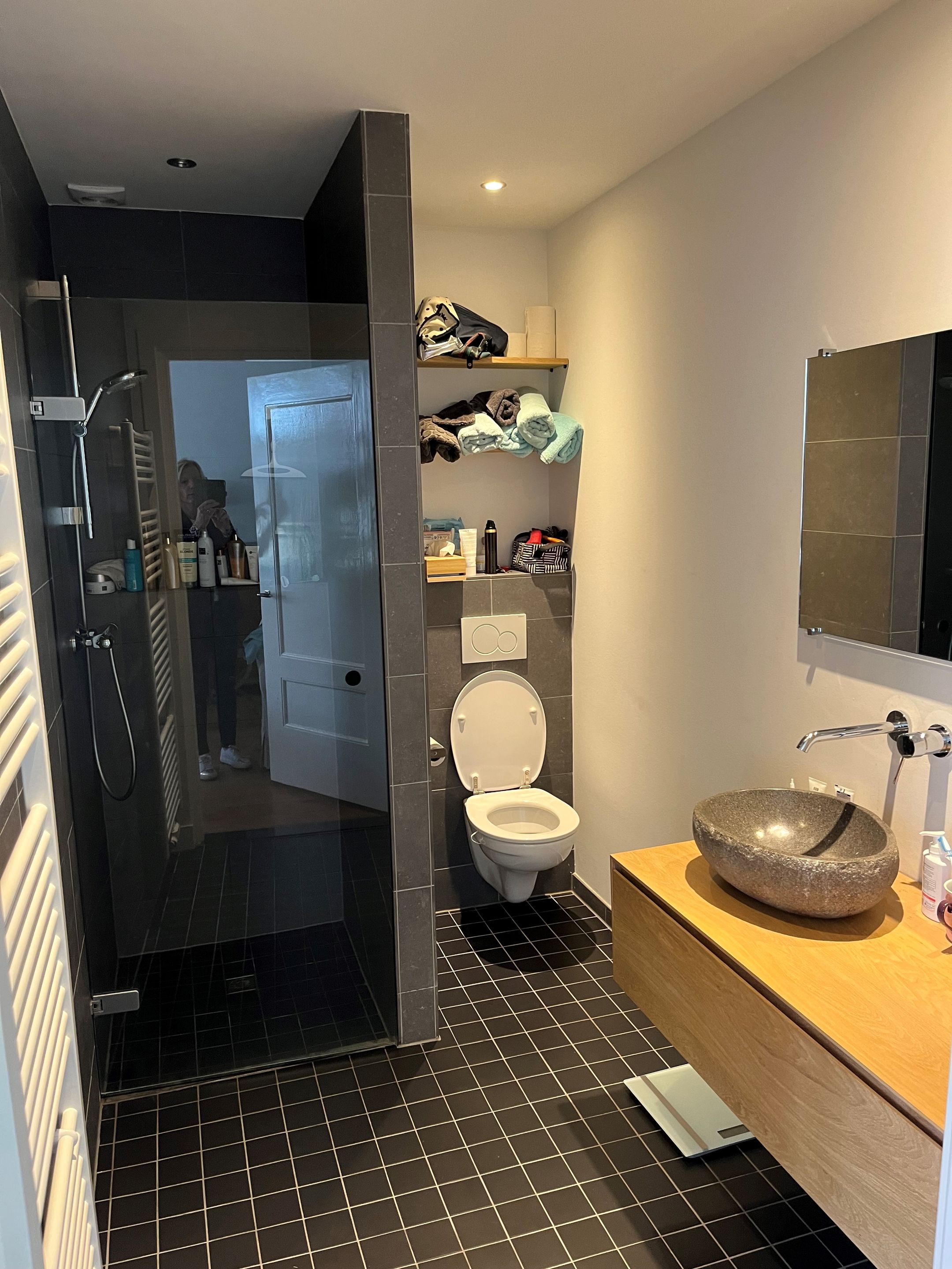 De badkamer is voorzien van een inloopdouche met glazenwand, wastafelmeubel en een tweede toilet.