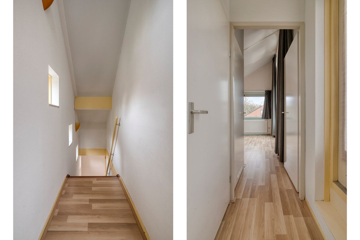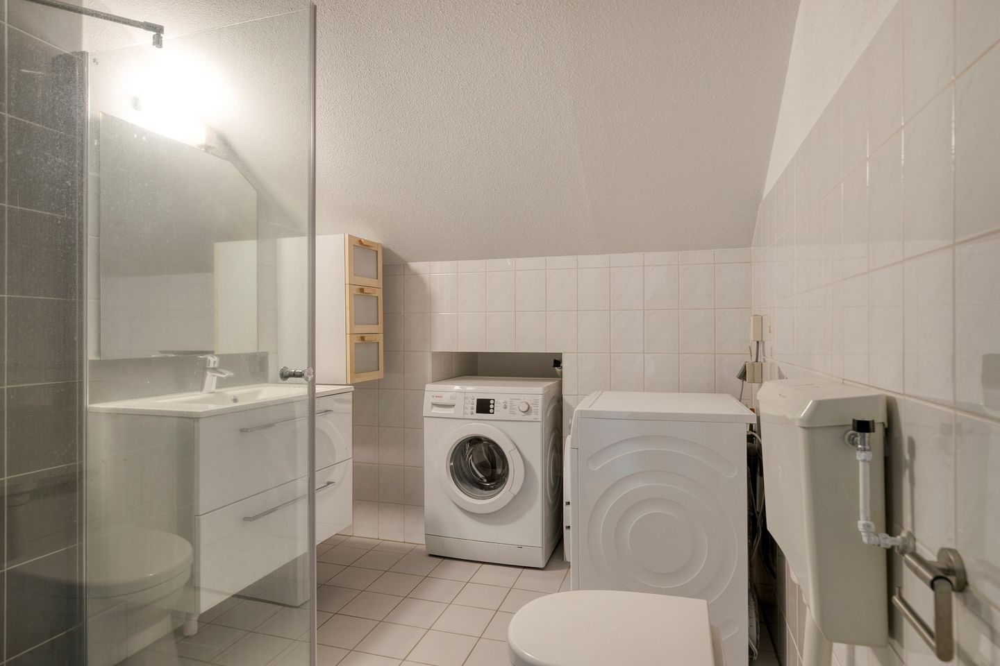 Hier vind je de hoofdslaapkamer met hoog plafond en in de vaste kasten veel bergruimte, de badkamer met douchecabine, wastafelmeubel, tweede toilet en aansluiting voor wasmachine/droger. Vanuit de hoofdslaapkamer met openslaande deuren, maar ook op de overloop heb je toegang tot het ruime dakterras – een heerlijke plek om in privacy te genieten van rust en zon.