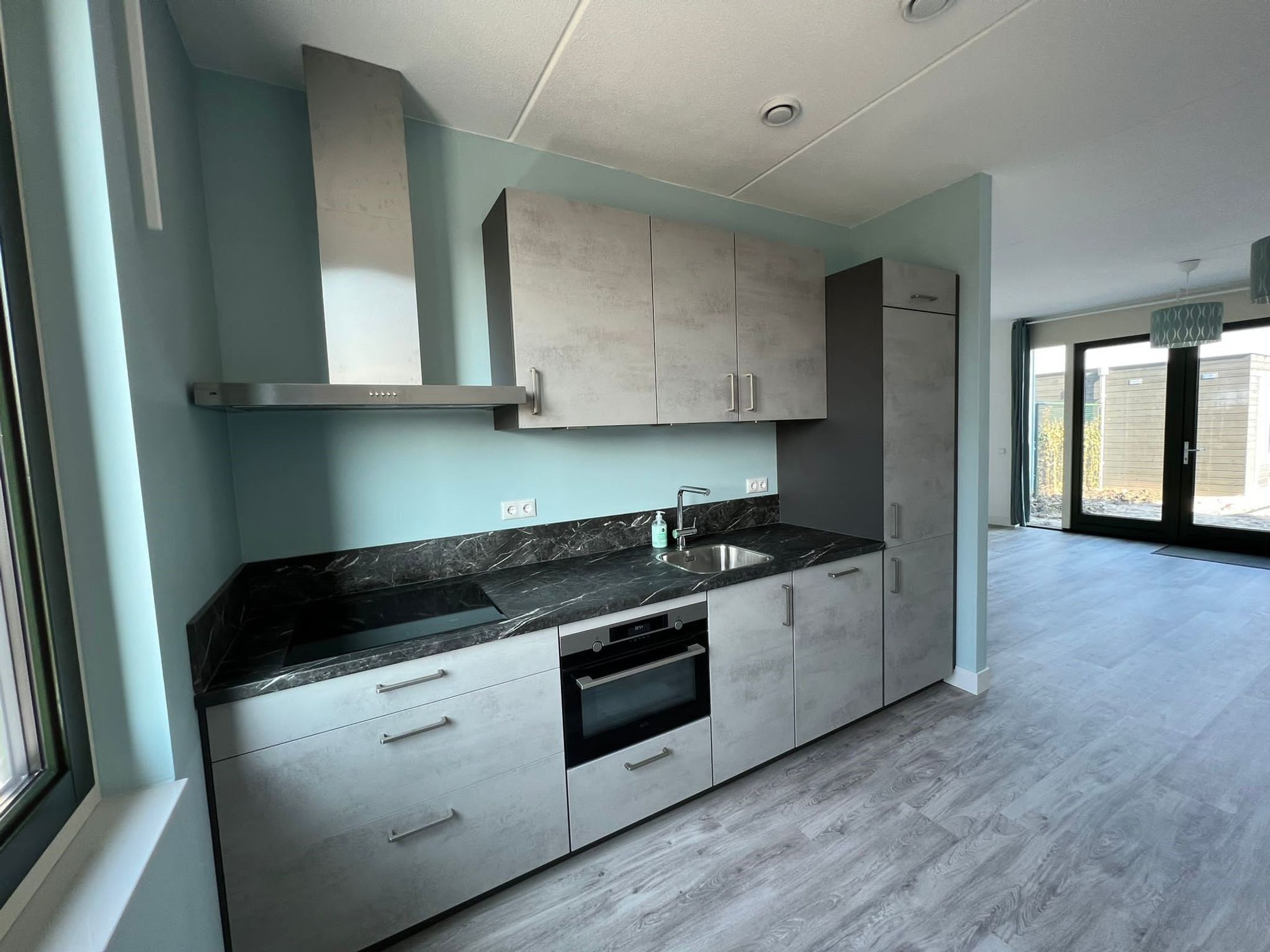 Entree, hal met meterkast, toilet en trapopgang, woonkamer met laminaatvloer en openslaande deuren naar terras, half open keuken met inbouwapparatuur;