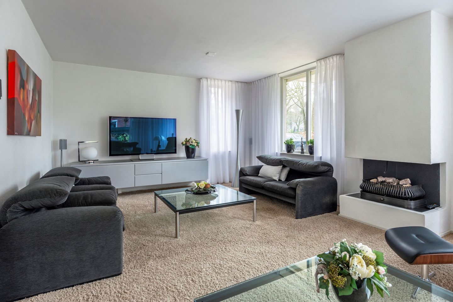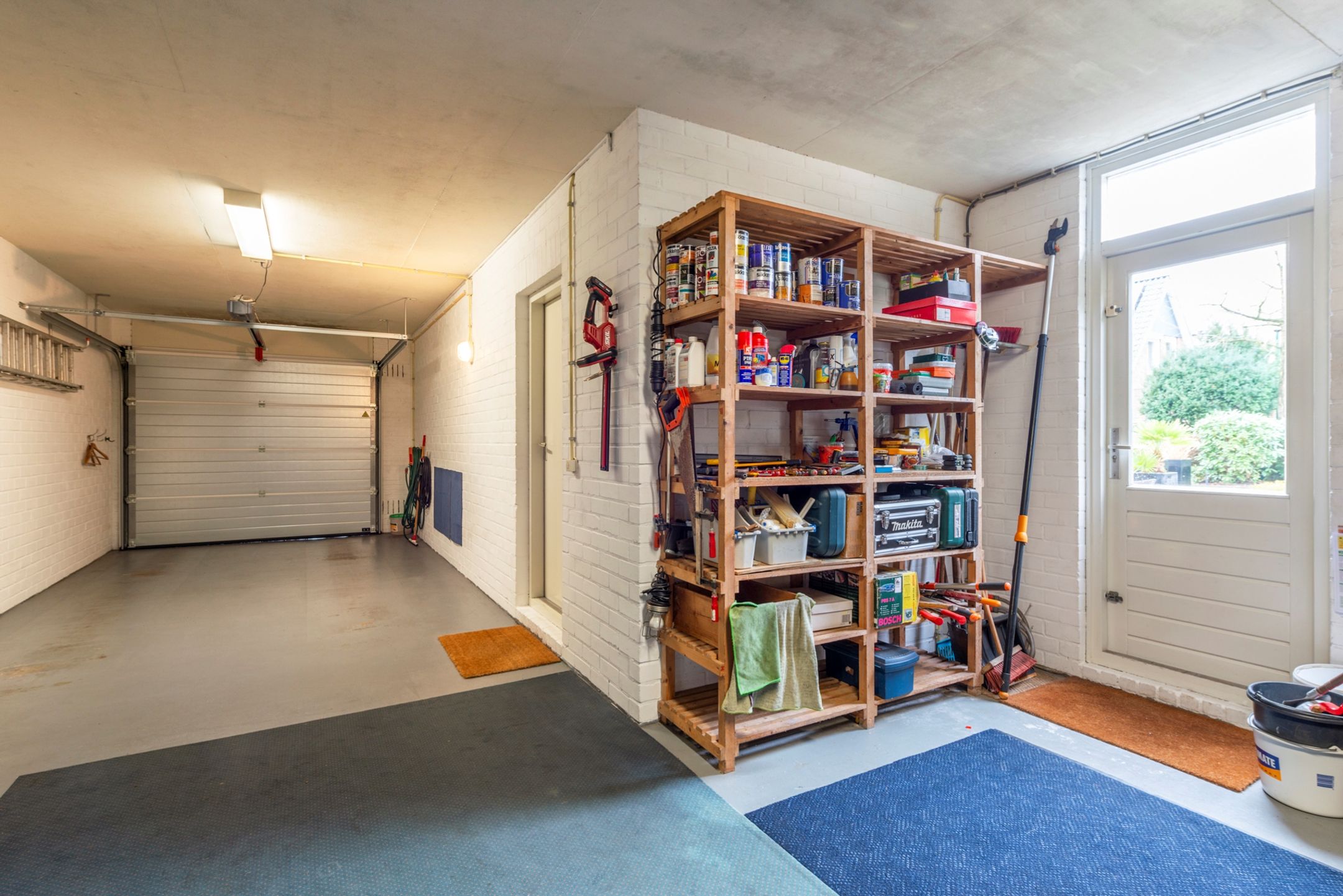 Begane grond: Entree, hal met toilet en fonteintje, een garderobekast en de trapopgang naar de eerste verdieping. Bij binnenkomst in de zeer ruime woonkamer valt direct het lichtinval op door de grote raampartijen aan voorzijde met gas openhaard en aan de zijkant een schuifpui met aansluitend een terras met overkapping. Ook aan de achterzijde is een schuifpui aanwezig met toegang naar het achterterras. Aangrenzend aan de woonkamer bevindt zich een open neutrale keuken in L-opstelling met alle inbouwapparatuur, gevolgd door de bijkeuken met de aansluiting voor wasmachine en wasdroger en extra kastruimte. Via de bijkeuken is de aangebouwde, royale garage met werkruimte bereikbaar alsook de deur naar het terras en achtertuin.