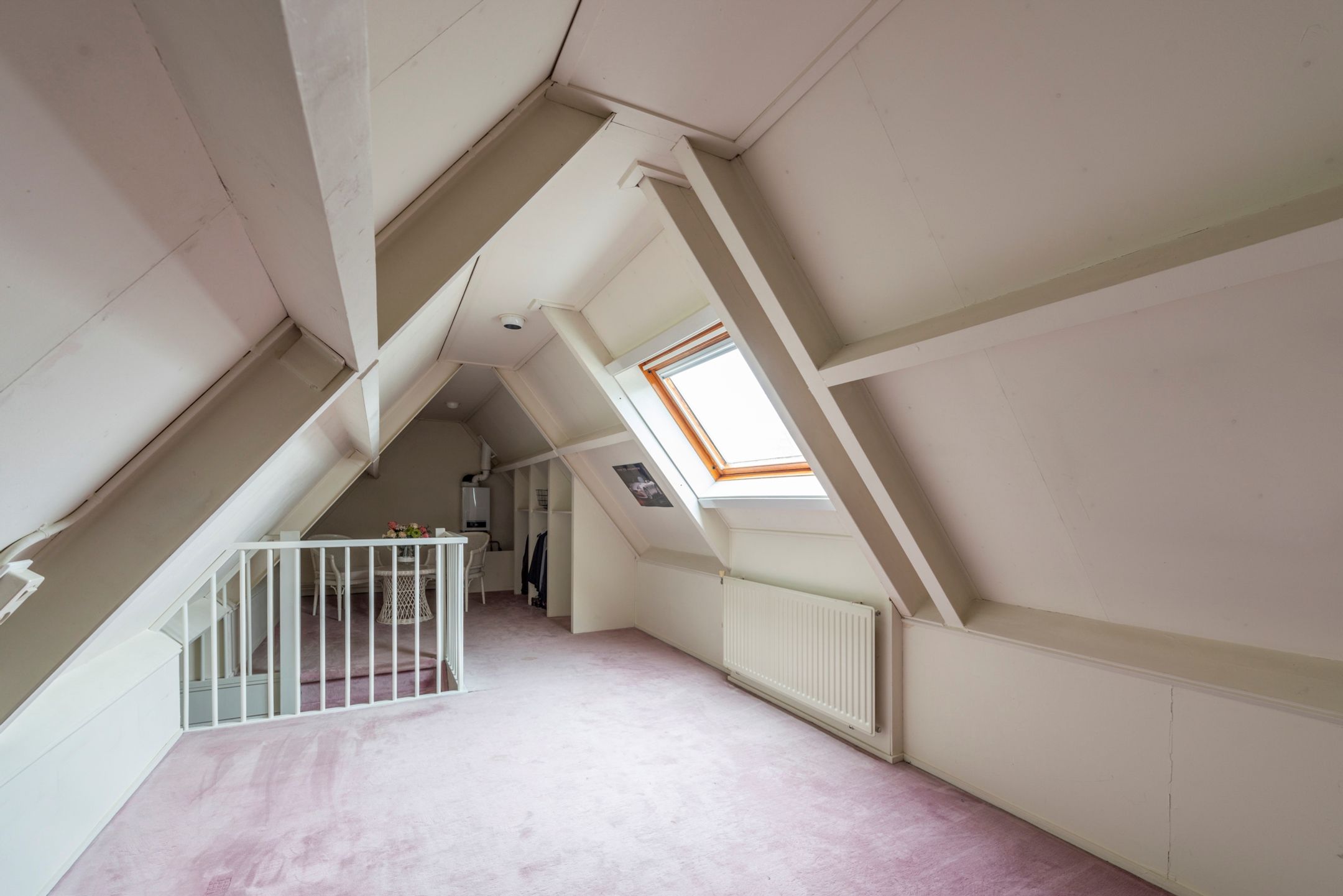 De vaste trap leidt naar de zolderverdieping met een geheel open ruimte met dakraam; ook hier is weer veel kastruimte aanwezig en de opstelling van de CV-installatie. De mogelijkheid bestaat in deze ruimte een of twee extra slaapkamers met dakkapel te realiseren.