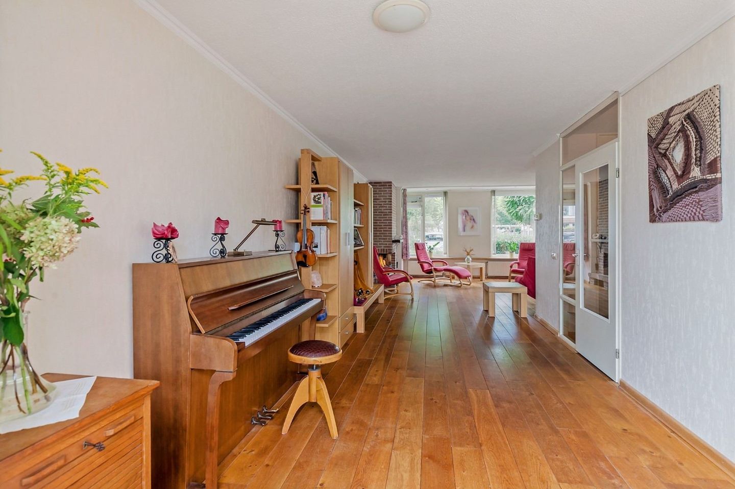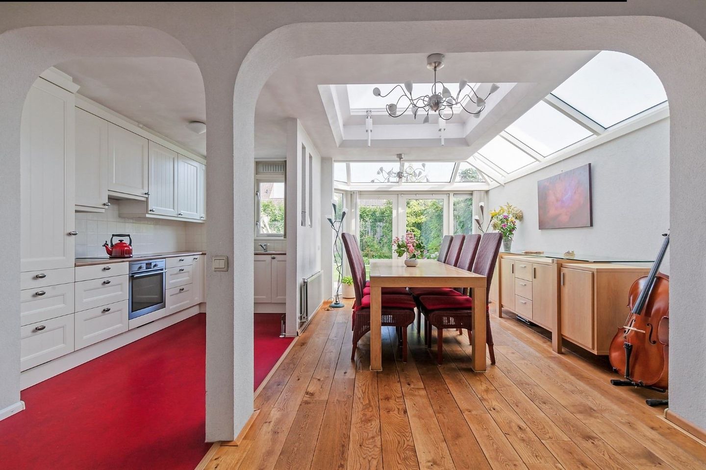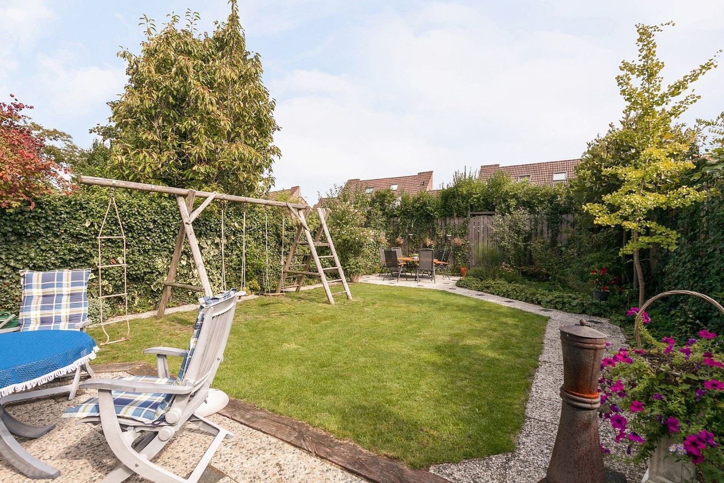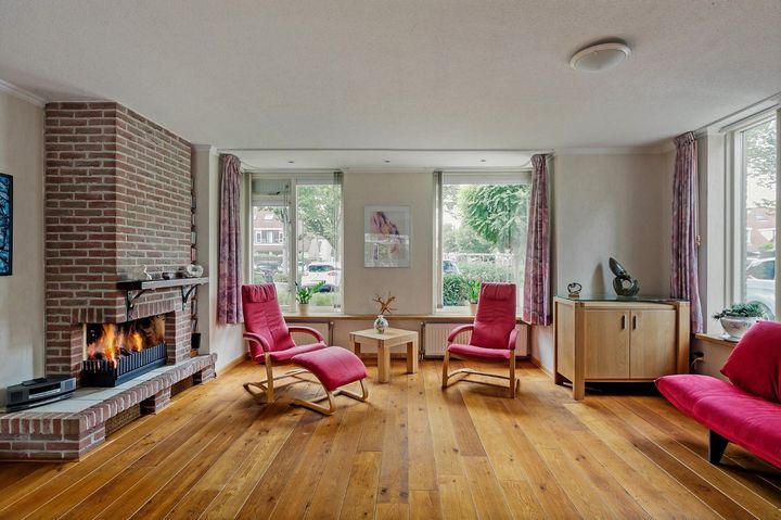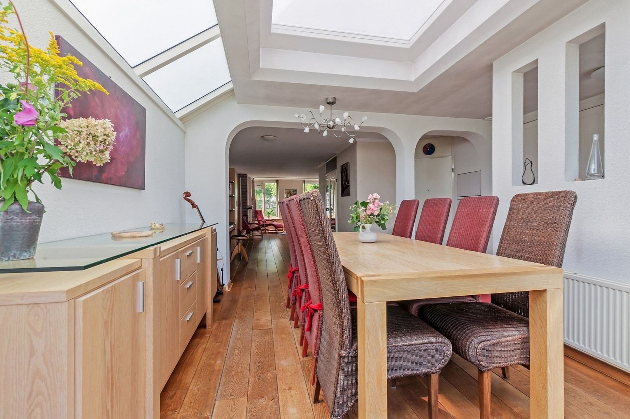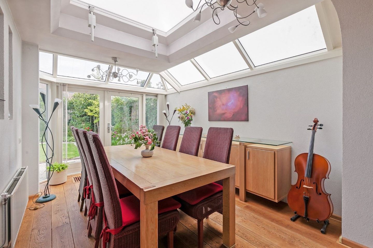 Entree, hal met garderobe, meterkast, toilet en trapopgang naar de 1ste verdieping, royaal aan de voor- en achterzijde uitgebouwde L-vormige woonkamer voorzien van breed massief Frans eiken parket met zeer lichte serre voorzien van schuine dakramen en grote, elektrisch te openen lichtkoepel, openslaande deuren naar de zonnige achtertuin met volop privacy, sfeervolle gasgestookte open haard, open keuken met inbouwapparatuur w.o. elektrische grill-bakoven, inductiekookplaat + afzuigkap, vaatwasser op werkhoogte, ruime koelkast, close-in boiler). Via berging toegang tot de garage met vliering op stahoogte (totaal 14 m2) en hoog plafond, aansluiting voor vriezer, wasmachine en energiezuinige Miele gas-wasdroger, 2e toegang naar tuin met 2 terrassen en achterom.