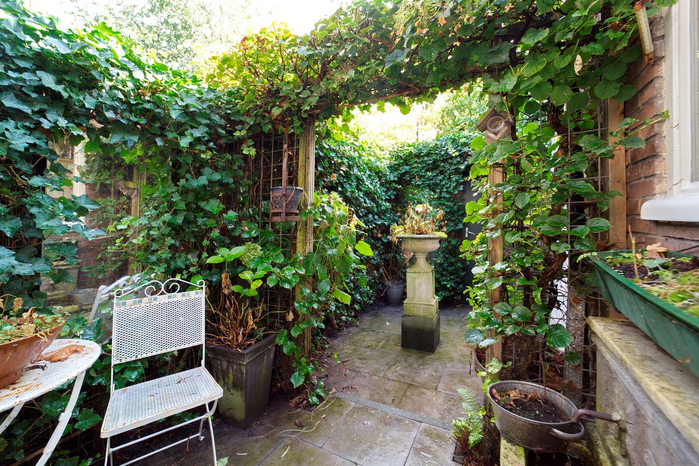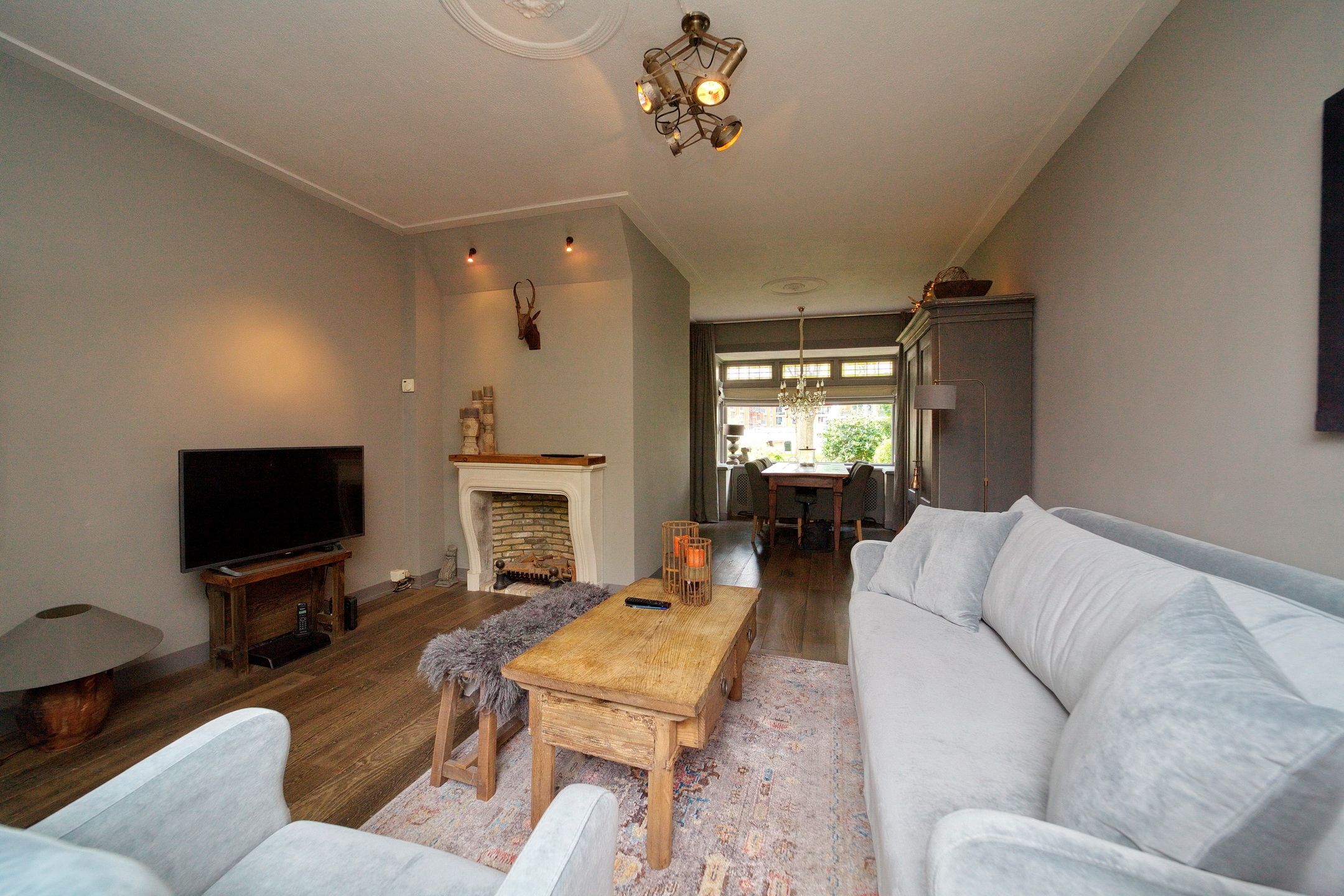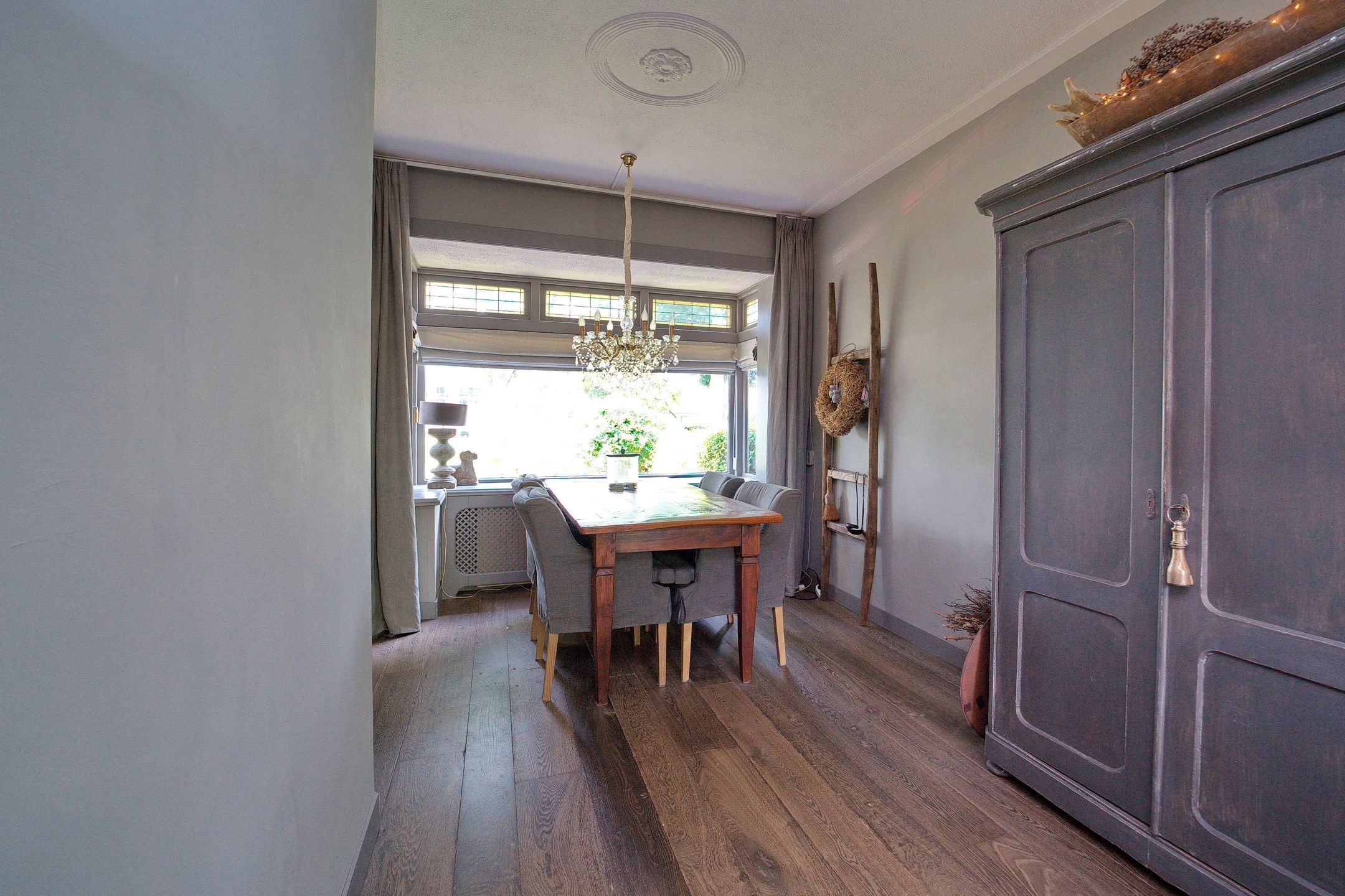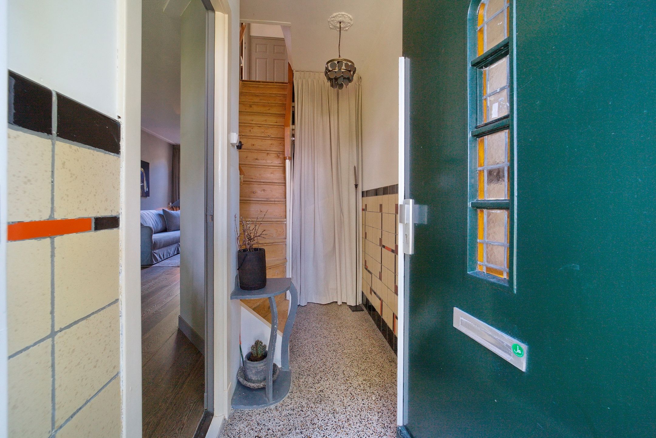 Begane grond: Entree/hal met originele granietvloer, deur met glas-in-lood raam en toegang naar de woonkamer met fraaie eiken houtenvloer, erker aan de voorzijde en bovenlichten voorzien van glas-in-lood ramen, glad gestucte wanden, convectorput en openslaande deuren aan de achterzijde naar besloten tuin.
