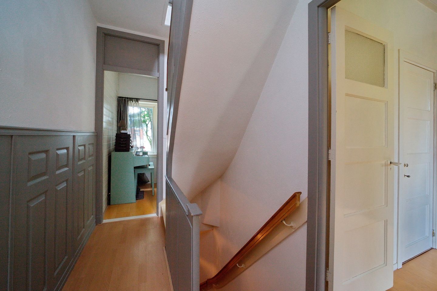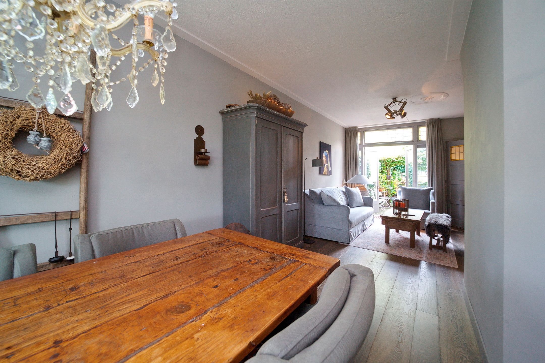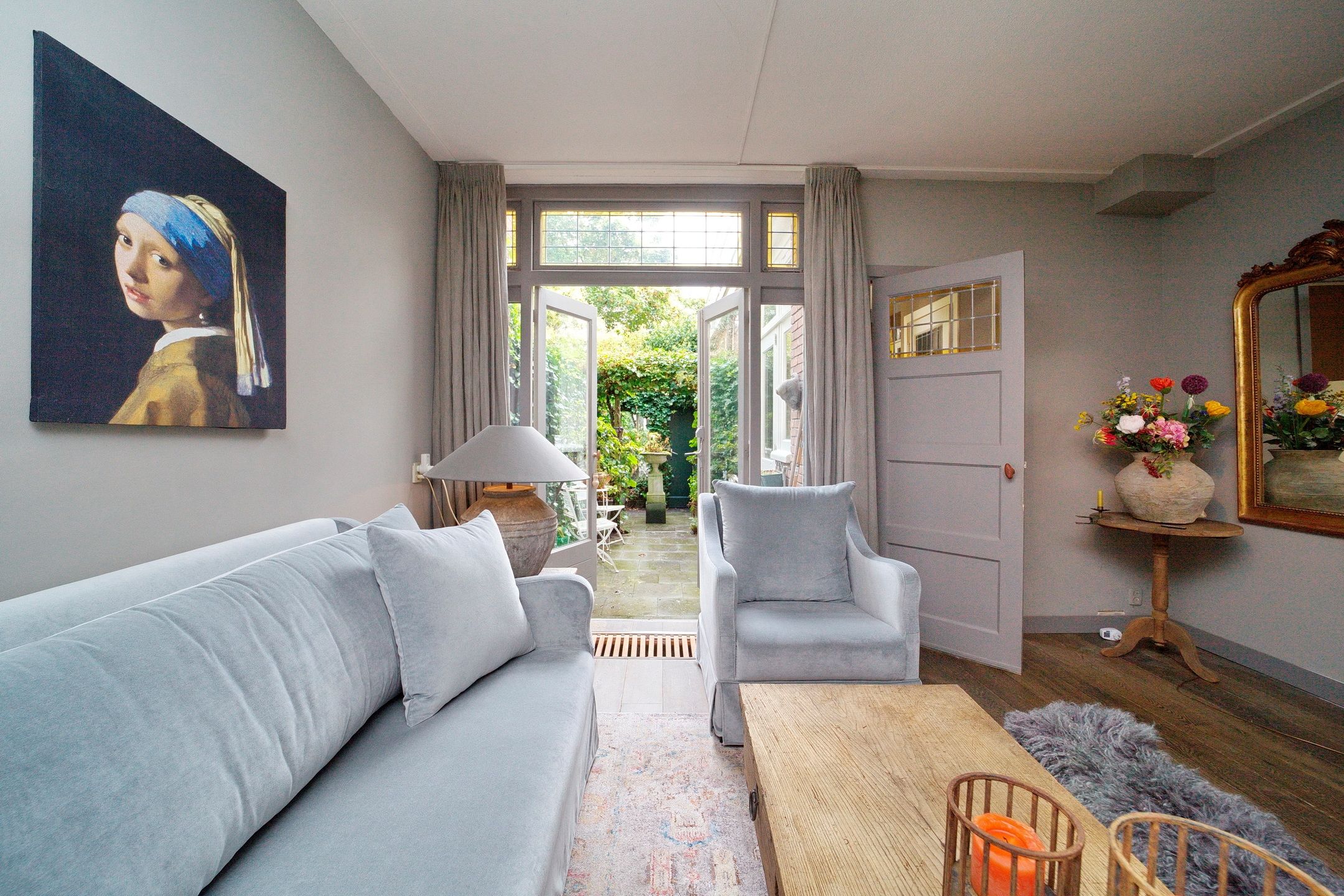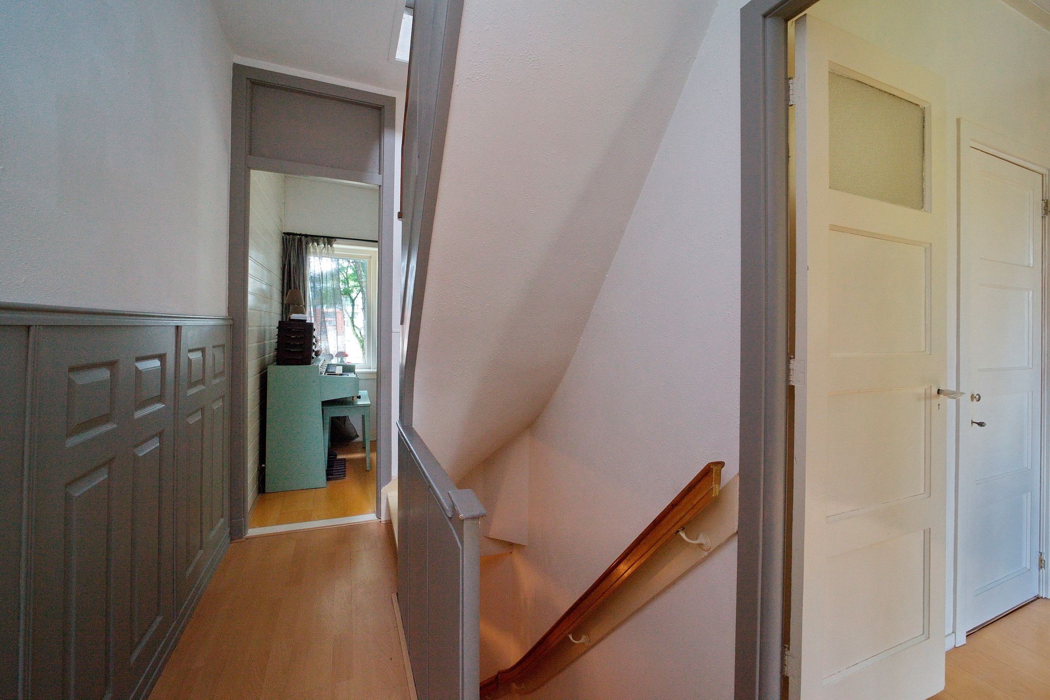 Begane grond: Entree/hal met originele granietvloer, deur met glas-in-lood raam en toegang naar de woonkamer met fraaie eiken houtenvloer, erker aan de voorzijde en bovenlichten voorzien van glas-in-lood ramen, glad gestucte wanden, convectorput en openslaande deuren aan de achterzijde naar besloten tuin.