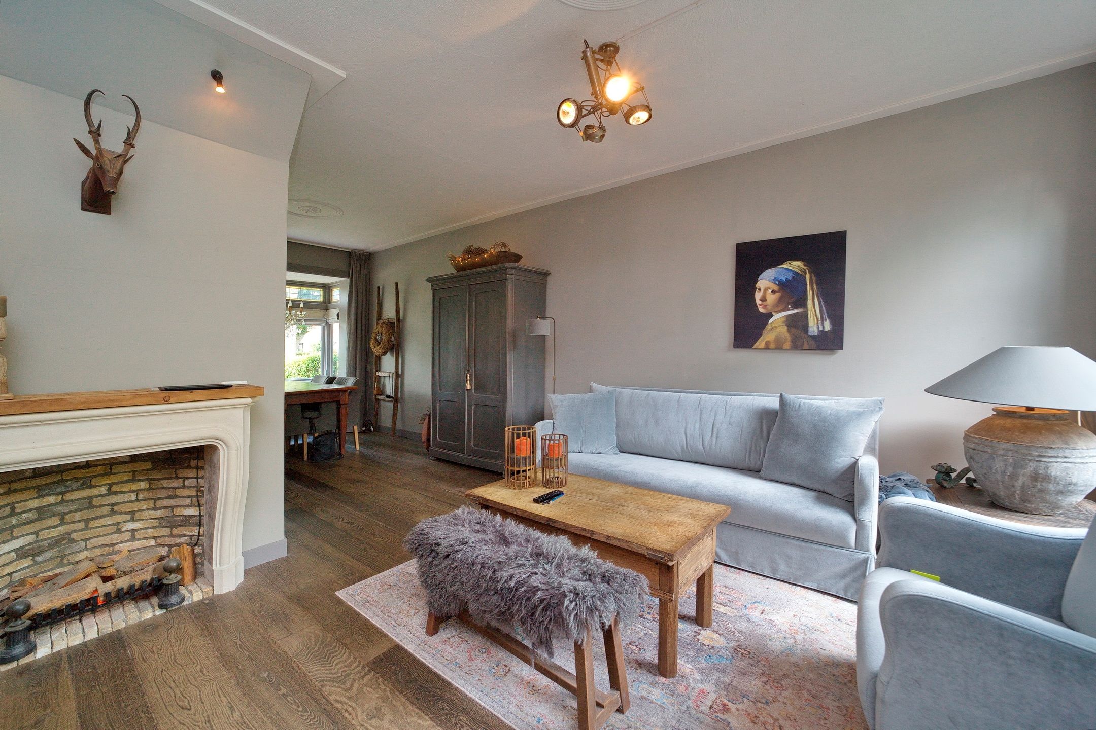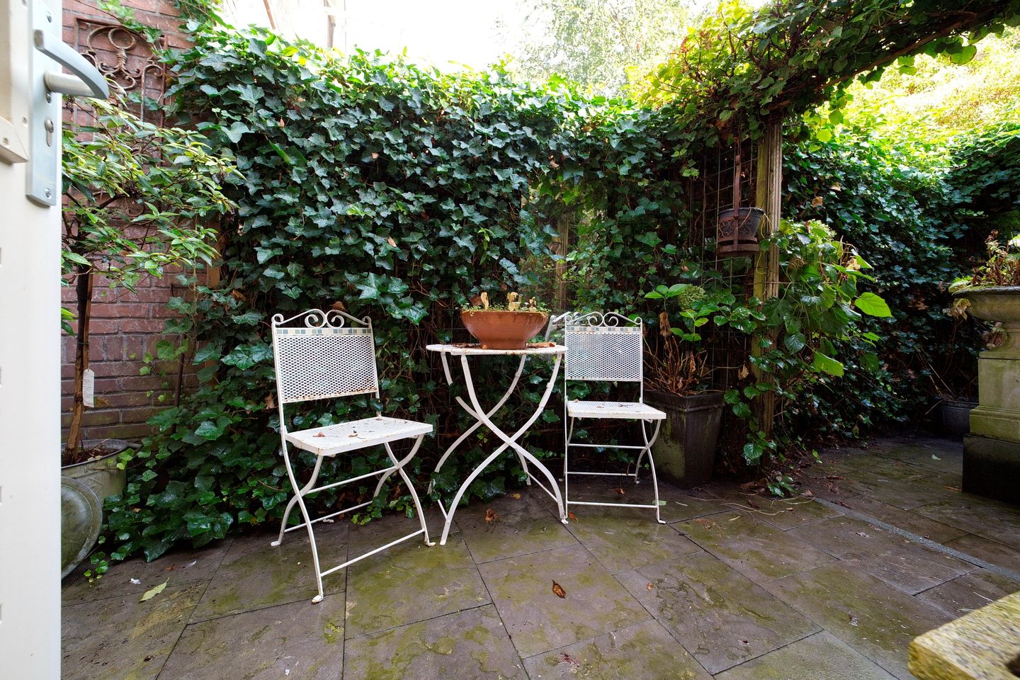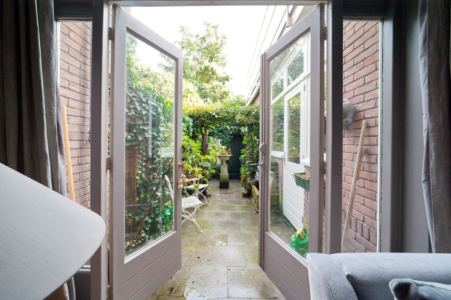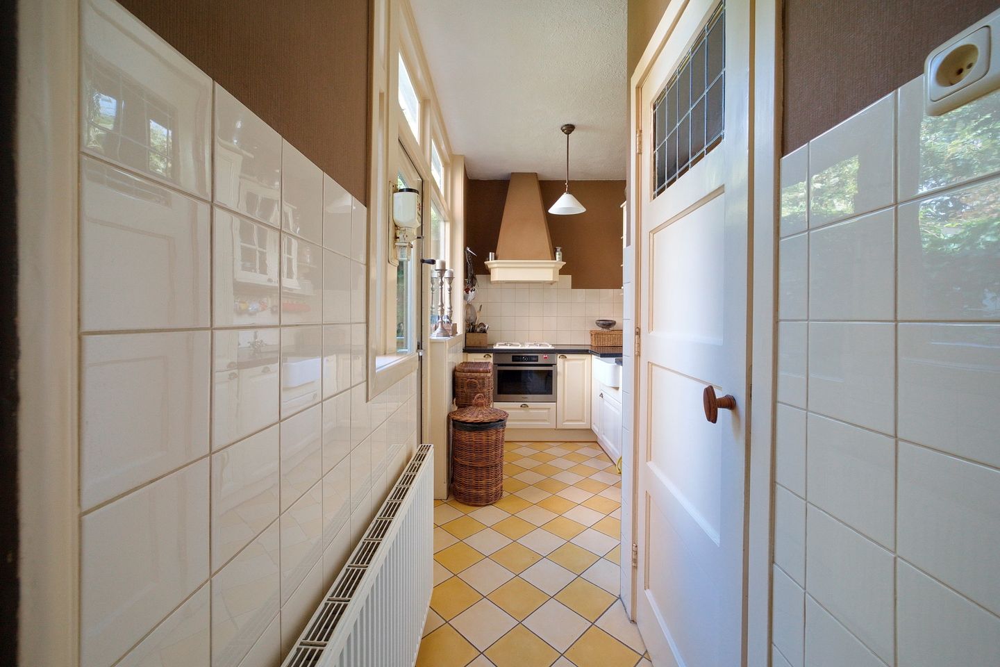 Begane grond: Entree/hal met originele granietvloer, deur met glas-in-lood raam en toegang naar de woonkamer met fraaie eiken houtenvloer, erker aan de voorzijde en bovenlichten voorzien van glas-in-lood ramen, glad gestucte wanden, convectorput en openslaande deuren aan de achterzijde naar besloten tuin.