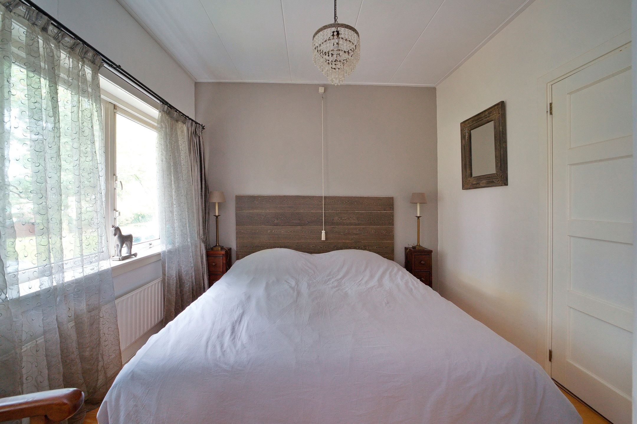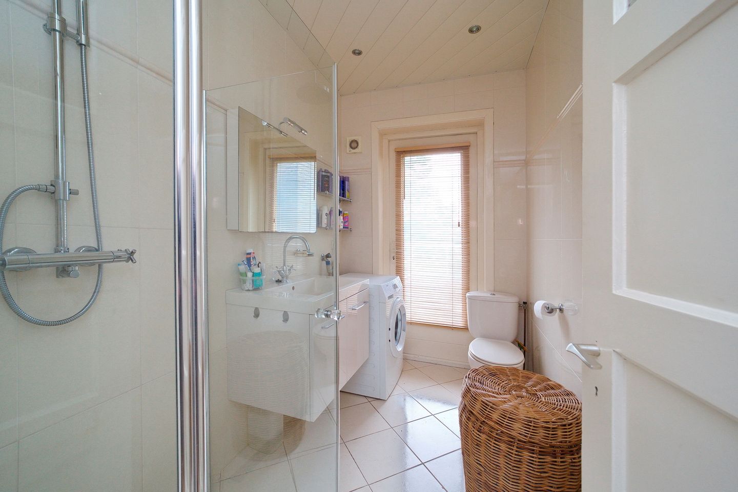 1e Verdieping: Met vaste houten trap wordt de 1e verdieping bereikt, waarop twee slaapkamers met laminaatvloer, beide met inbouwkast. Badkamer met tegelvloer en vloerverwarming, douchecabine met glazen wand, stortdouche, badmeubel met daarboven een spiegelkast, tweede toilet, wasmachine-aansluiting en deur naar lang achterbalkon.