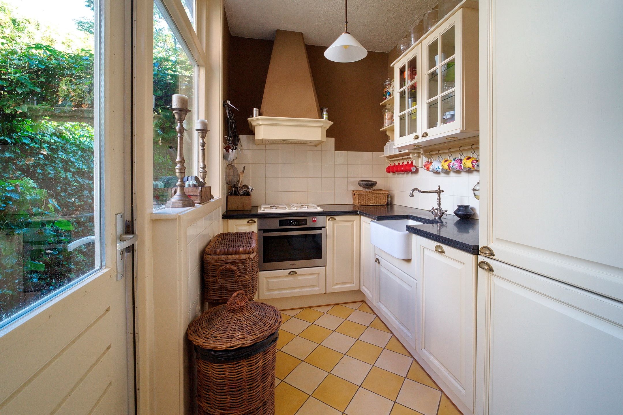 De gesloten keuken is in L-opstelling en is voorzien van een zwart natuurstenen aanrechtblad, inbouwapparatuur als gaskookplaat met afzuigkap, combi-oven, vaatwasser en koelkast met separaat drie vriesladen. De keuken heeft een groot zijraam en zijdeur naar de achtertuin.