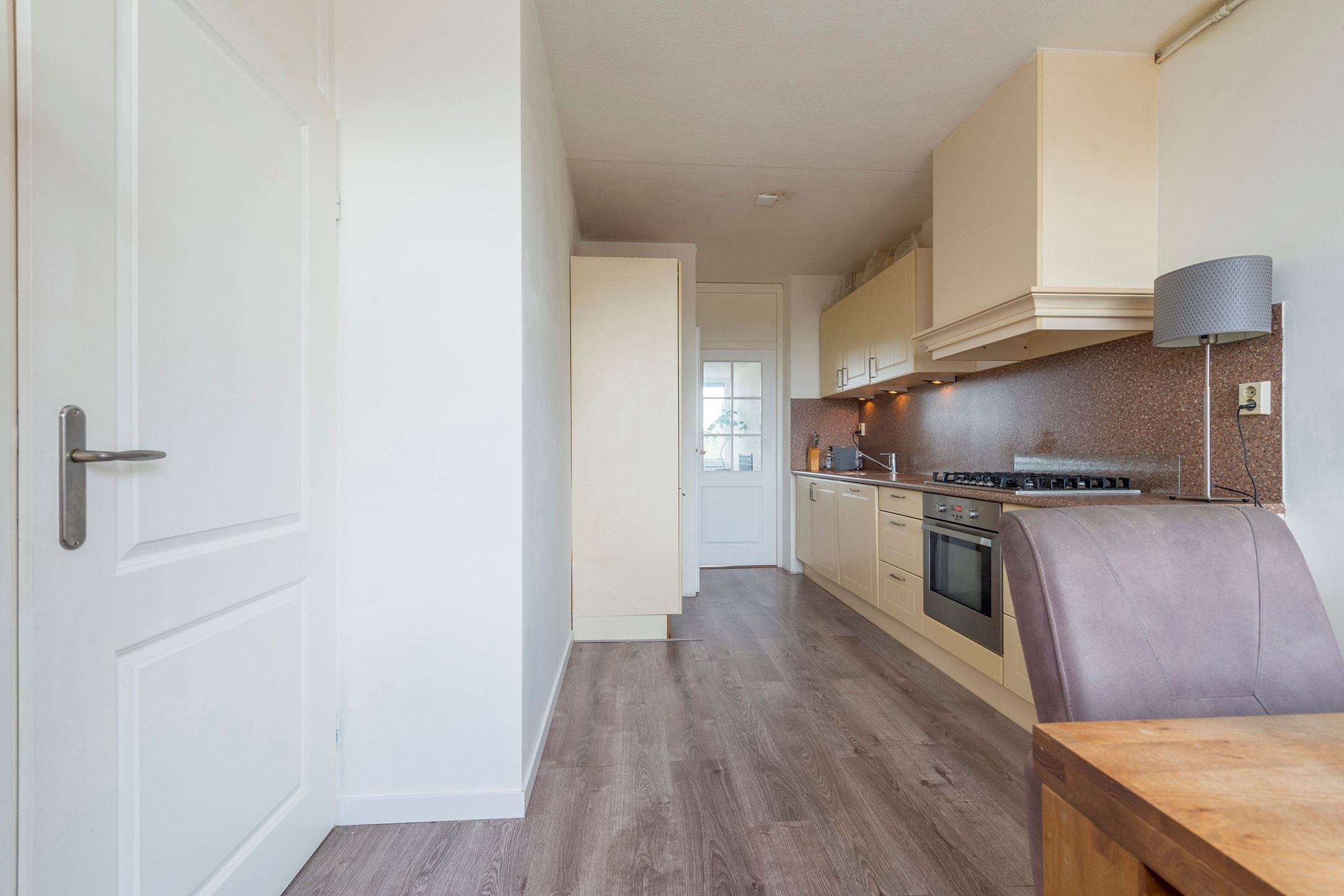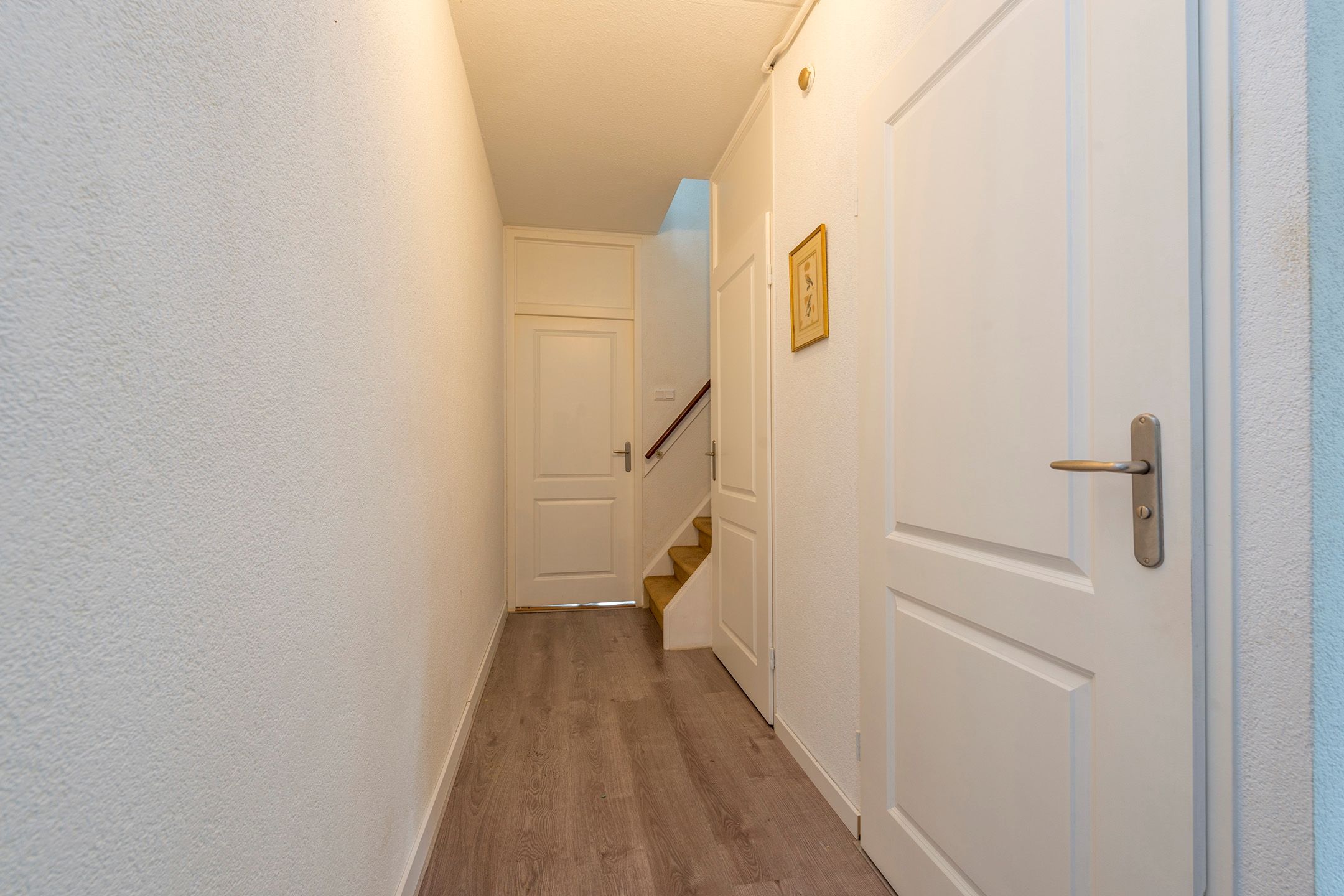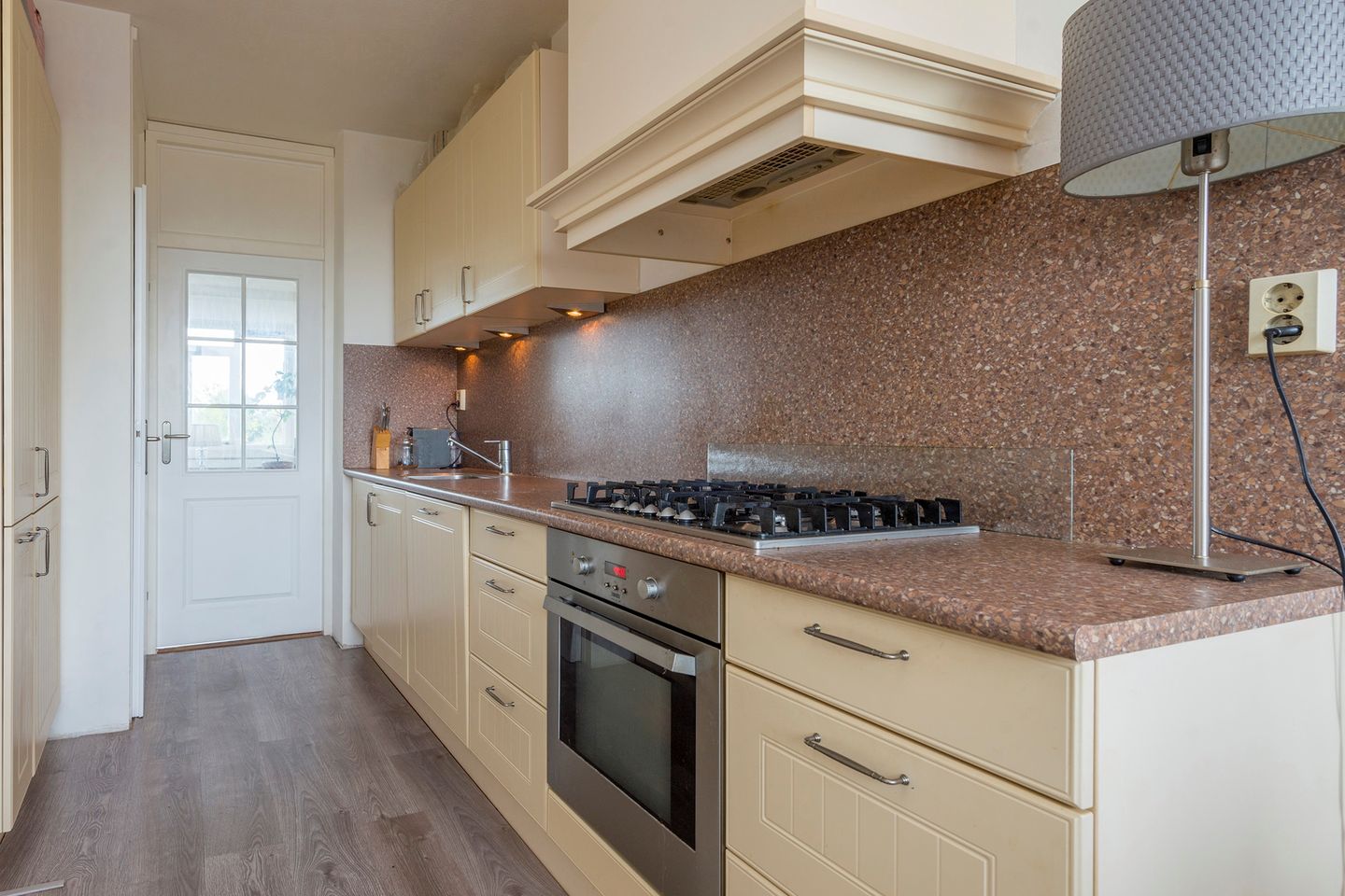 Aan de andere zijde van de keuken is een grote trapkast; deze biedt veel ruimte voor het opslaan van voorraad en andere zaken. In de keuken is er ook voldoende ruimte voor het plaatsen van de eethoek en heeft u via de raampartijen goed zicht naar buiten.