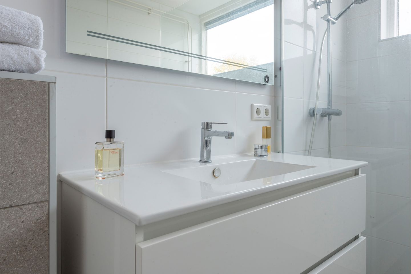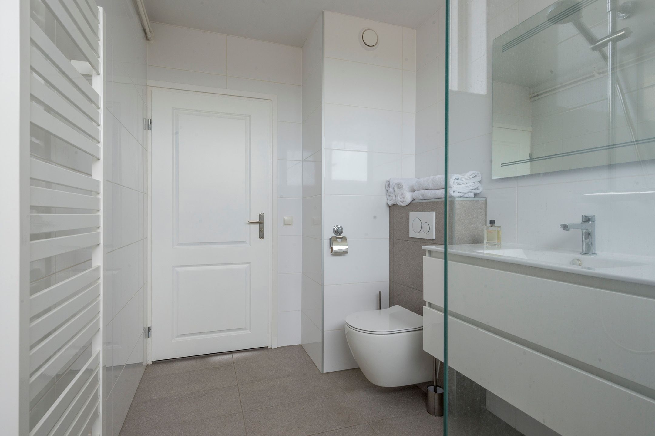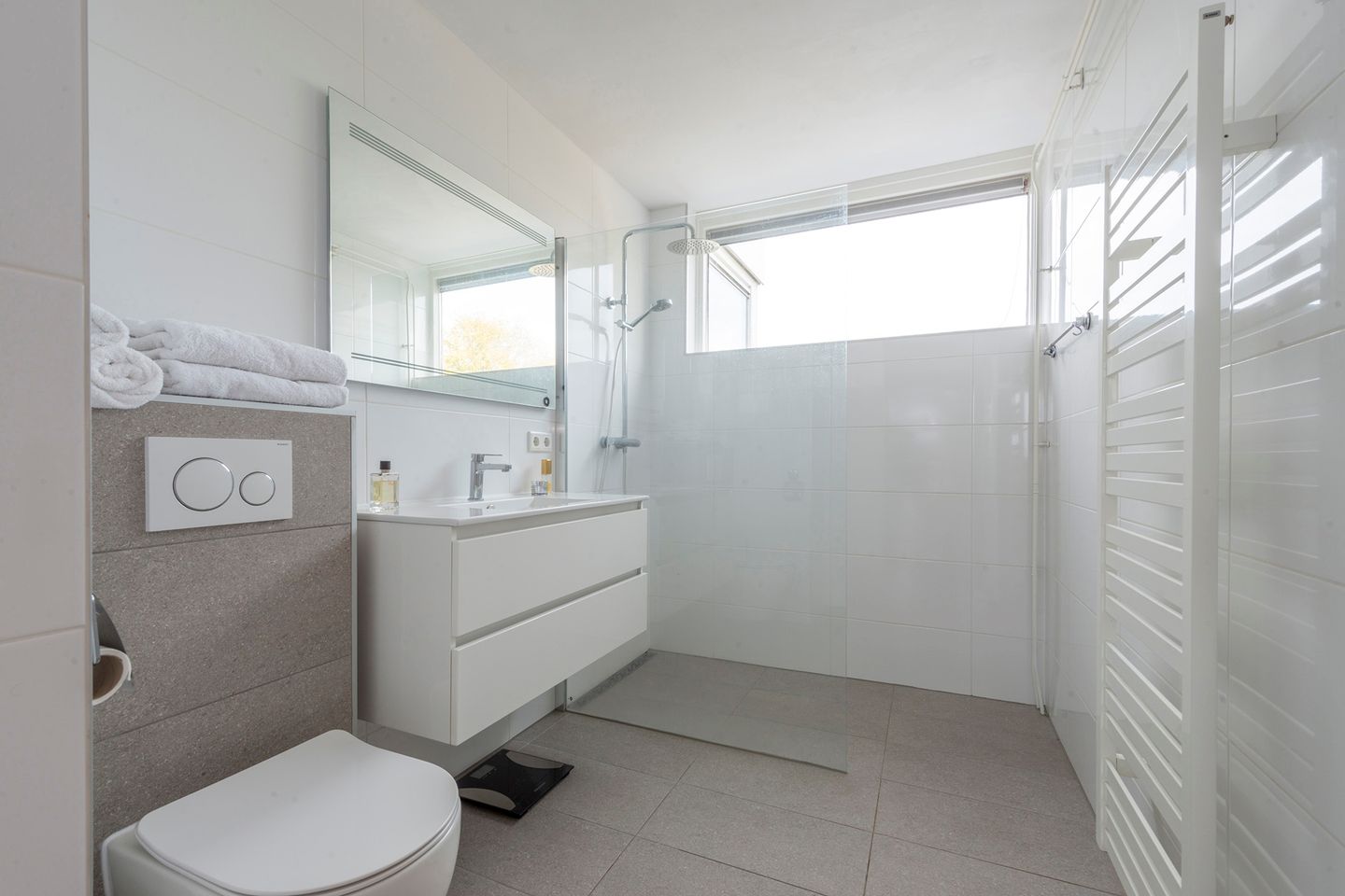 Vanuit de hal bereikt u via de trap de verdieping met een royale overloop, een brede wand voorzien van twee kasten en 3 slaapkamers: één royale slaapkamer aan de voorzijde en een grote- en iets kleinere slaapkamer aan de achterzijde, een luxe lichte badkamer met douche, glazen scheidingswand, fraai wastafelmeubel met twee laden en daarboven op gelijke breedte de spiegel met verwarming en uiteraard een tweede zwevend toilet en designradiator.