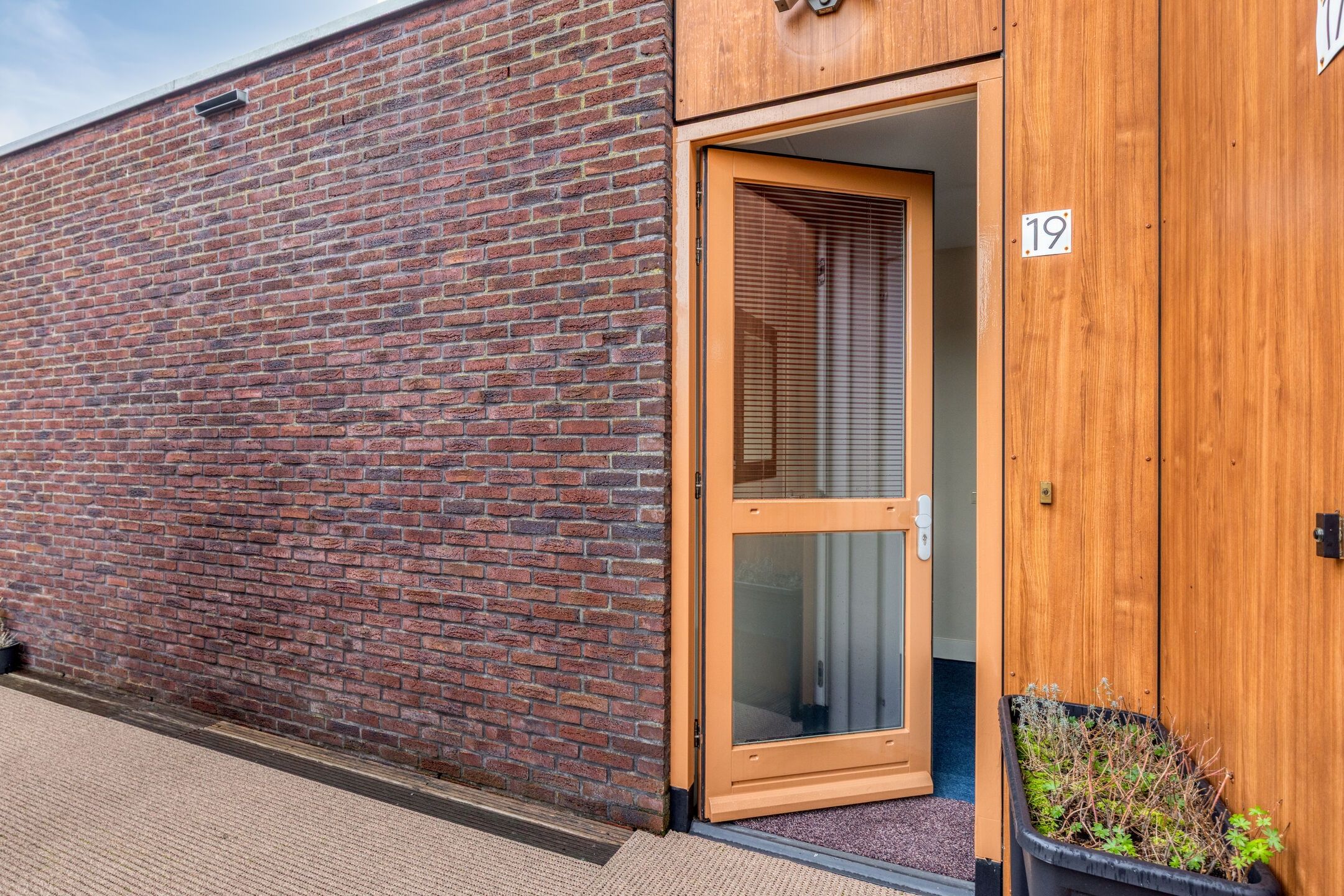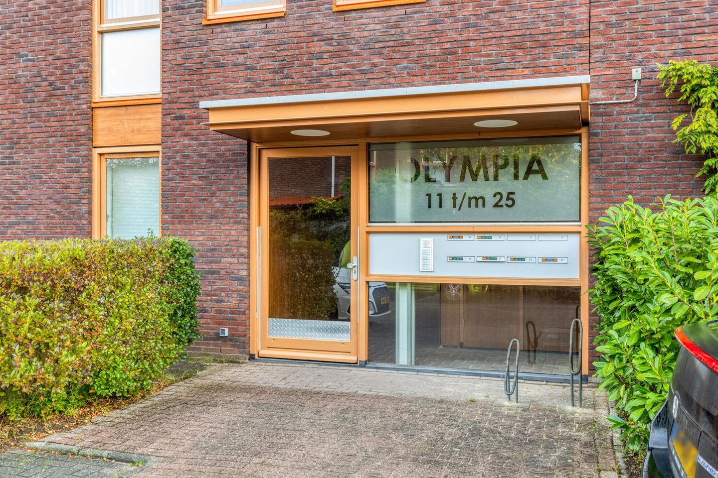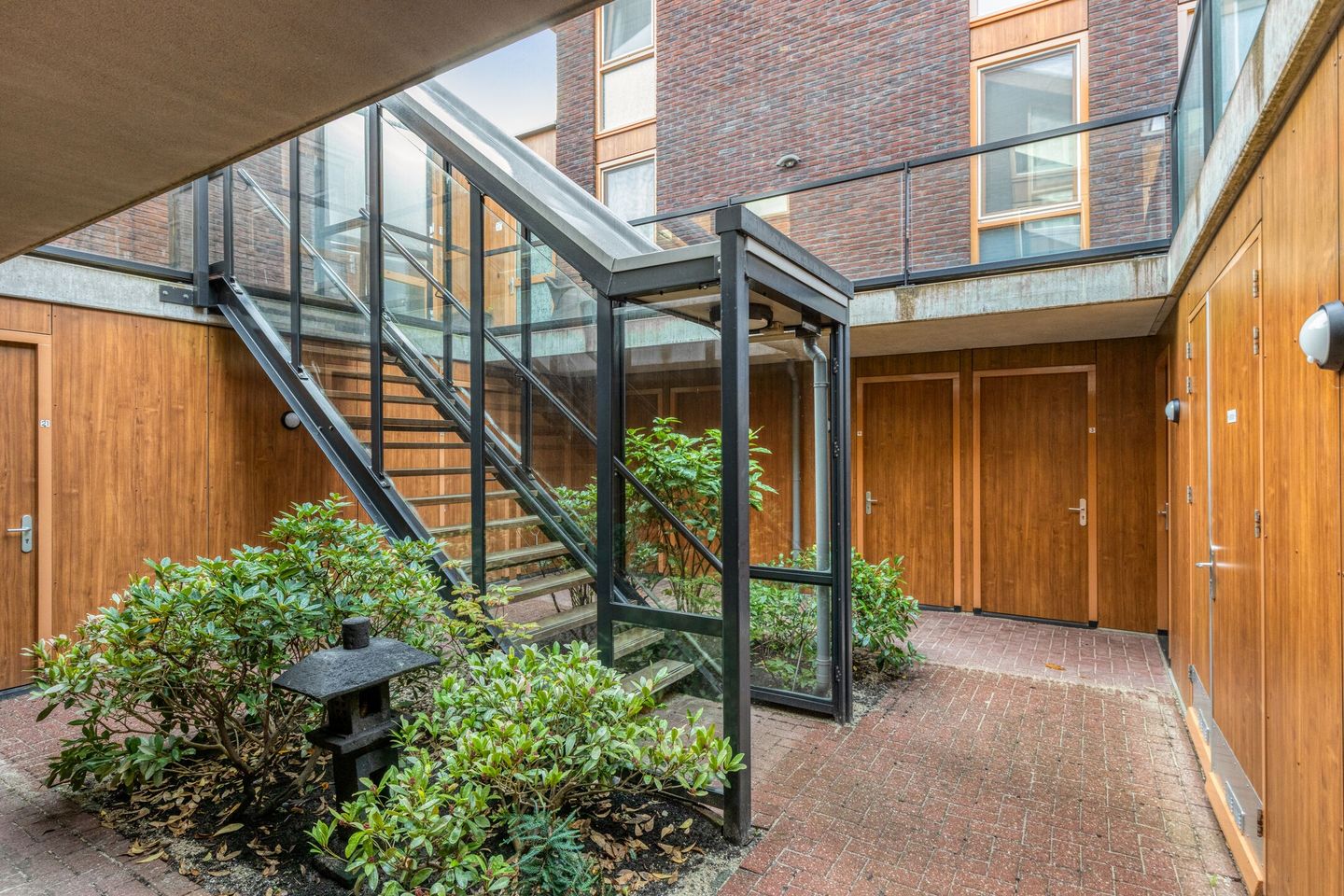 Entree via gesloten hal met intercom, nette binnenplaats en trapopgang.
