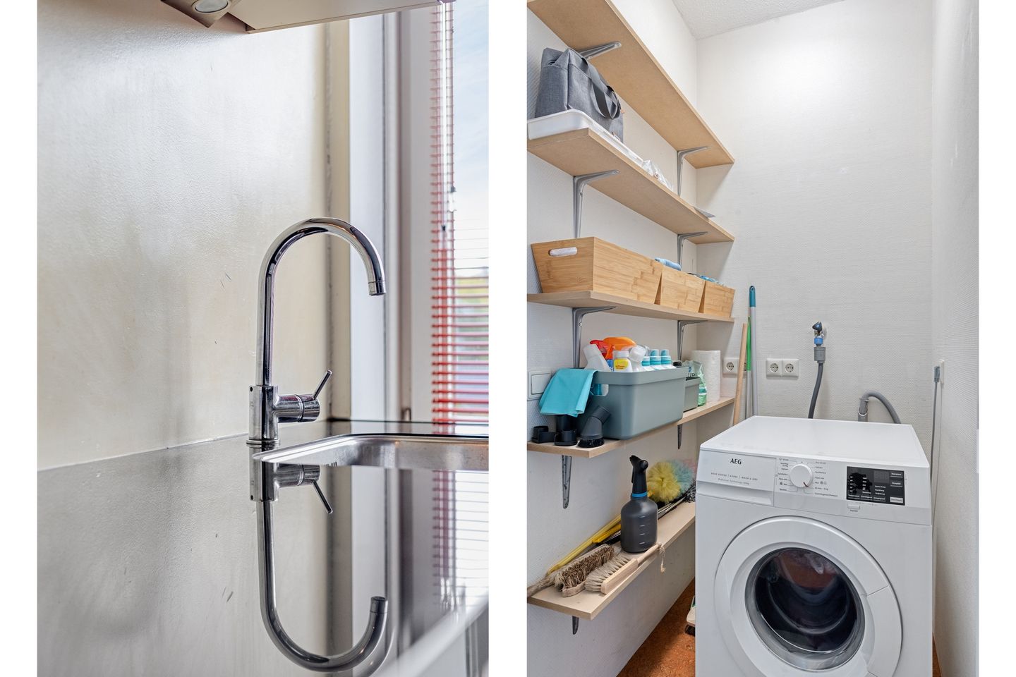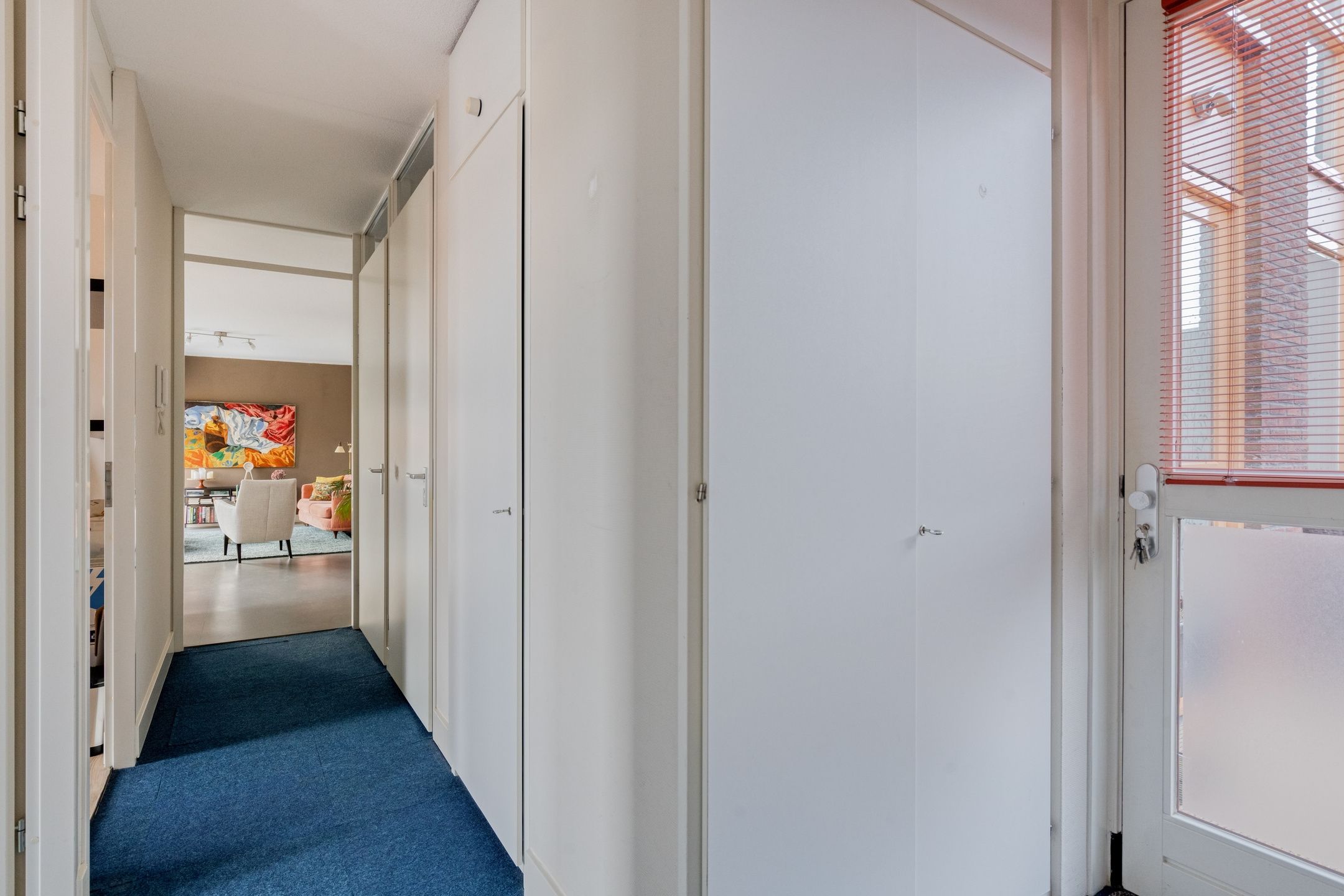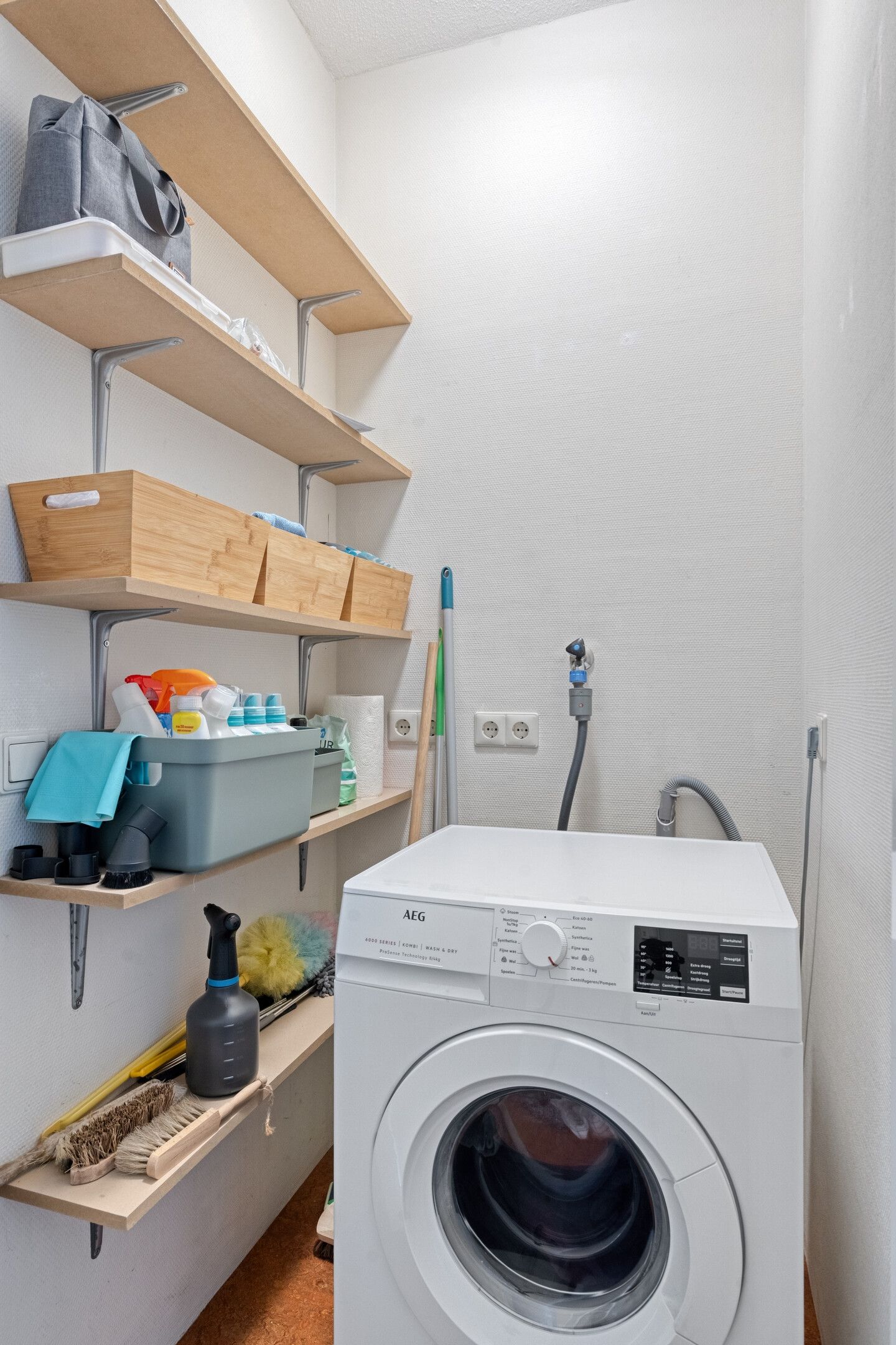 Ruime hal met garderobe, meterkast en handige inbouwkast voor wasmachine en droger.