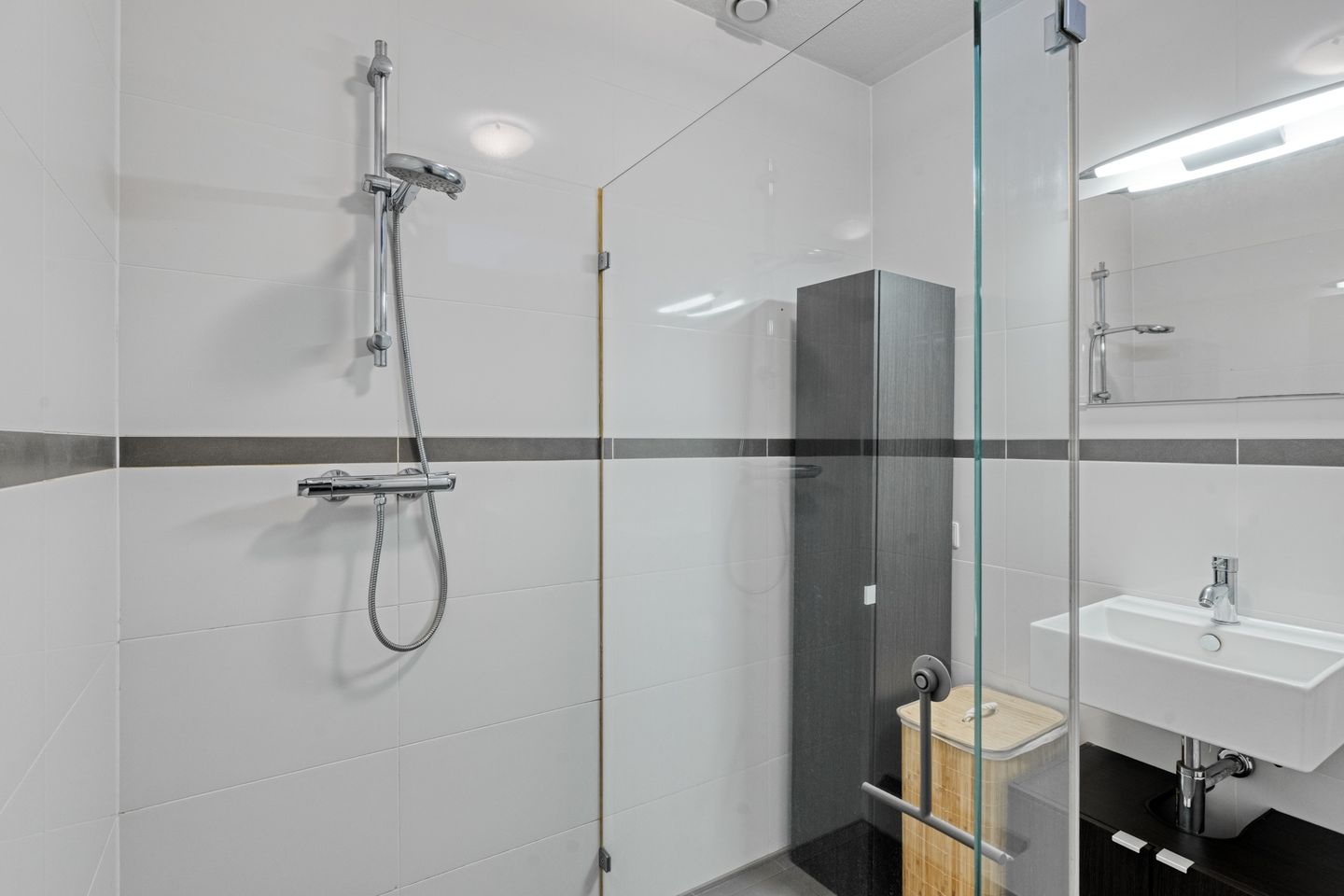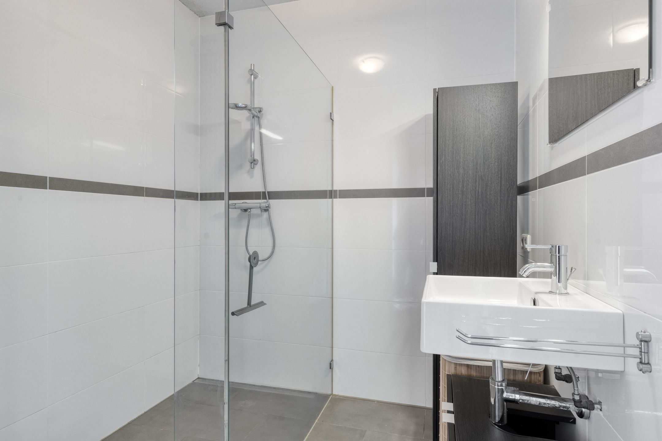 Nette badkamer met inloopdouche en wastafelmeubel.