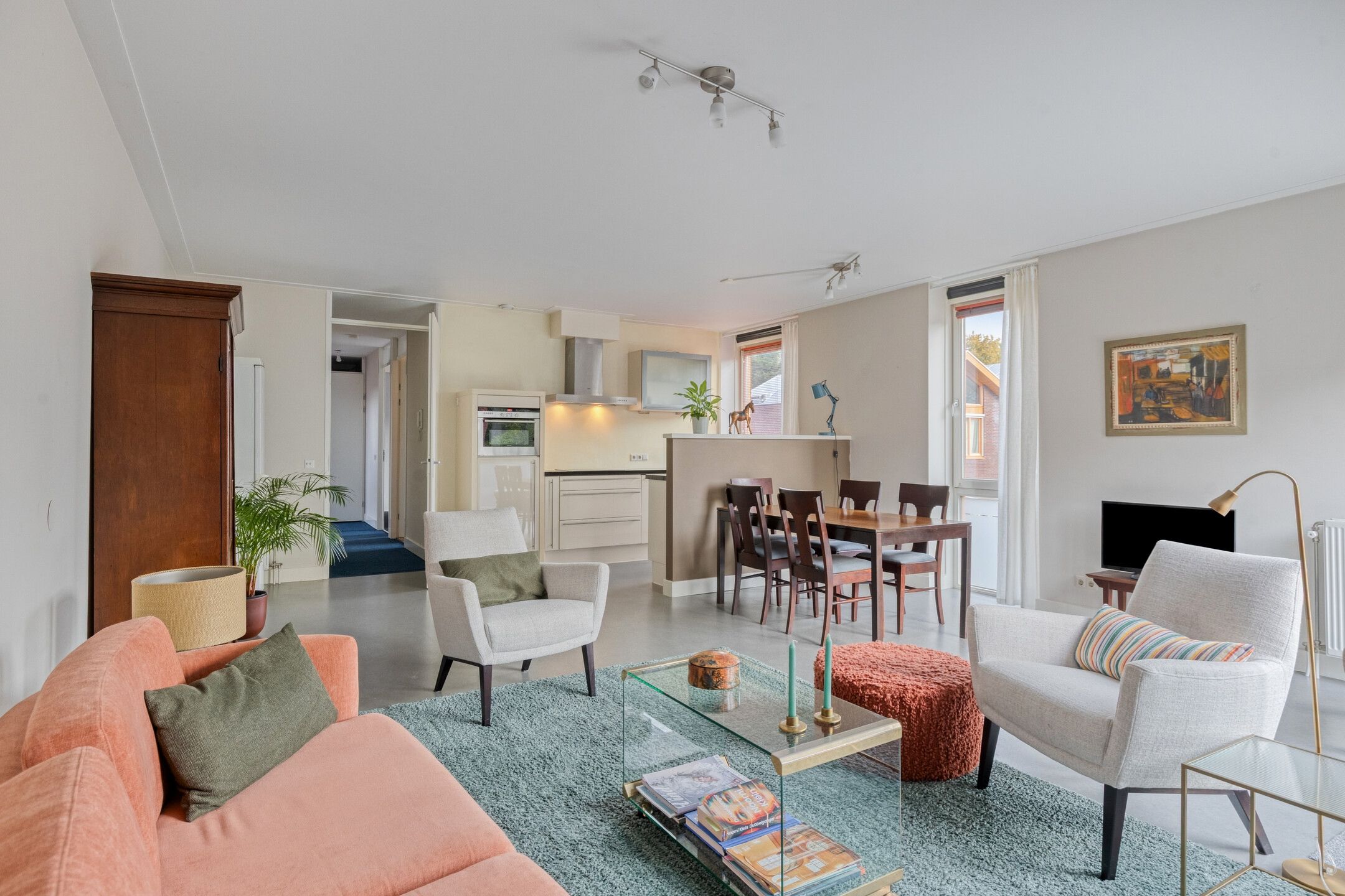 Lichte woonkamer met grote ramen aan twee zijden en een open verbinding met de moderne keuken.