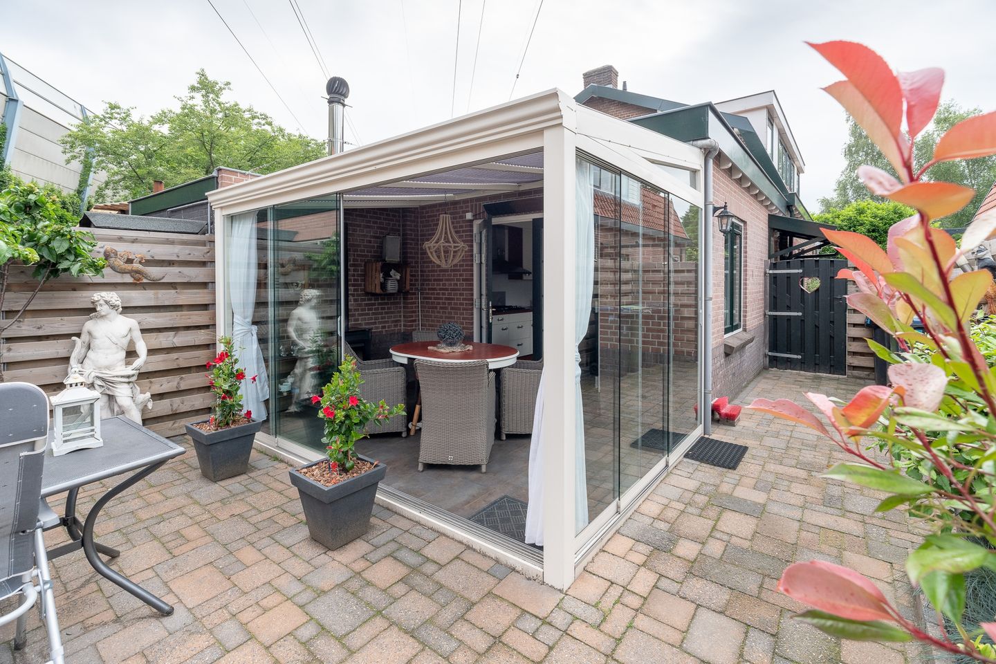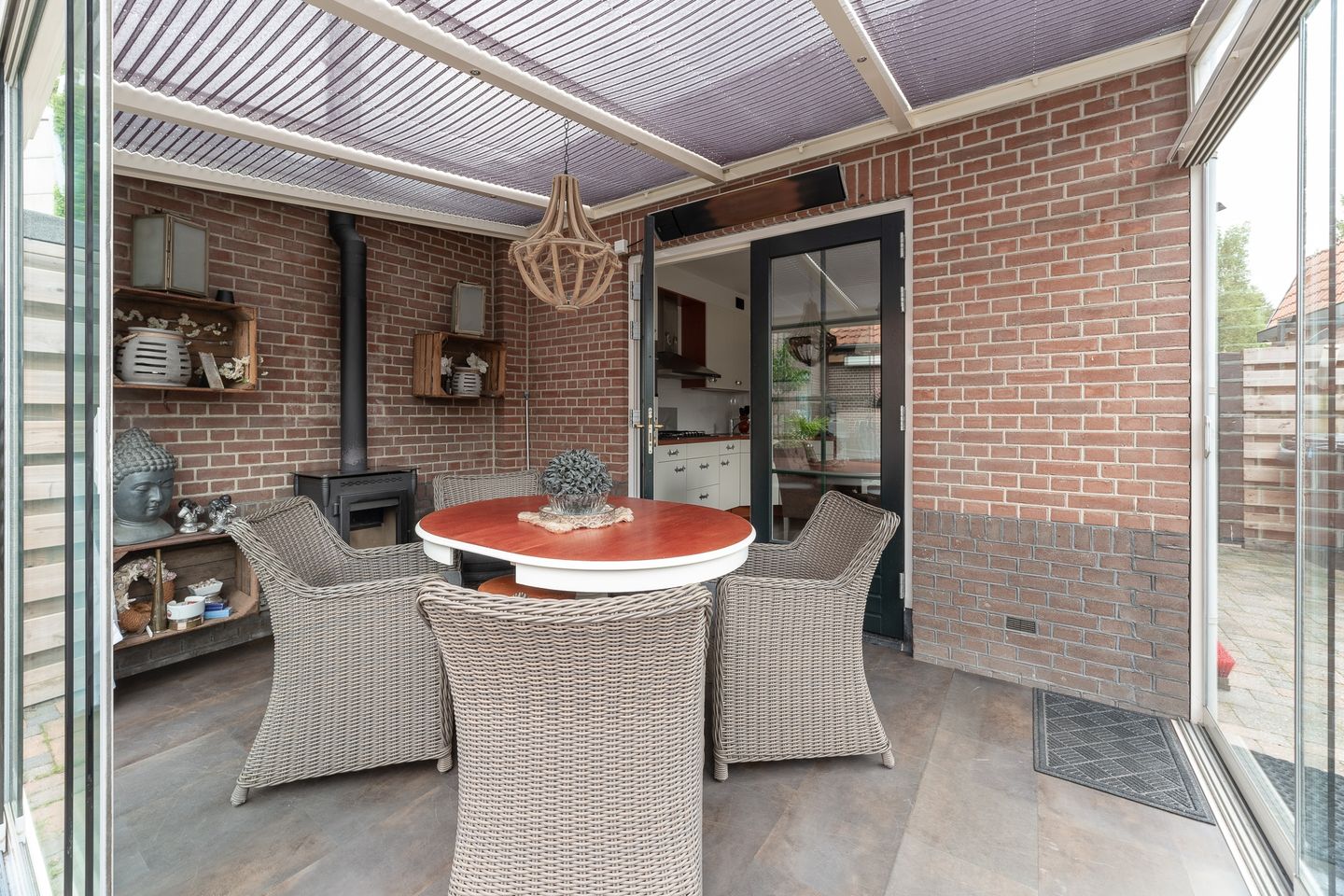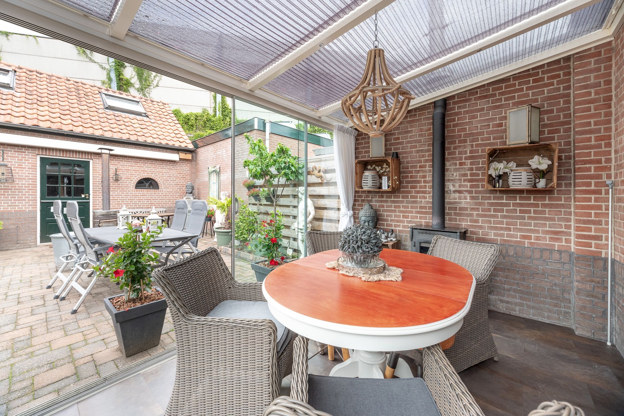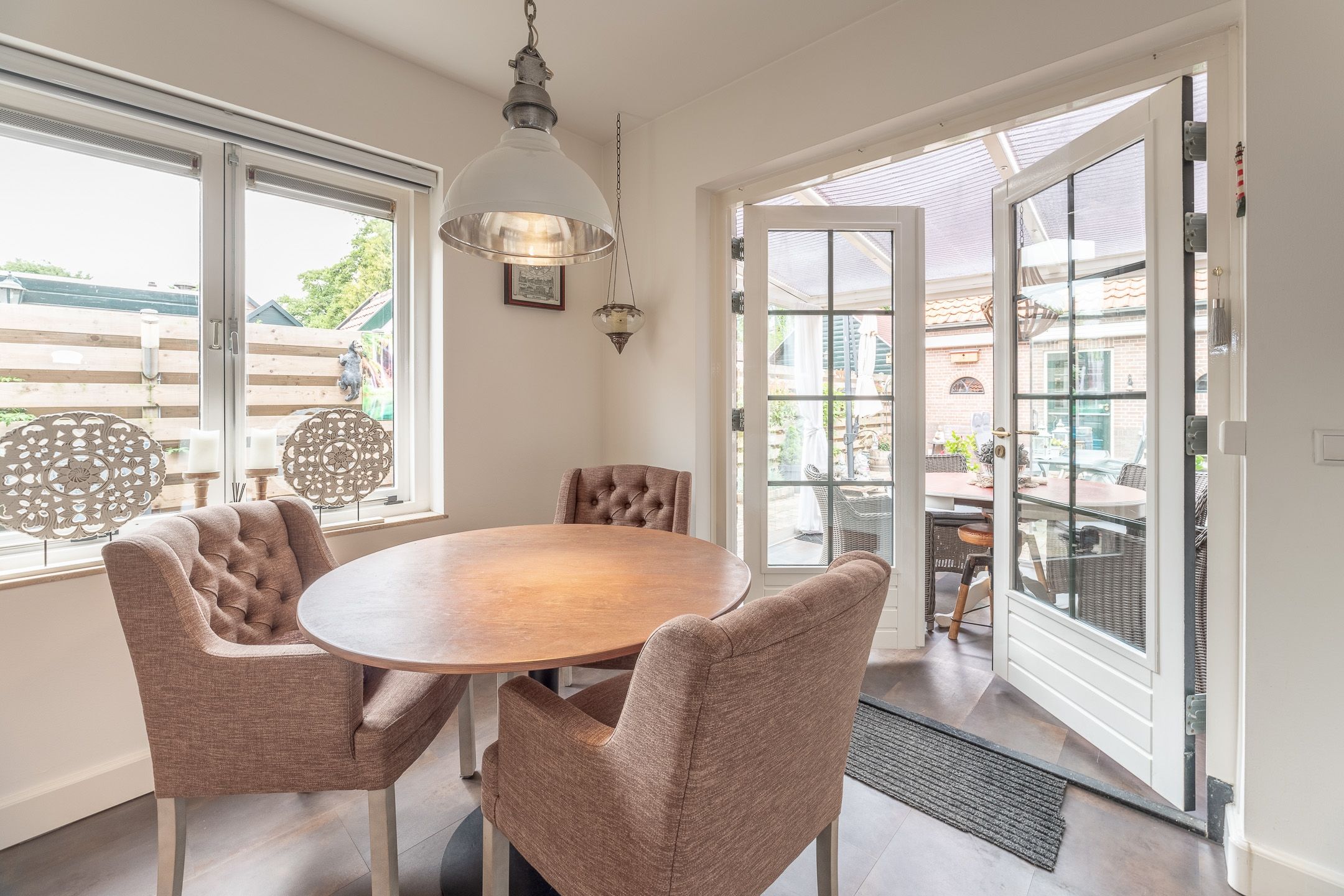 Begane grond: entree aan zijkant van de woning: hal, modern toilet en naastgelegen in zelfde stijl moderne badkamer met douche, wastafelmeubel met spiegelkast, vanuit de hal loopt u direct de woonkamer binnen met zowel aan voor- als zijkant grote raampartijen, waardoor veel lichtinval, de ramen zijn aan de buitenzijde voorzien van sfeerbepalende houten luiken; de vloer in de woonkamer is van PVC met brede lamellen en beschikt aan voorzijde over een haardblokken kachel; aan andere zijde van de hal bevindt zich de aangebouwde moderne woonkeuken, eveneens met PVC-vloer en voorzien van alle moderne inbouwapparatuur, gaskookplaat, afzuigkap, vaatwasser, combi-oven/magnetron, koelkast met vriesladen; aangrenzend aan de keuken loopt u via de openslaande deuren naar de “glazen” serre met de achtertuin. De serre heeft verschuifbare panelen welke u aan diverse zijden kunt openen en ook een haardblokken kachel, zodat u daar het gehele jaar door prettig gebruik van kunt maken.