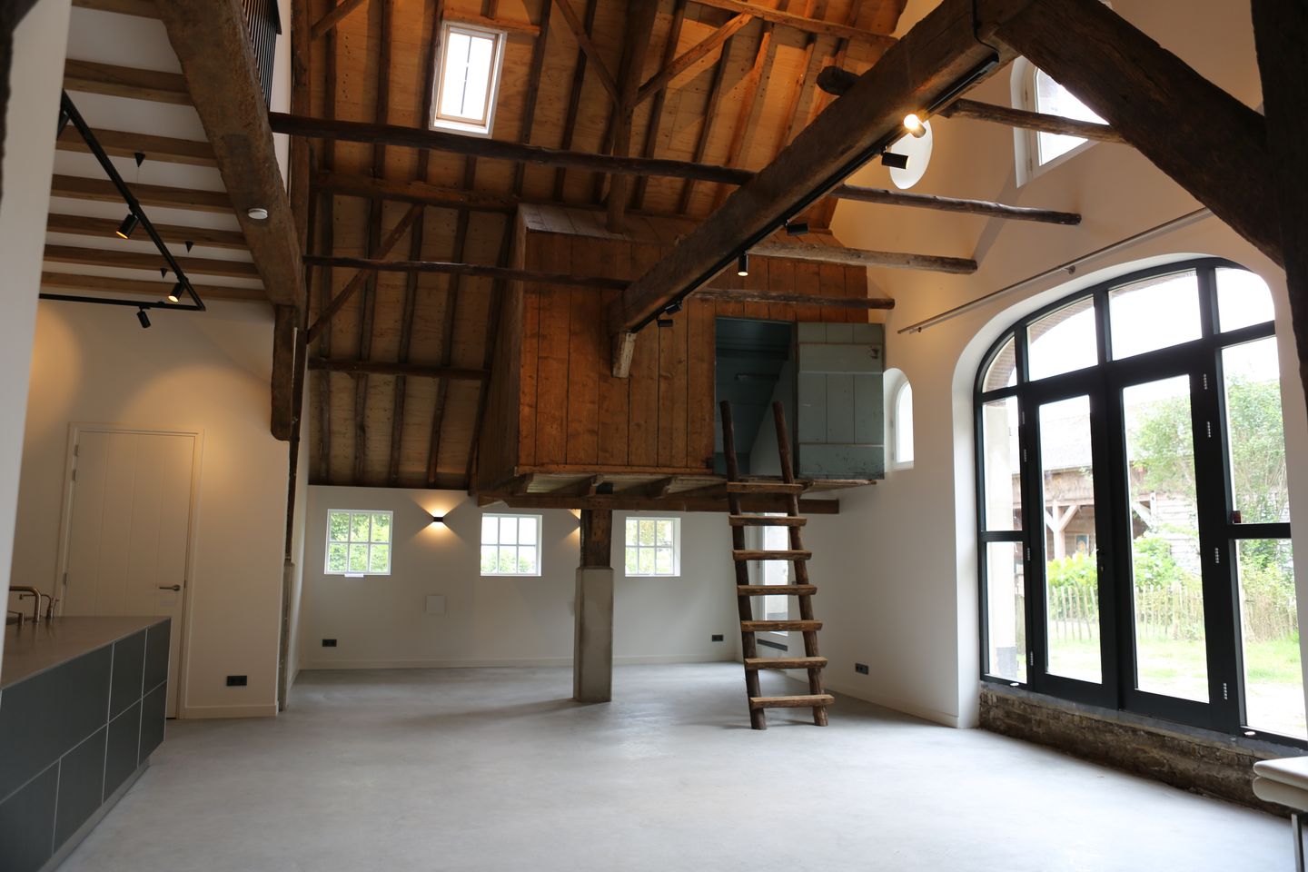 Hal met garderobe, meterkast, trapopgang en toilet met fonteintje. Ruime living met open keuken voorzien van inbouwapparatuur w.o. een dubbele koelkast, combi oven, vaatwasser en kookeiland met inductiekookplaat, afzuigkap en spoelbak. Het ruimtelijk gevoel wordt versterkt door de stoere balken, de nokhoogte en de diverse “boeren”-ramen en openslaande staldeuren naar de tuin. Tegen de nok is een zogenaamde knechtenkamer met houten trap behouden als origineel detail. Met daarin nog de originele kleine bedstee. De tuingerichte woonkamer heeft een afgewerkte betonnen vloer met vloerverwarming. Er is een bijkeuken met aansluiting voor wasmachine/droger.