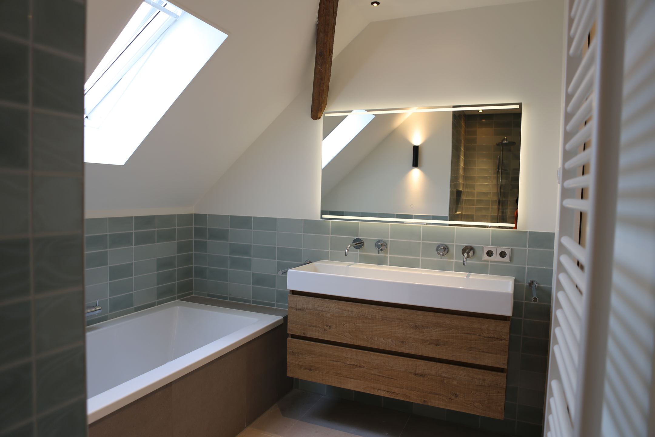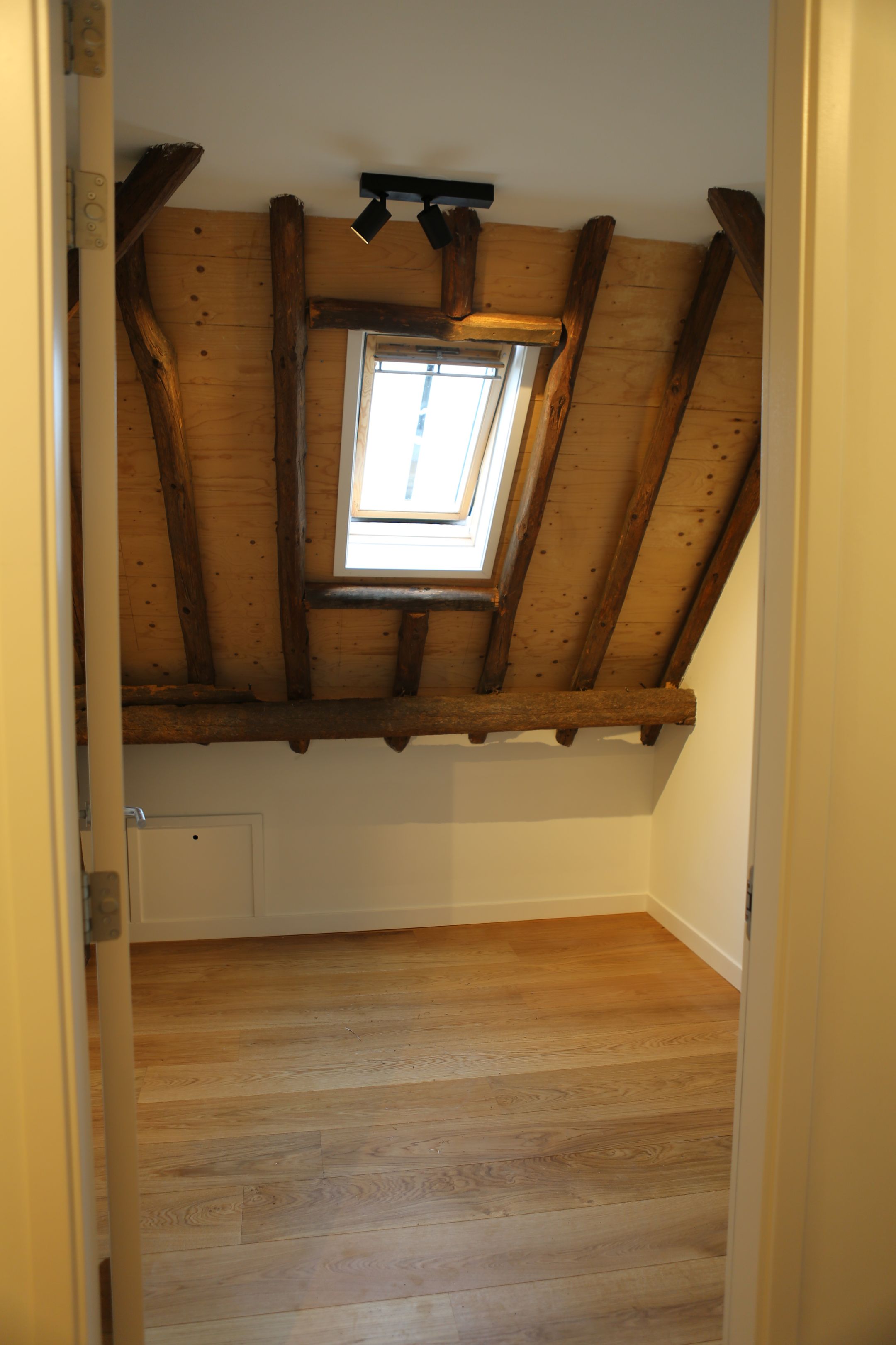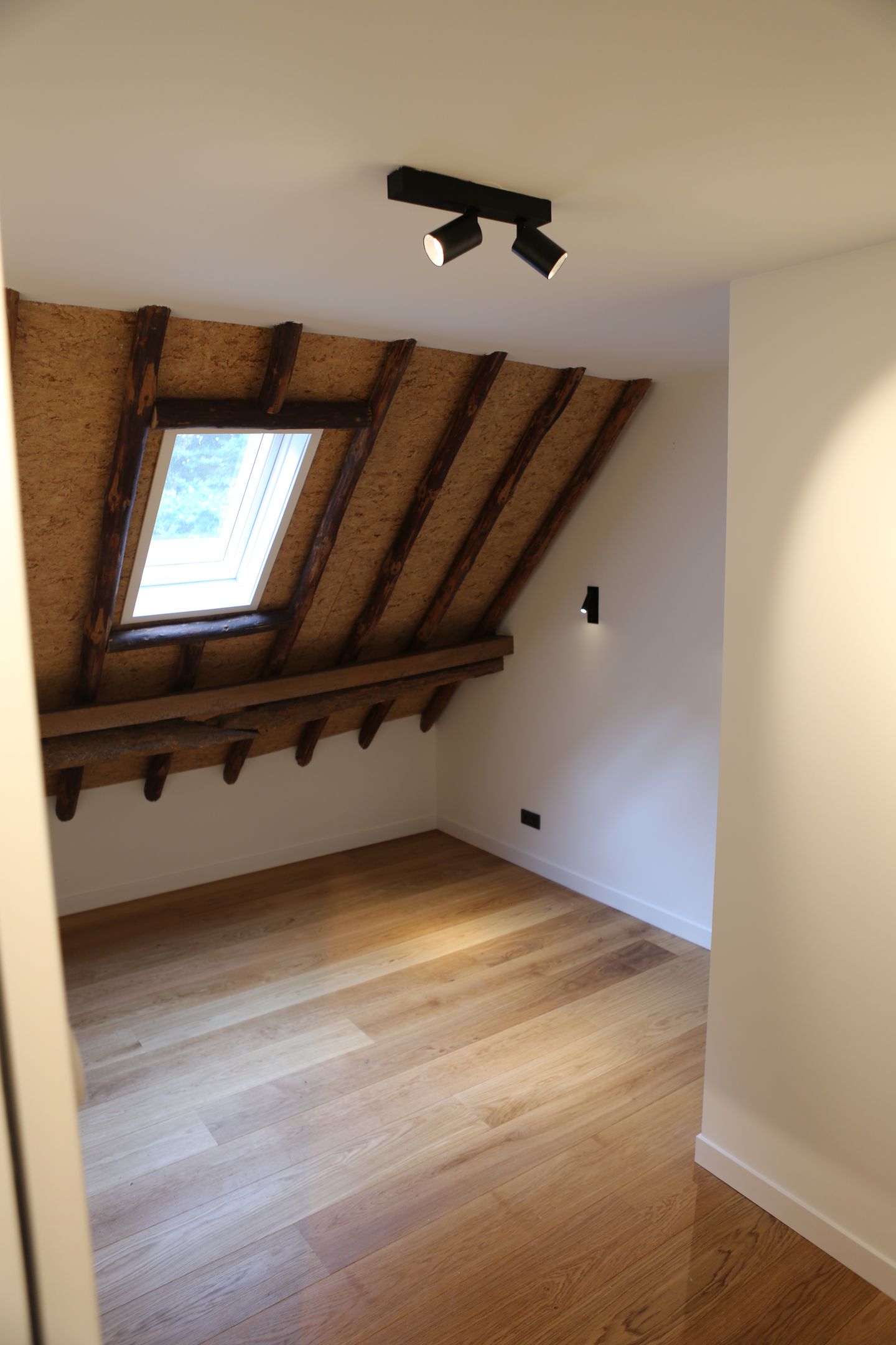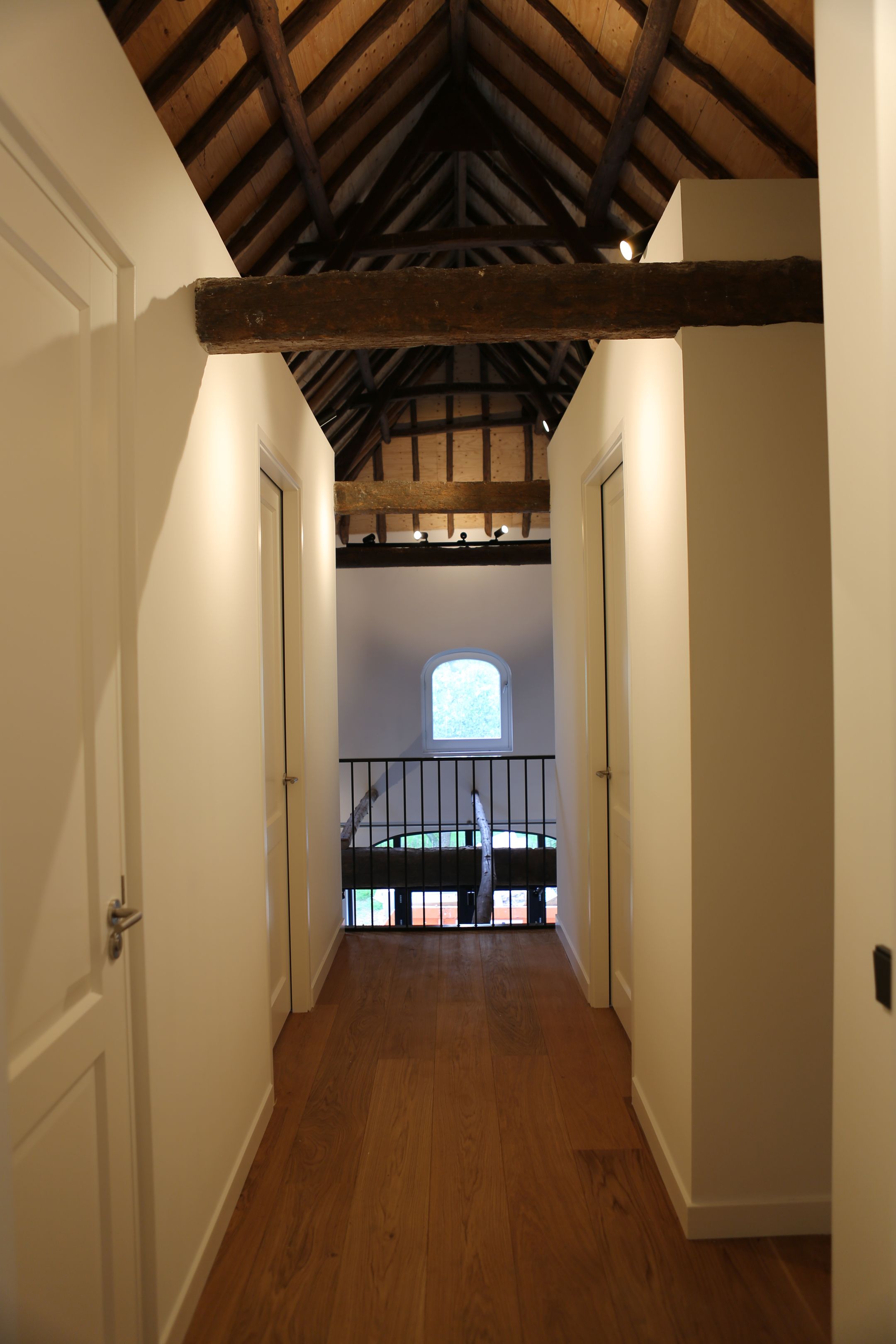 Overloop met vide, 3 slaapkamers uitgerust met dakramen en een eikenvloer ( 2 x 10m2 en 1 x 15m2), badkamer met dakraam, vloerverwarming, inloopdouche, wastafelmeubel, ligbad, 2e toilet en designradiator.
