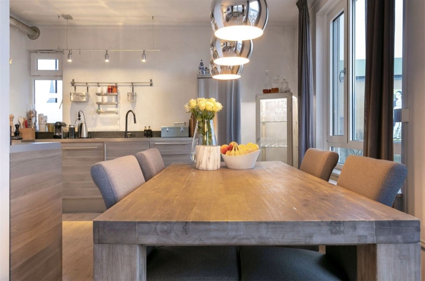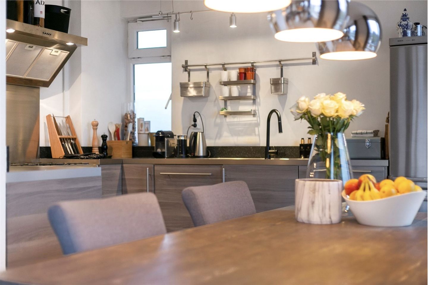De open keuken met moderne kasten op roestvrijstalen poten, veel werkoppervlak en voldoende ruimte voor losse apparatuur. De aansluiting voor de wasmachine bevindt zich ook in de keuken.