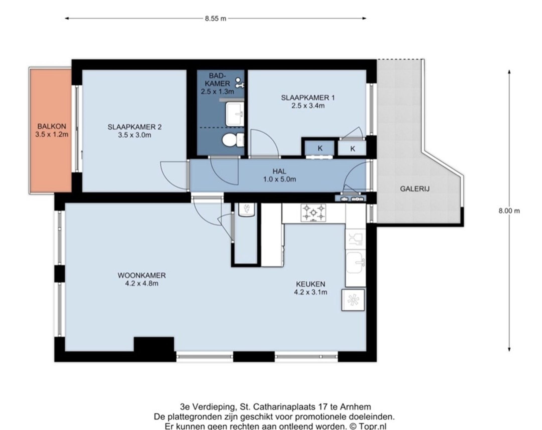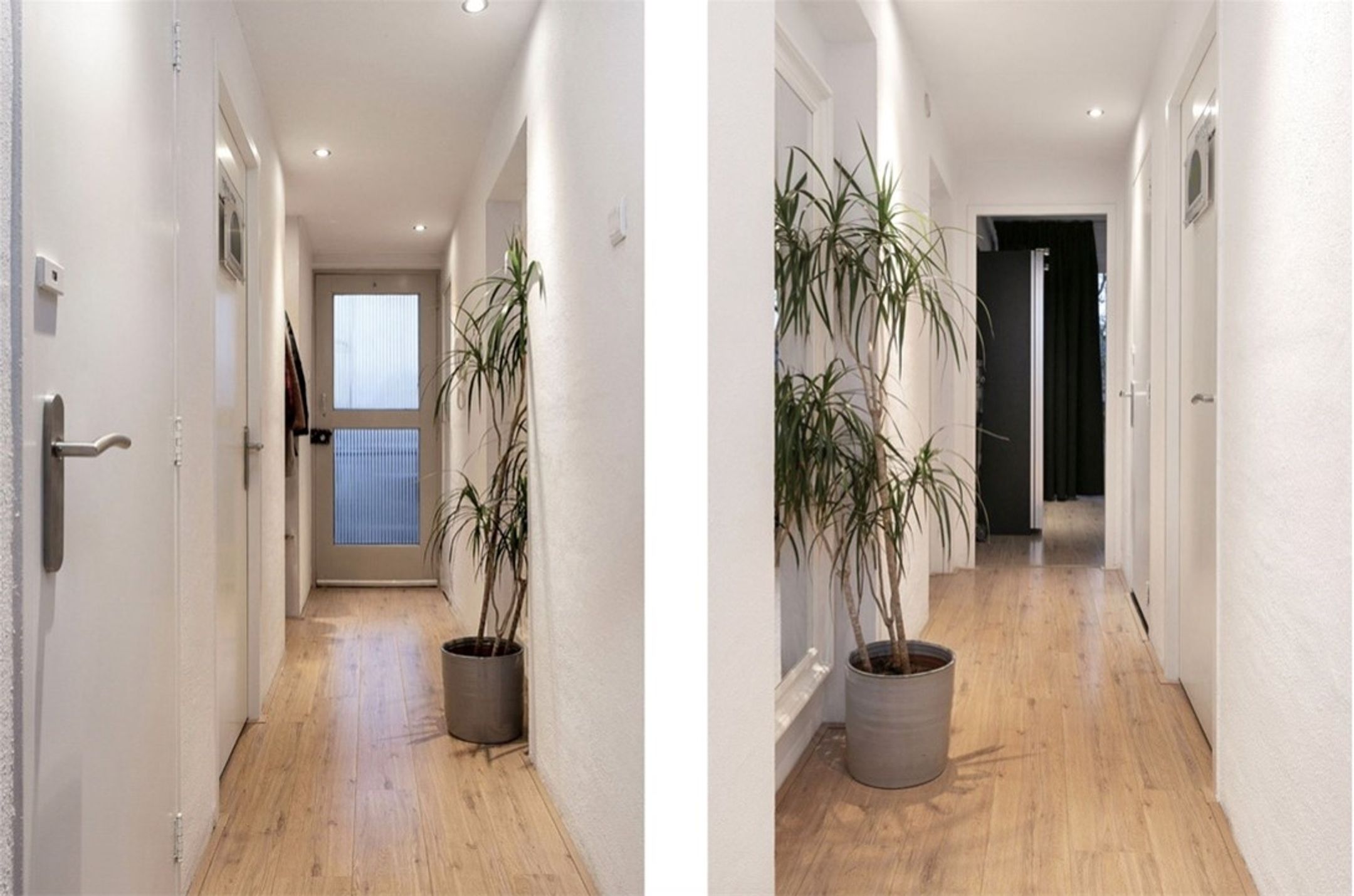 Via de galerij kom je het appartement binnen in de ruime hal, met inbouwkast en garderobe-nis en toegang naar de twee slaapkamers, de badkamer en de woonkamer met open keuken. De woning is functioneel en strak ingedeeld en in het hele appartement is veel lichtinval.