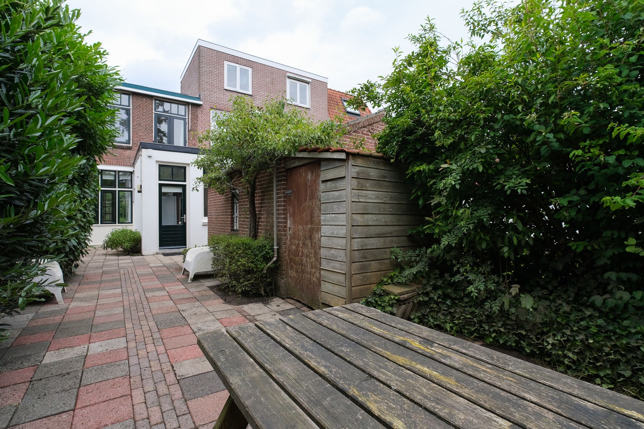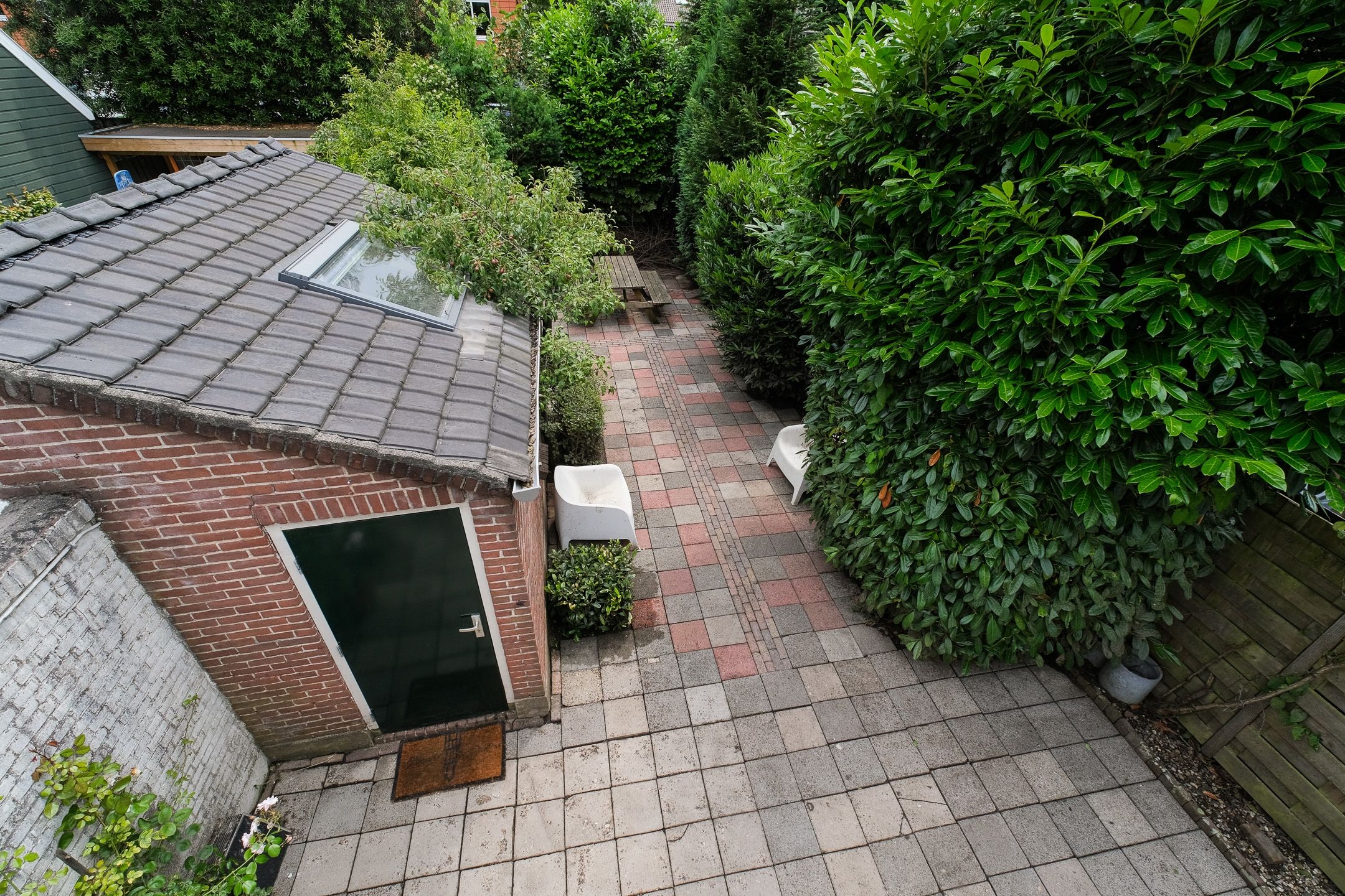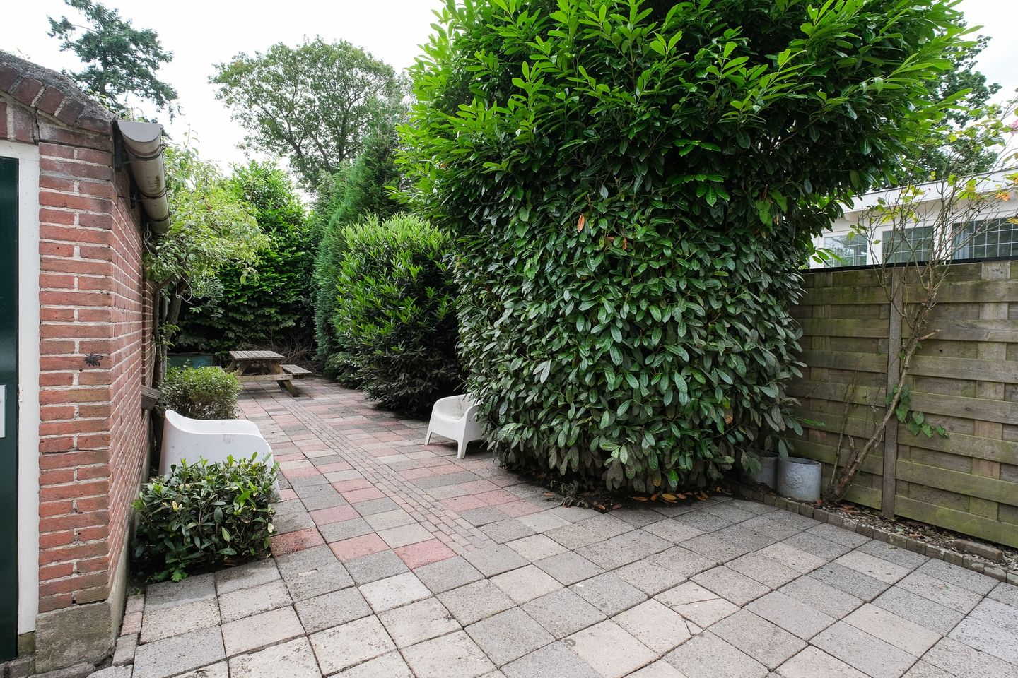 Een heerlijke diepe tuin met direct aan de achterzijde van de woning een beschutte plek, waar het al snel heerlijk toeven is!