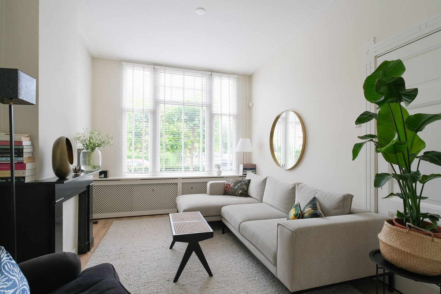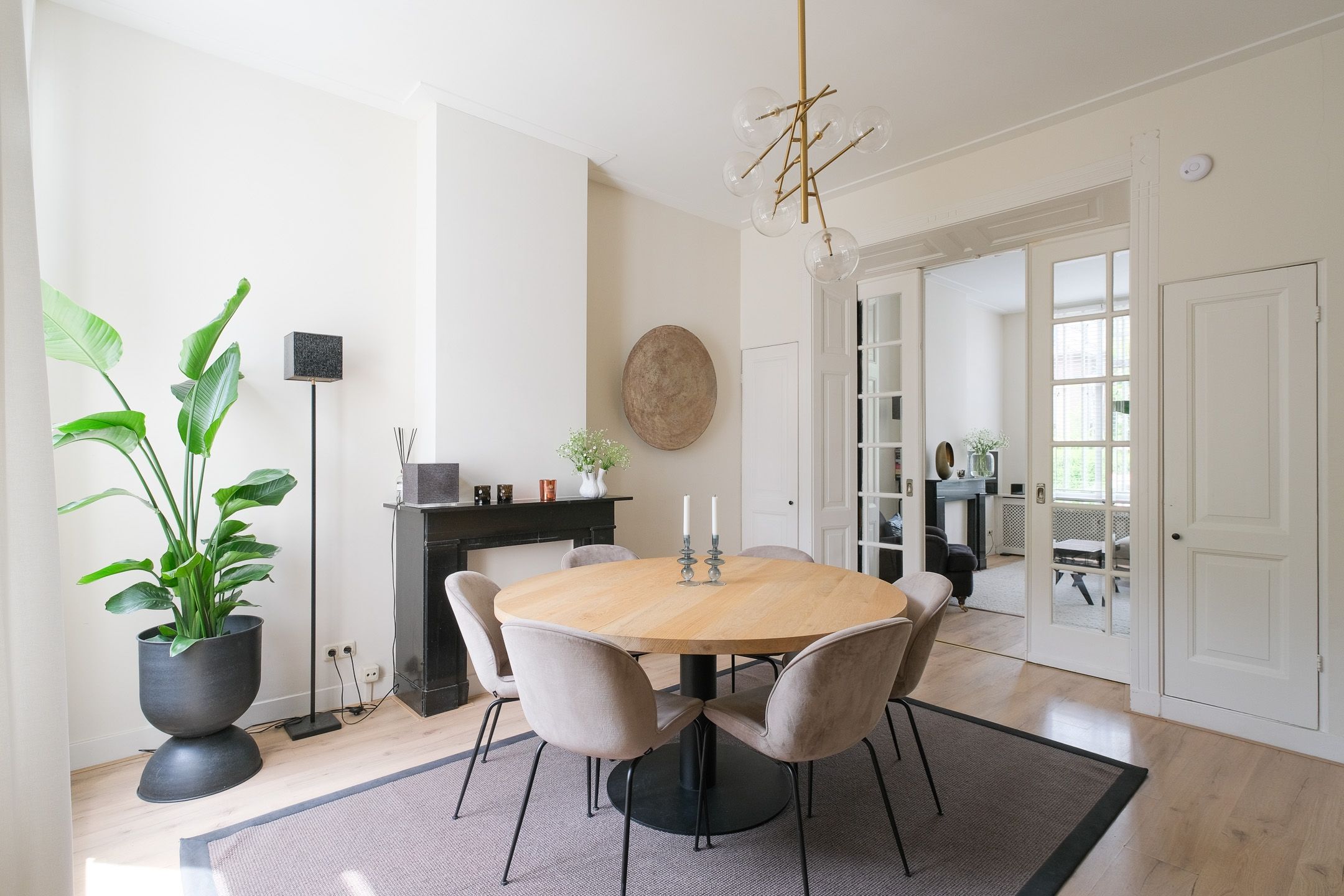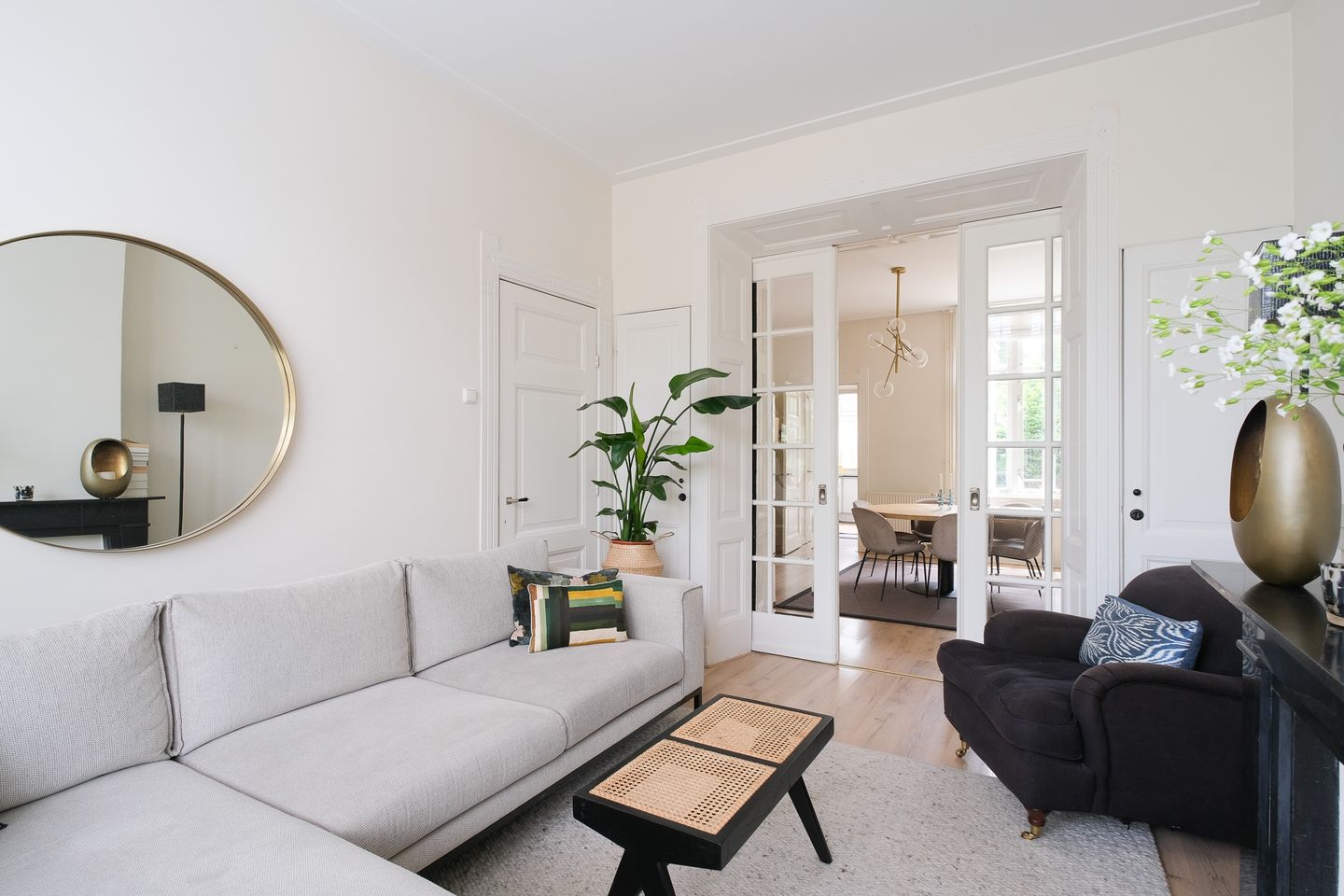 Woonkamer en suite met tweemaal een schouw, laminaatvloer, strak gestucte wanden, schuifdeuren met facet geslepen glas, welke de voor- en achterkamer scheiden met aan beide zijden authentieke inbouwkasten. De hoge plafonds en ramen geven de woon- en zitkamerkamer veel licht en een fijn ruimtelijk gevoel.