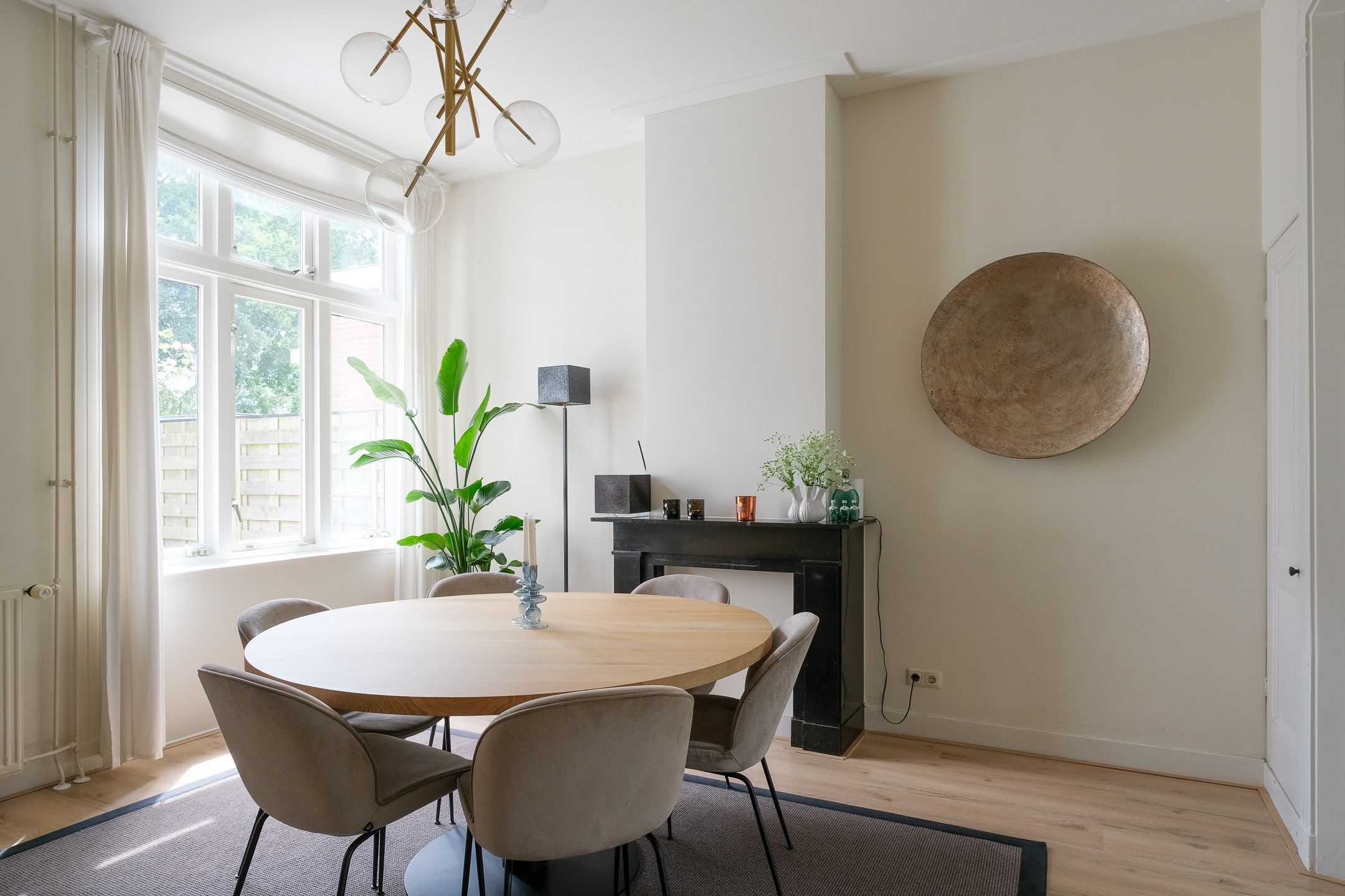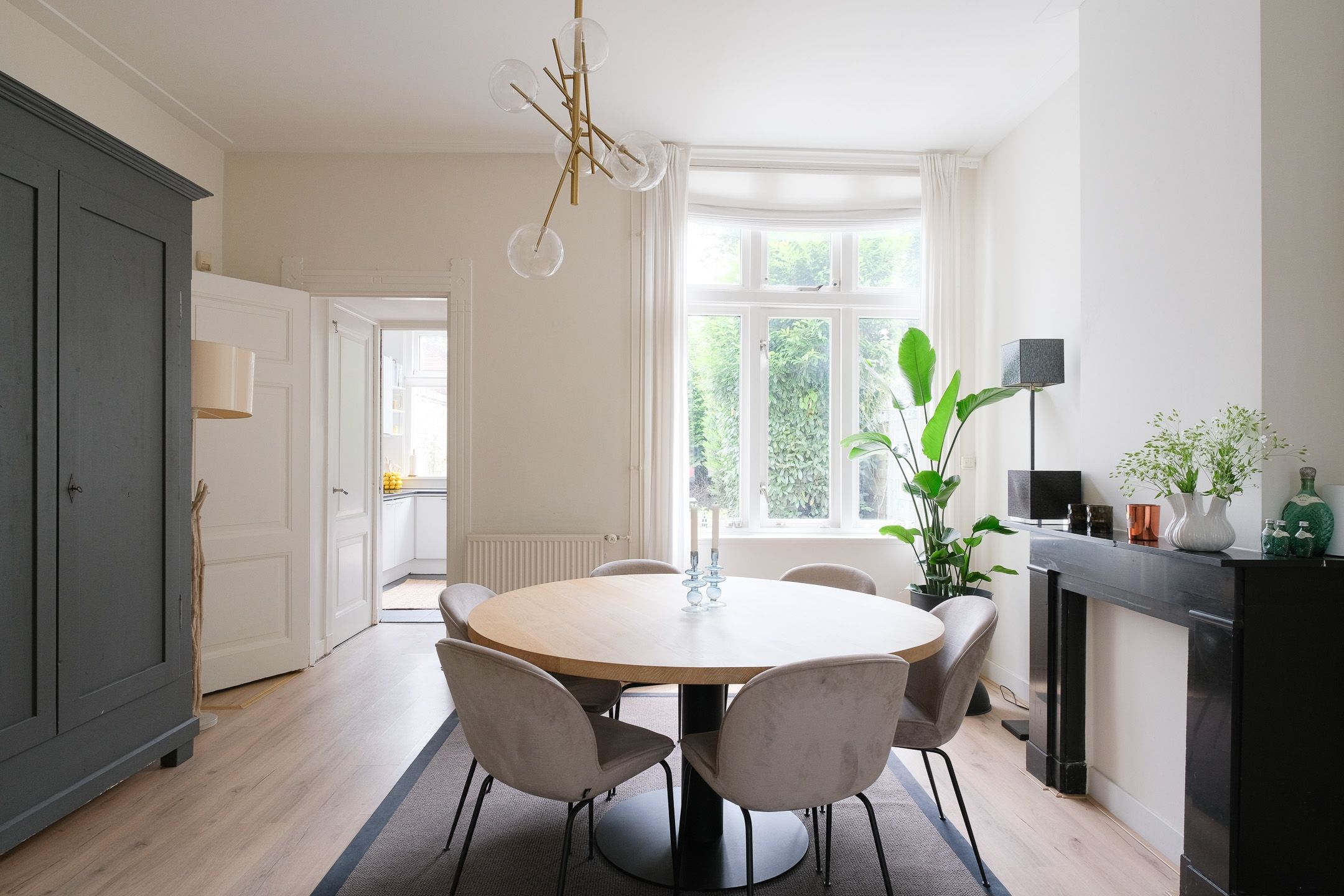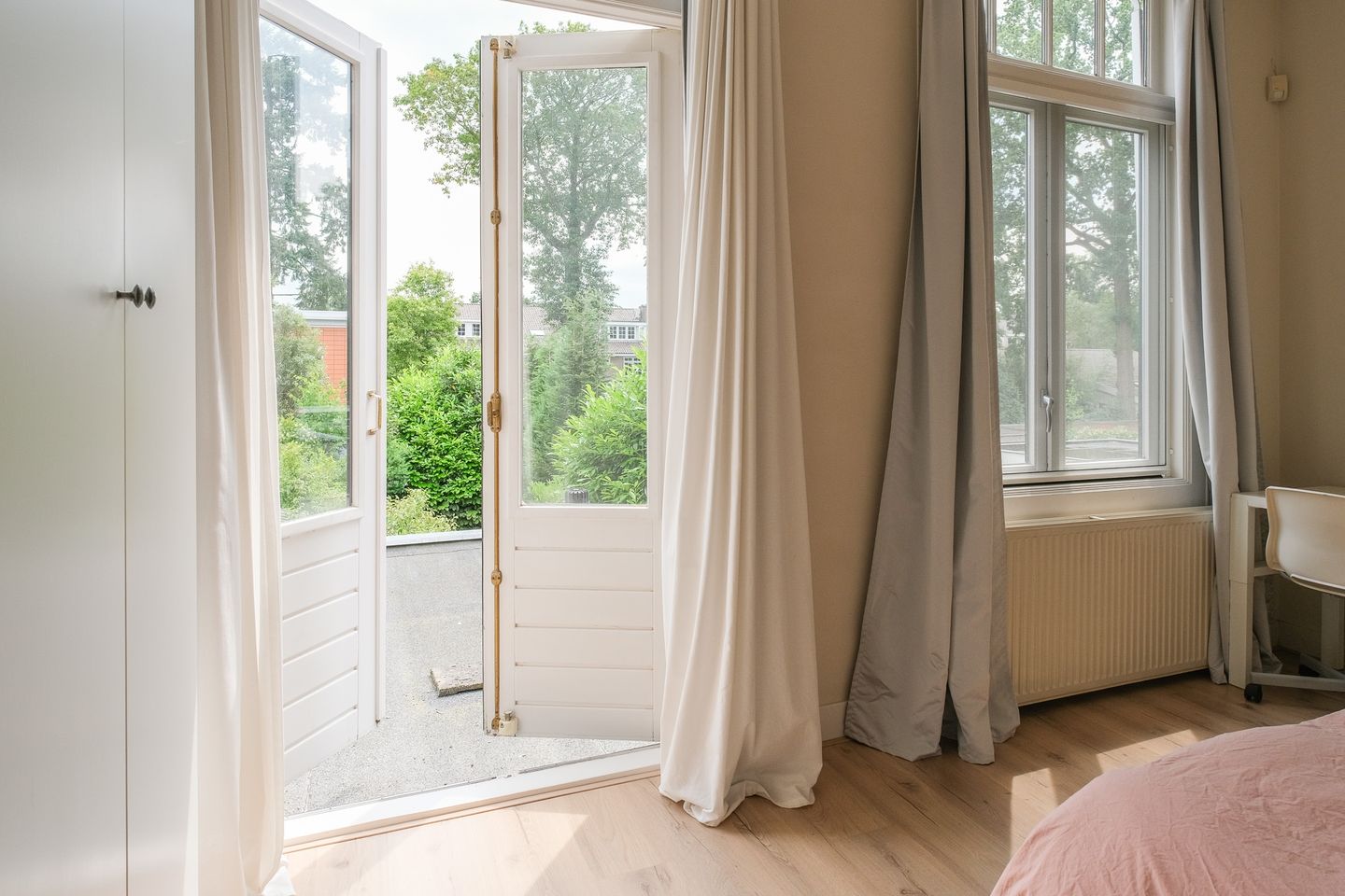 Woonkamer en suite met tweemaal een schouw, laminaatvloer, strak gestucte wanden, schuifdeuren met facet geslepen glas, welke de voor- en achterkamer scheiden met aan beide zijden authentieke inbouwkasten. De hoge plafonds en ramen geven de woon- en zitkamerkamer veel licht en een fijn ruimtelijk gevoel.