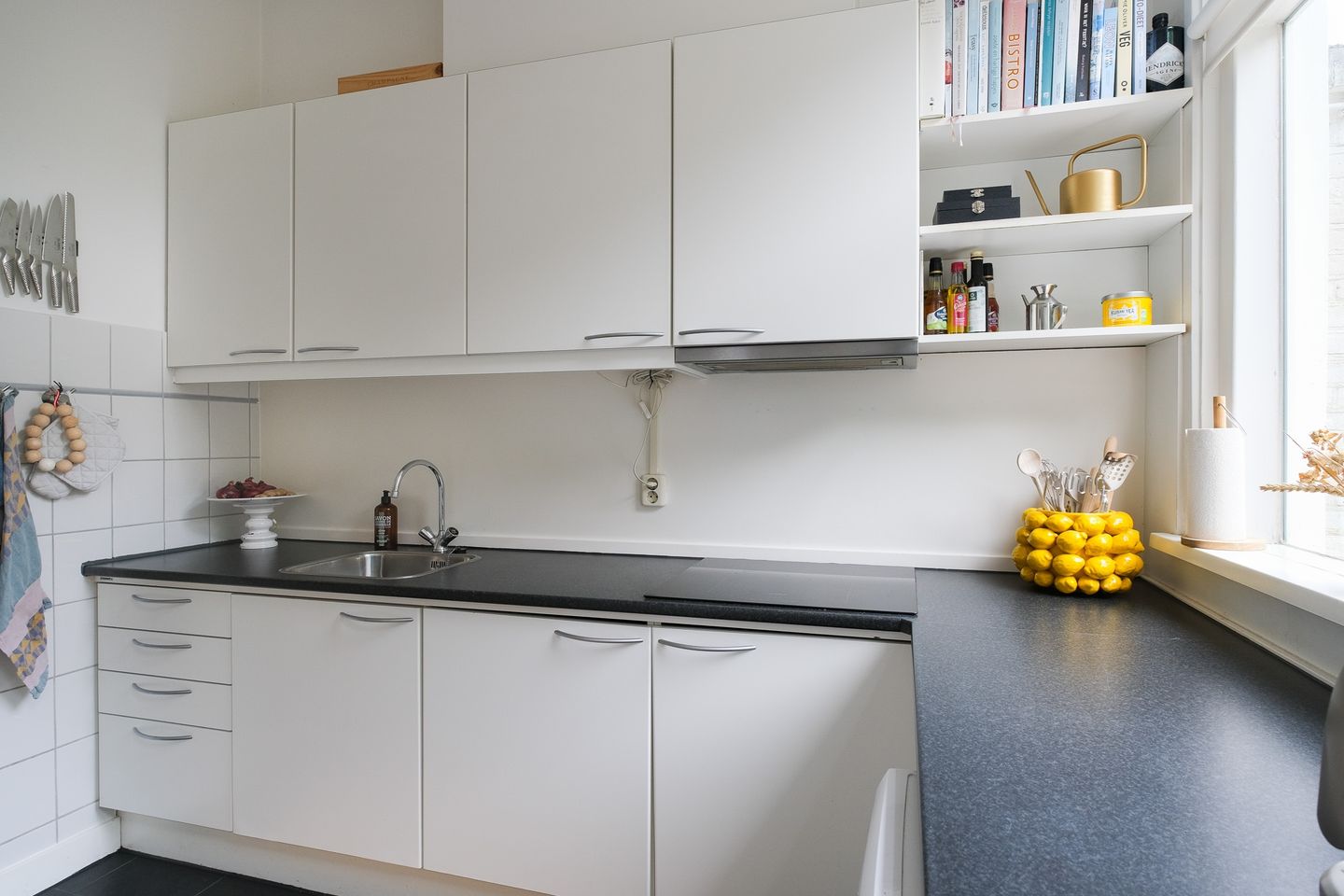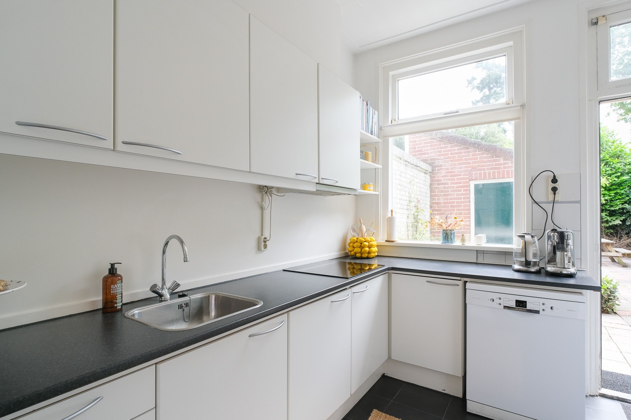 De keuken in L-opstelling is voorzien van inductiekooplaat met afzuigkap en vaatwasser. Aansluitend ligt de diepe achtertuin van ca 18m. op het Zuid-Oosten met een heerlijke besloten plek.