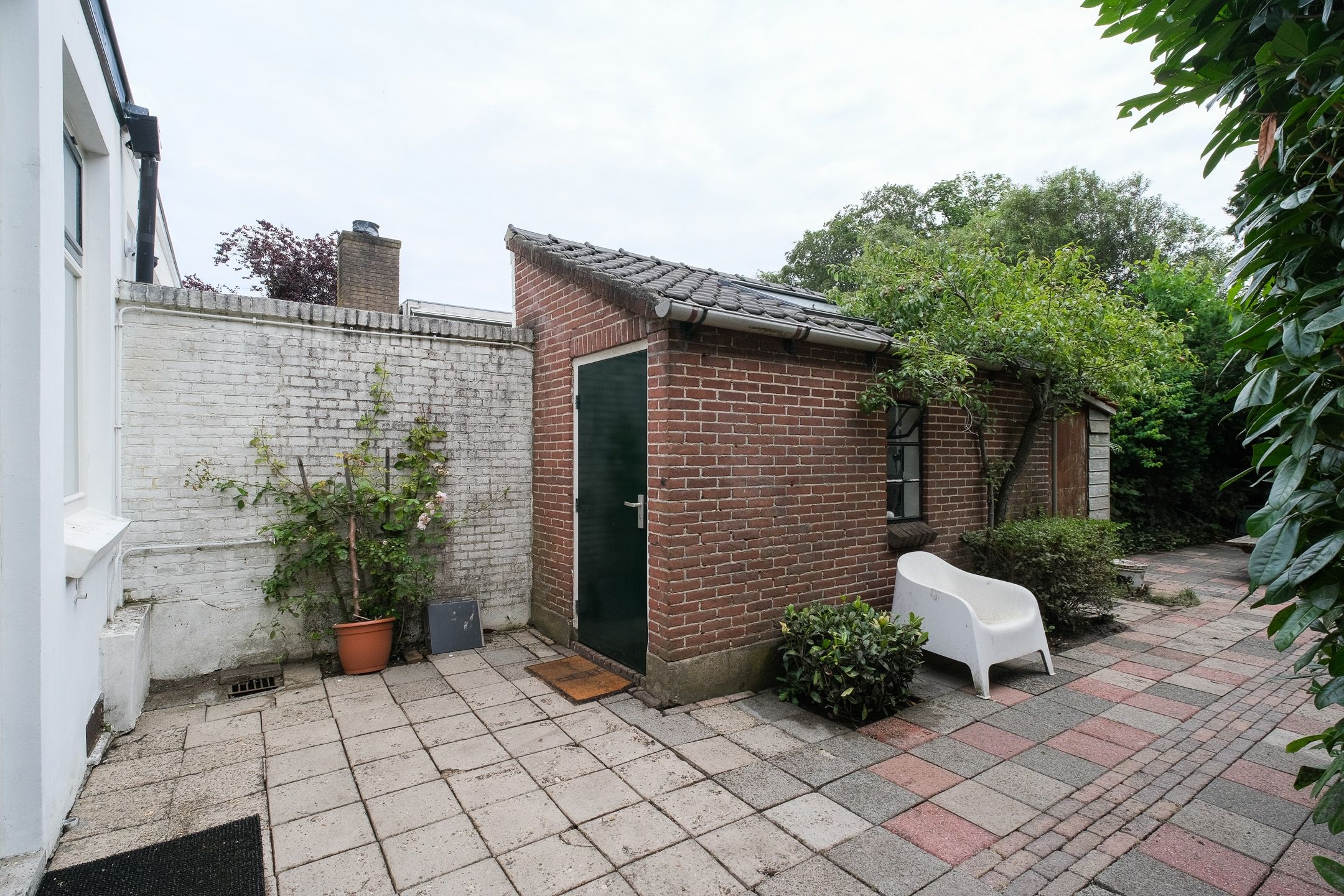 Deze beschikt over een schuur voor tuingereedschap en een schuur van 6,6m2 met tegelvloer, radiator, aansluiting voor de wasmachine en wasdroger en een laag blok met onderkasten. Vanwege de verwarming door de radiator is deze ruimte ook goed te gebruiken als werkruimte.
