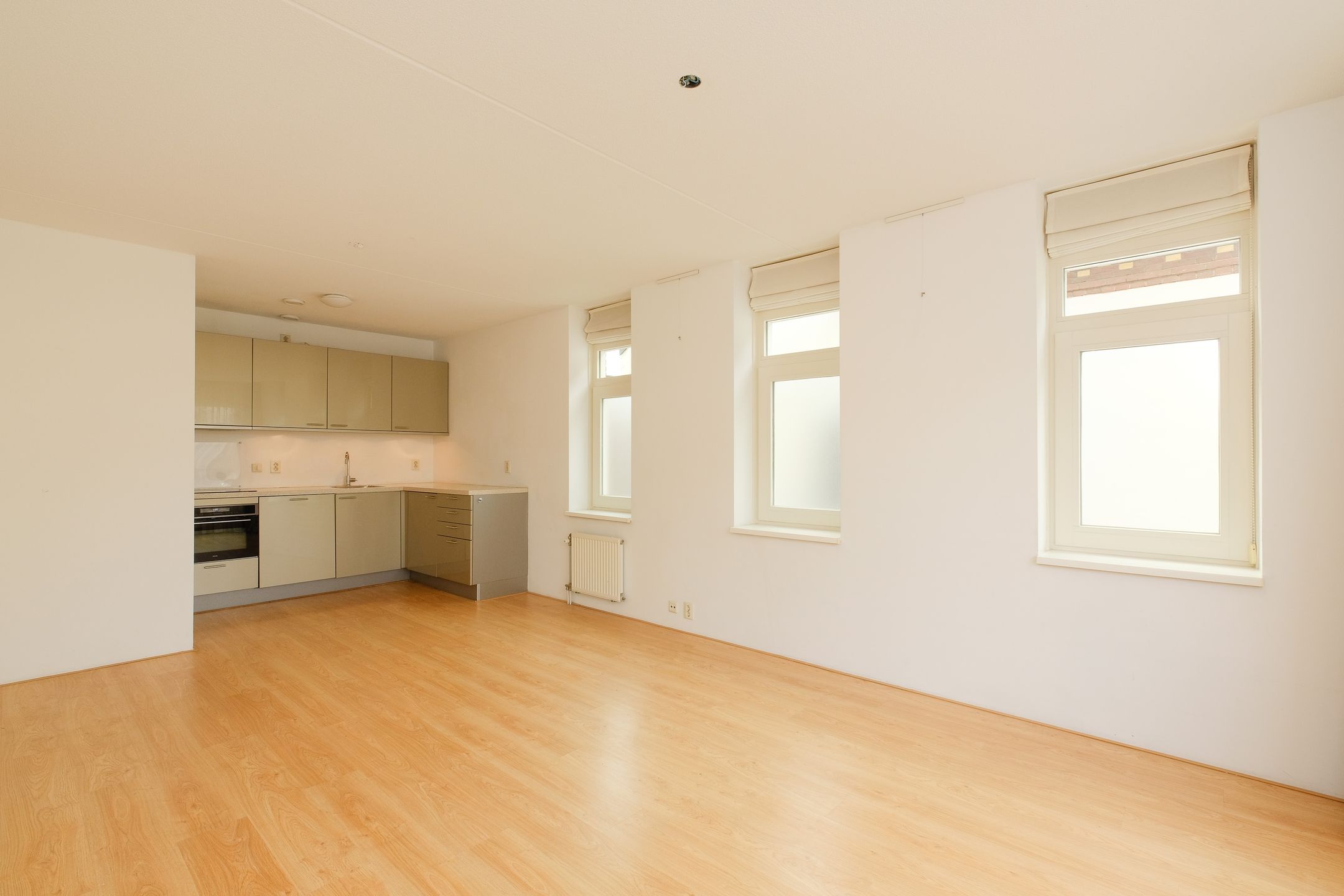 • Een lichte woonkamer met moderne open keuken, compleet met inbouwapparatuur zoals een inductiekookplaat, vaatwasser, oven en koelkast;