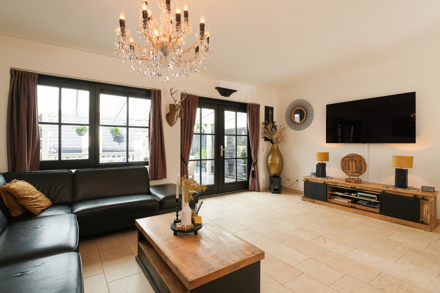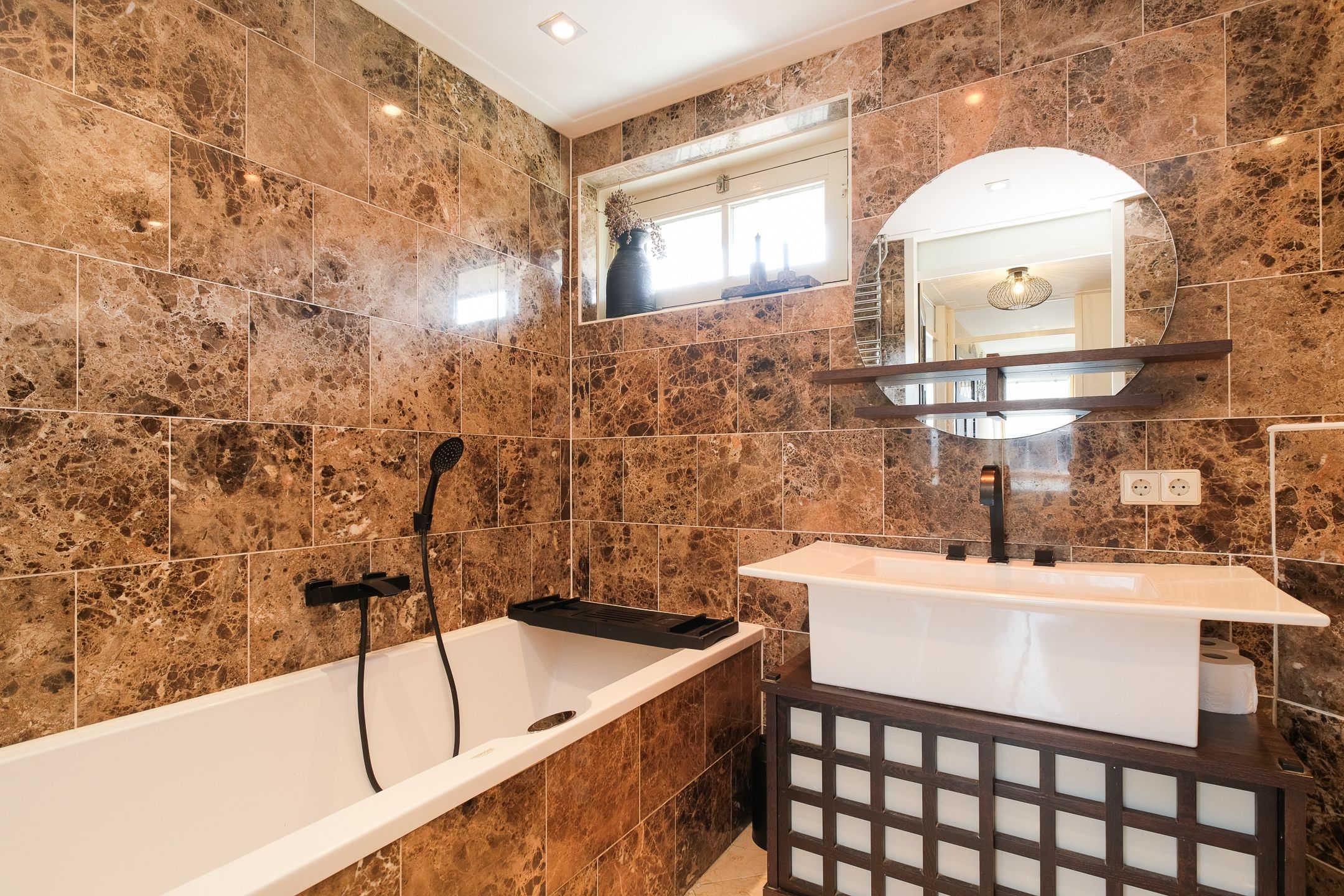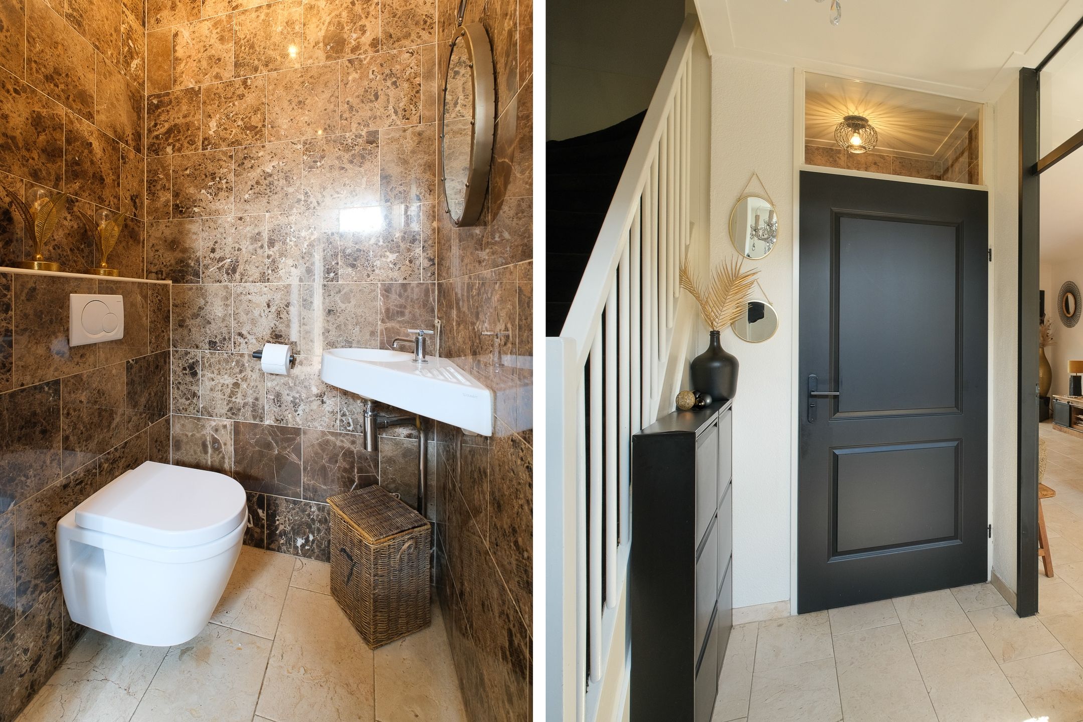 Via de fraai met Portugese steen betegelde voortuin kom je bij de voordeur met entree naar de hal waarin het verzorgd hangend toilet en fontein en de trapopgang. De L-vormige woonkamer is ruim en voorzien van een marmeren vloer met vloerverwarming, openslaande deuren met roedeverdeling naar het achterterras. De fraaie marmeren vloer springt gelijk in het oog. Praktisch is de vaste bergkast onder de trap.