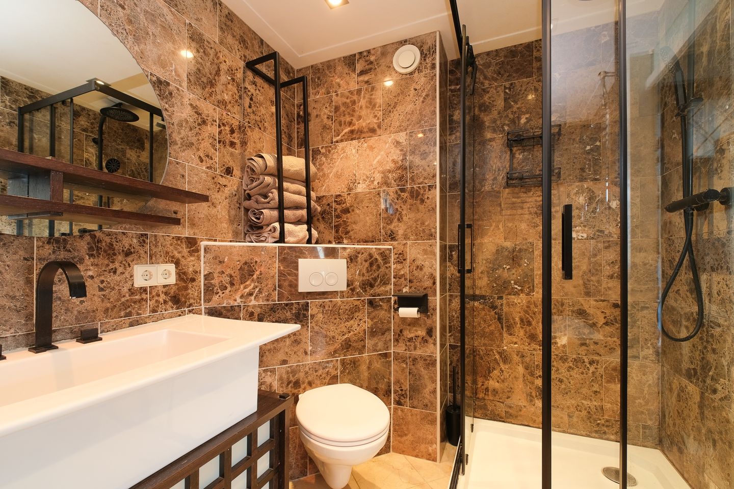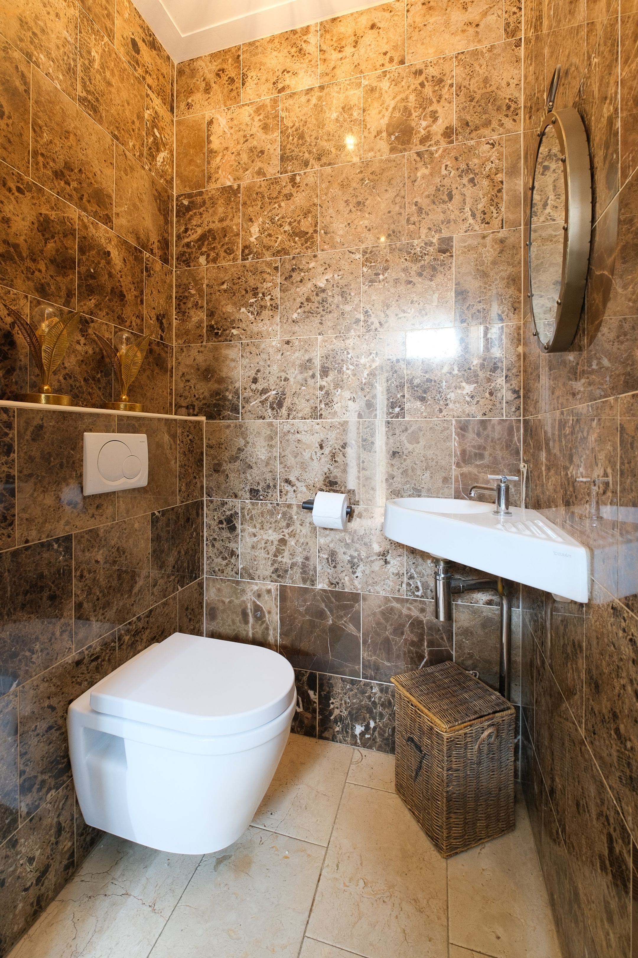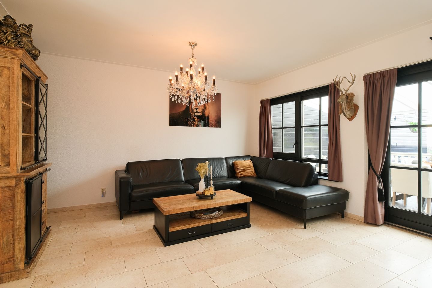 Via de fraai met Portugese steen betegelde voortuin kom je bij de voordeur met entree naar de hal waarin het verzorgd hangend toilet en fontein en de trapopgang. De L-vormige woonkamer is ruim en voorzien van een marmeren vloer met vloerverwarming, openslaande deuren met roedeverdeling naar het achterterras. De fraaie marmeren vloer springt gelijk in het oog. Praktisch is de vaste bergkast onder de trap.