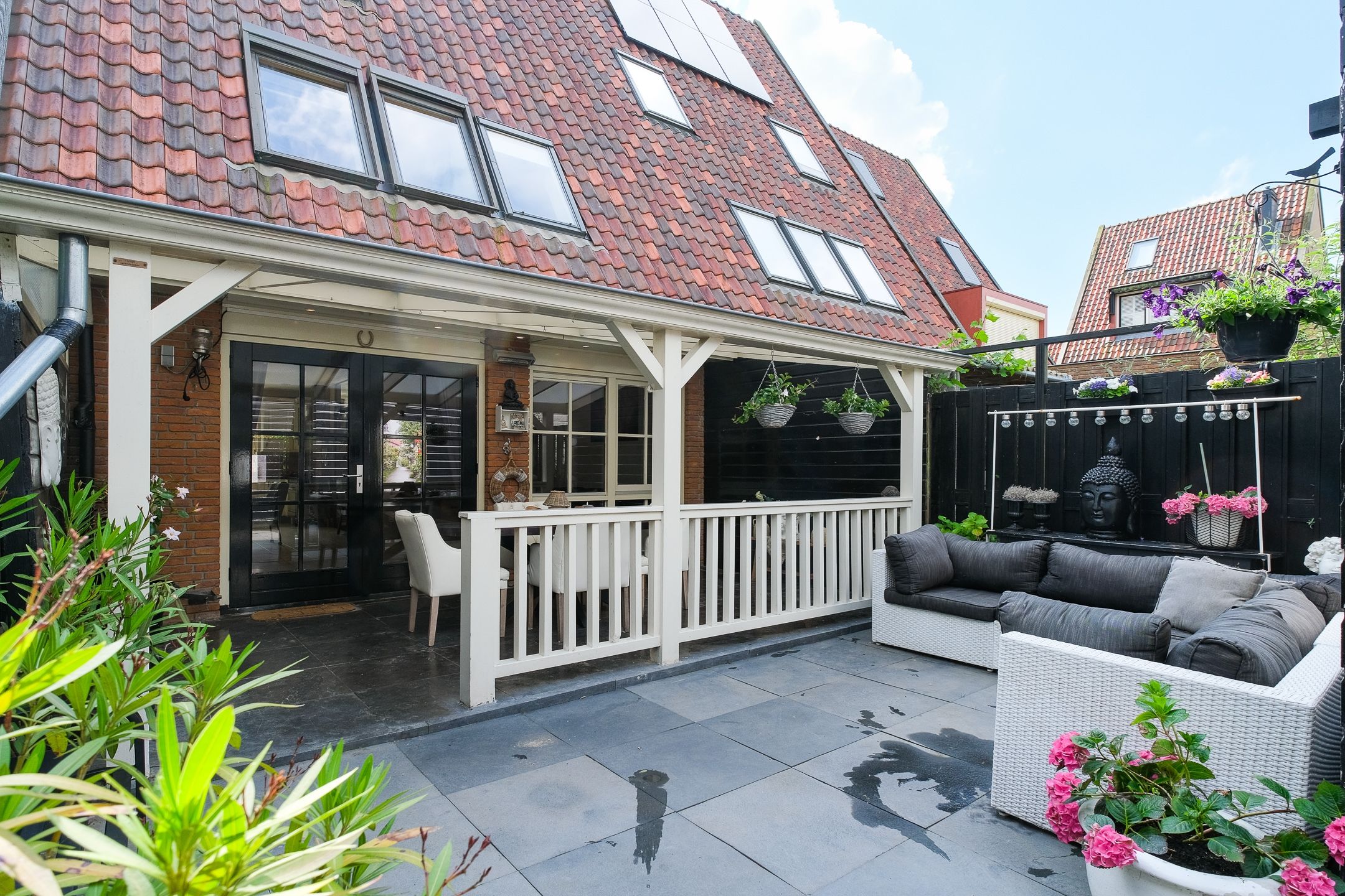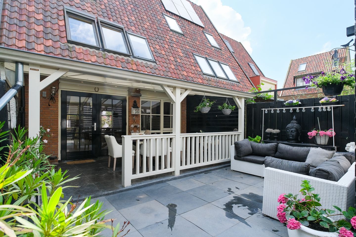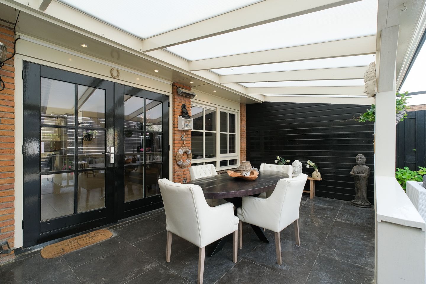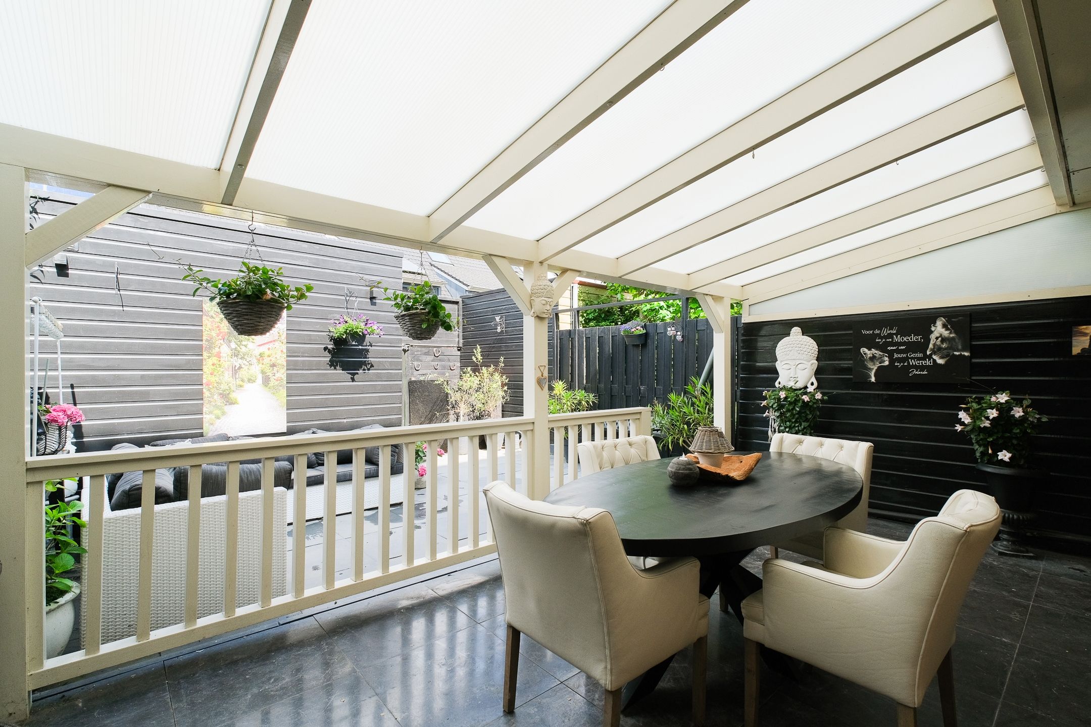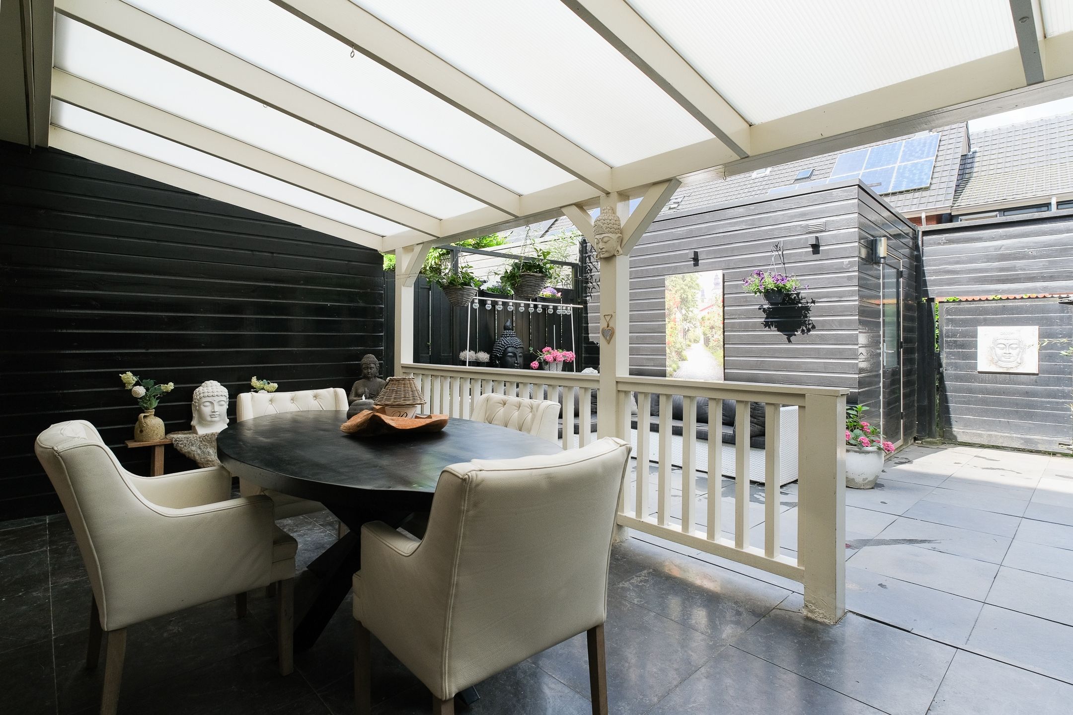 De achtertuin met het terras en overkapping heeft volop privacy bij dit bijzondere woonhuis. De vrijstaande houten berging is keurig afgewerkt met aansluitend een achterom.