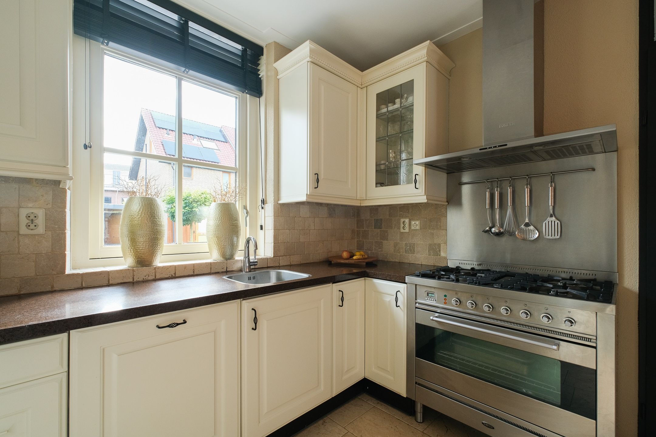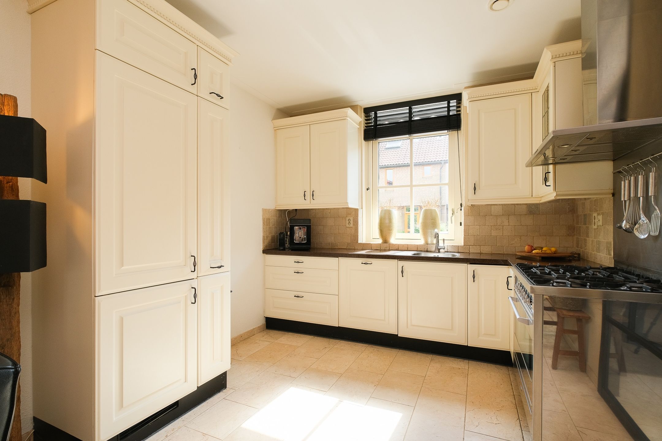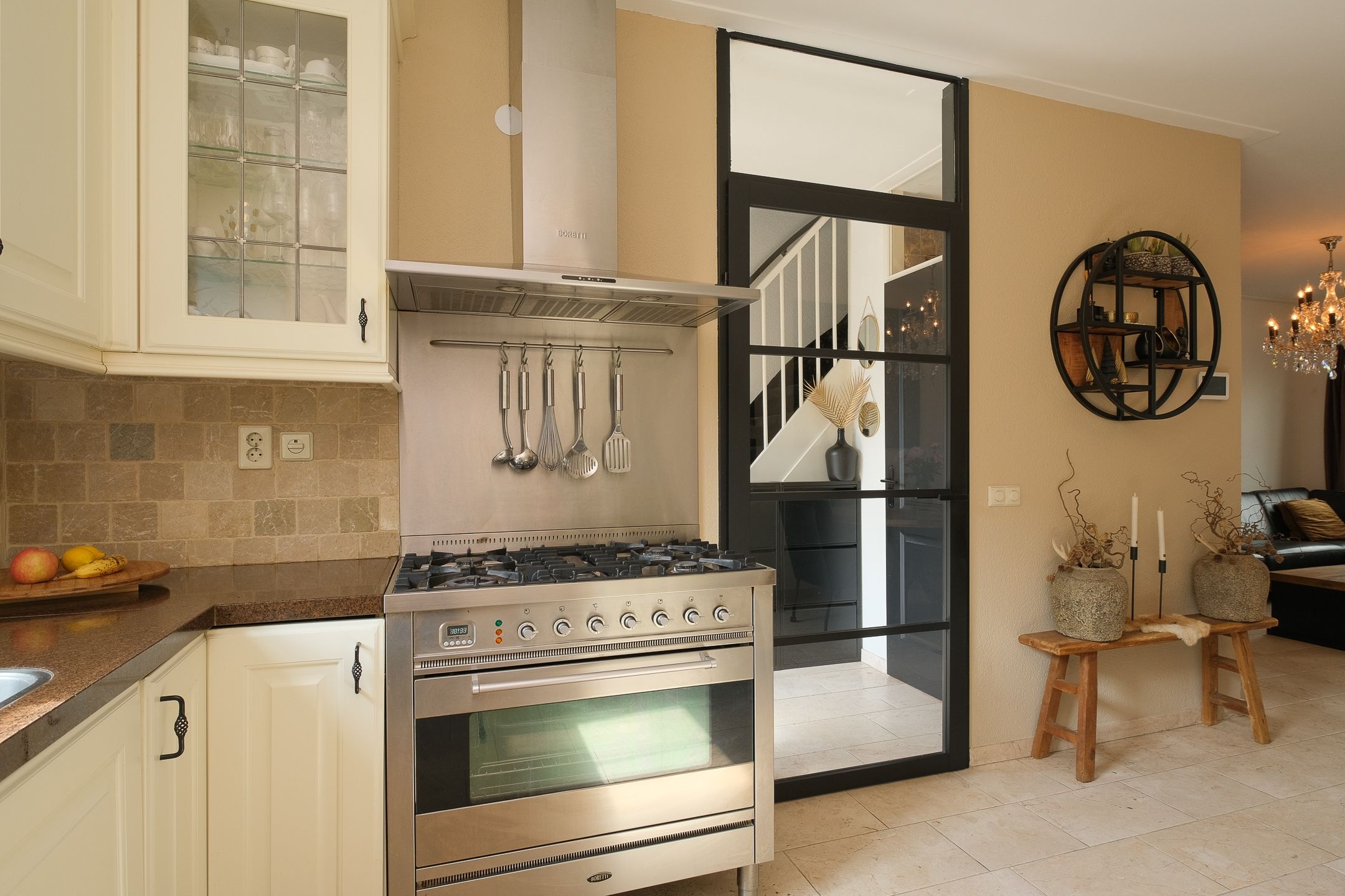 De keuken is open en aan de voorzijde gesitueerd. Het keukenblok is in een U-opstelling geplaatst. Naast veel kast- en werkruimte beschikt deze keuken over diverse inbouw- apparatuur, waaronder ook het type Boretti gasfornuis.
