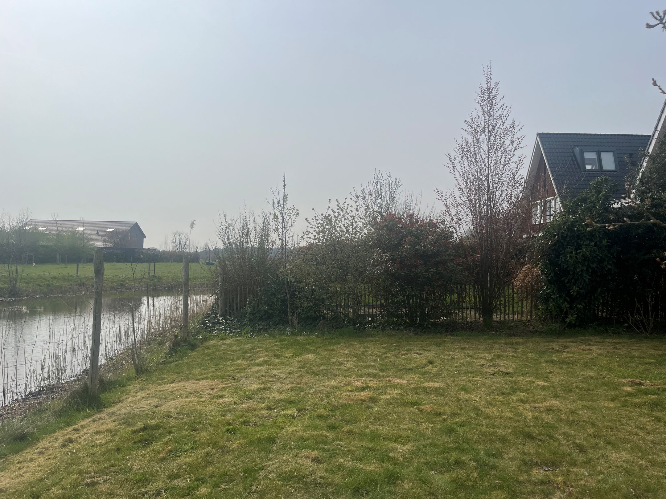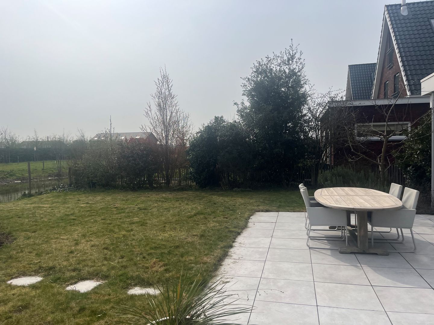 De brede, zonnige achtertuin (gelegen op het zuiden) grenst direct aan het water. Hier geniet je van volledige privacy, vrij uitzicht en een sfeervol terras,