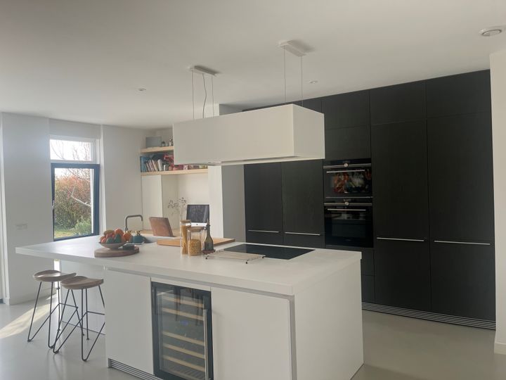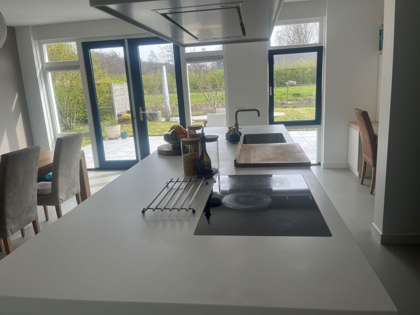 Moderne, volledig uitgeruste open keuken met o.a.: combi-oven, stoomoven, inductiekookplaat, grote afzuigkap, vaatwasser en klimaatkast