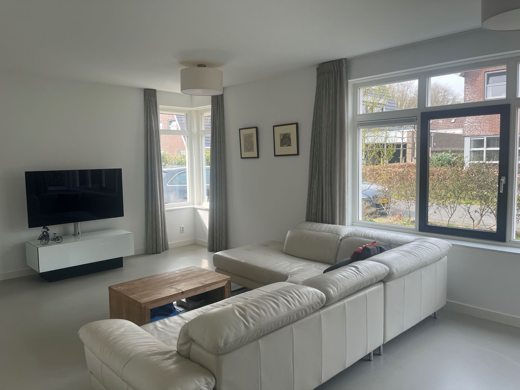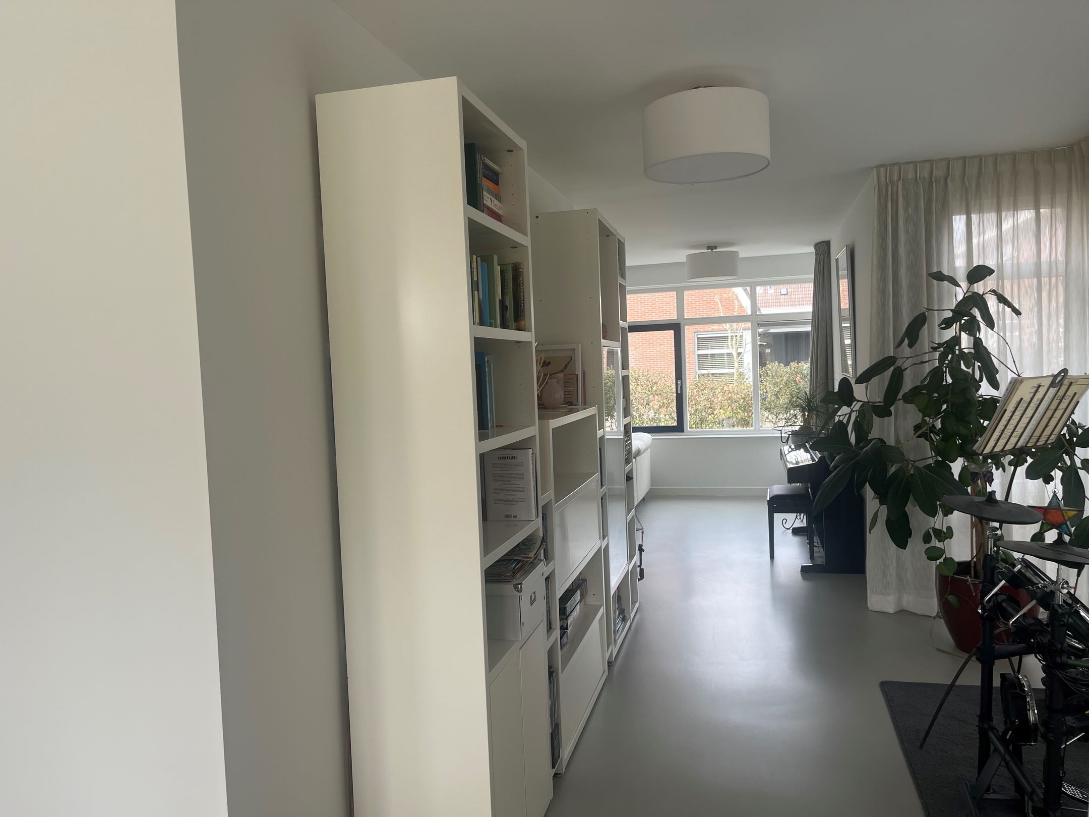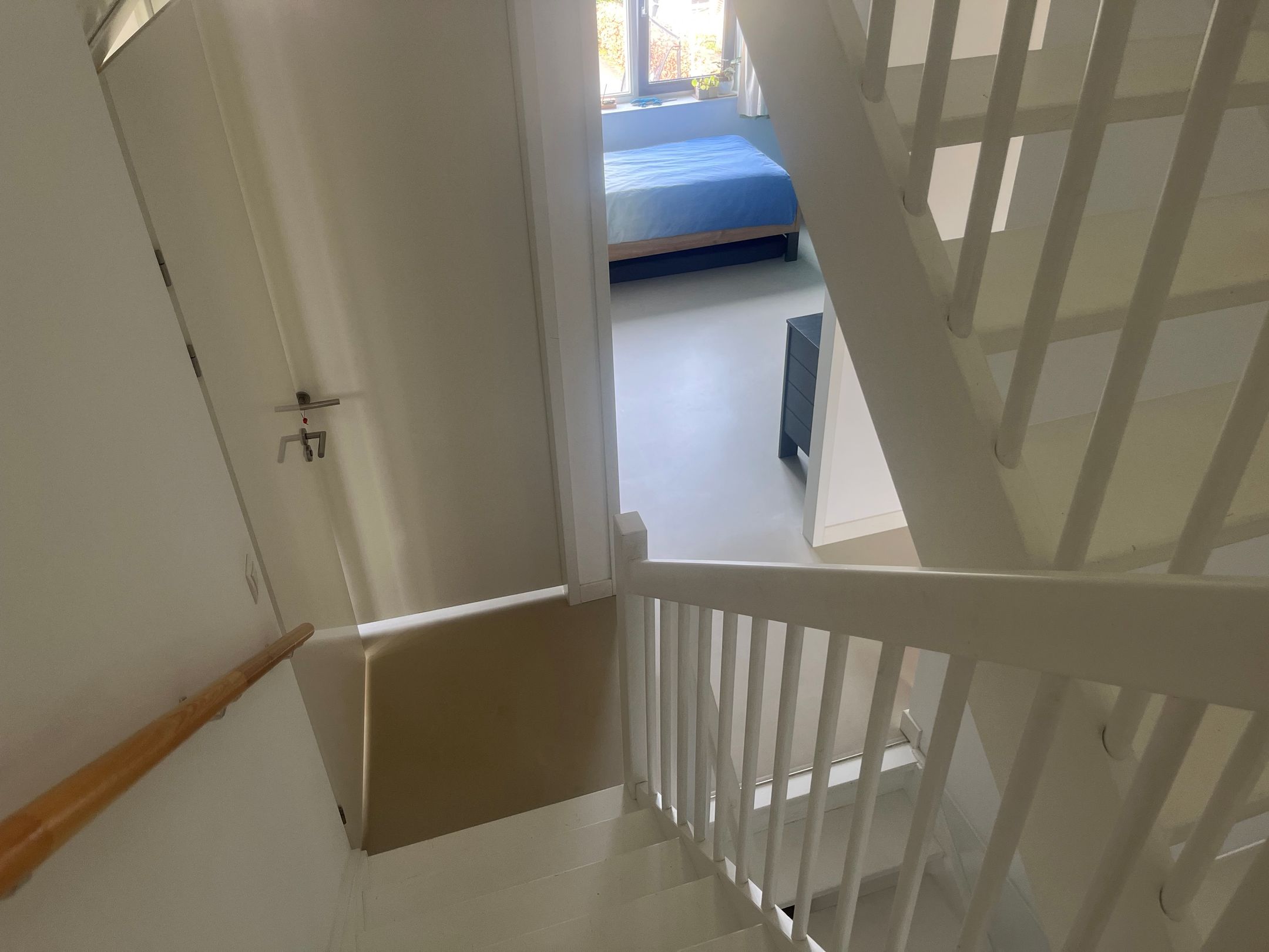 Strakke lichtgrijze gietvloer met comfortabele vloerverwarming op de begane grond, eerste- en tweede verdieping.